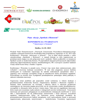 Piąta edycja „Spotkań z Biznesem” KONFERENCJA I WARSZTATY “ Innowacje w biznesie” Siedlce, 14. 03. 2013 Wydział Nauk Ekonomicznych i Prawnych Uniwersytetu Przyrodniczo-Humanistycznego wspólnie z patronem honorowym Wschodnią Izbą Gospodarczą, organizuje 14. 03. 2013 roku Konferencję i Warsztaty „Innowacje w biznesie”. Jest to piąta edycja projektu z cyklu zatytułowanego „Spotkania z Biznesem”, w ramach którego co roku organizowane są przedsięwzięcia mające na celu połączenie teorii i praktyki. Należy podkreślić, że inicjatywa Spotkań wyszła ze środowiska biznesu. W poprzednich edycjach poświęconych odpowiednio społecznej odpowiedzialności biznesu, benchmarkingowi, PR i rozwojowi zasobów ludzkich wzięły udział liczne firmy z Siedlec i regionu. Konferencja i Warsztaty to projekt nowy. Cieszyć więc może duże zainteresowanie, jakie wzbudził i ożywiona dyskusja uczestników. W tym roku pragniemy jeszcze bardziej uatrakcyjnić to wydarzenie zapraszając do udziału znakomitych specjalistów także z zagranicy oraz zwracając szczególną uwagę na interaktywne formy prezentacji zagadnień. Przewidziane są również dwa wystąpienia przedsiębiorców pokazujące dobrą praktykę w zakresie wdrażania innowacji. Tegoroczny temat podobnie jak poprzednie został wyłoniony w trakcie dyskusji z przedstawicielami środowiska biznesu. Organizatorzy Spotkań z Biznesem wspólnie z firmami, które dynamicznie się rozwijają i odnoszą sukces w obecnym gwałtownie zmieniającym się otoczeniu pragną przyczynić się do rozszerzania wiedzy przedsiębiorców, szczególnie w obszarach, które są nowe i mniej znane. Takie jest też zagadnienie innowacji, która często jest rozumiana wąsko jedynie w kategoriach nowości technicznych. Tymczasem innowacja jest procesem polegającym na przekształceniu istniejących możliwości w nowe idee i wprowadzeniu ich do praktycznego zastosowania i może dotyczyć wszystkich aspektów funkcjonowania firmy, od wdrożenia nowej technologii produkcji do przemodelowania kluczowych funkcji zarządzania, czyli wprowadzenia zmian w procesach organizowania, planowania, motywowania i kontrolowania. Uczestnicy tegorocznych Spotkań z Biznesem będą mieli szansę zapoznać się z rozmaitymi aspektami innowacji, od kształtowania twórczego myślenia kadry zarządzającej i pracowników, poprzez formułowanie innowacyjnych strategii do implementacji nowości technicznych. Będą też mieli okazję przekonać się, że często wprowadzenie niewielkiej zmiany może przełożyć się na wielki sukces ekonomiczny i uzyskanie dużej przewagi konkurencyjnej. Program konferencji i warsztatów 9.00 – 9.30 Oficjalne rozpoczęcie konferencji i warsztatów; powitanie uczestników przez Dziekana Wydziału Nauk Ekonomicznych i Prawnych UPH w Siedlcach prof. Jarosława Kardasa oraz Prezesa Wschodniej Izby Gospodarczej Zenona Chodowca (The official opening of the conference and workshops by the Dean of the Faculty of Economic and Legal Sciences – Prof. Jarosław Kardas and the President of the Eastern Chamber of Commerce – Mr Zenon Chodowiec) 9.30 – 10.30 Prof. Michal Mensik (Rector at Moravian University College, Olomuc), “University education as a future job preparation system” (Edukacja uniwersytecka jako system przygotowania do przyszłego zawodu) 10.30 – 11.30 Prof. Vojko Potocan (University in Maribor, Słowenia), “How managers’ personal values influence their attitude towards innovative behaviour” (Jak osobiste wartości menedżerów wpływają na ich stosunek do zachowań innowacyjnych) 11.30 – 12.00 Przerwa cateringowa (Coffee break) 12.00 – 12.30 Katarzyna Stoń (Wydział Innowacyjności, Departament Rozwoju Regionalnego i Funduszy Europejskich, Urząd Marszałkowski Województwa Mazowieckiego), Projekt MSODI – założenia i planowane przedsięwzięcia (Project MSODI – the assumptions and planned actions) 12.30 – 13.30 Dr Hanna Trojanowska (Wydział Nauk Ekonomicznych i Prawnych UPH), Innowacje w marketingu (Innovation in marketing) 13.30 – 13.30 Prof. Gerd Muehlenbeck (University of Applied Science, Nordhausen, Niemcy), The use of a technology called "Laser sintering” (Wykorzystanie technologii “Laser sintering”) 14.30 – 15.00 Przerwa cateringowa (Lunch break) 15.00 – 15.30 Zenon Chodowiec (właściciel firmy Chodrom, prezes Wschodniej Izby Gospodarczej), Paweł Żuk (Prezes Zarządu Centrum Medyczno-Diagnostycznego) Innowacje jako źródło przewagi konkurencyjnej (Innovation as a source of competitive advantage) 15.30 – 16.30 Mgr Maryla Karczewska (Wydział Nauk Ekonomicznych i Prawnych UPH), Jak pobudzić twórcze myślenie? (How should we stimulate creative thinking?) 16.30 – 17.30 Dr Marek Szajczyk (Wydział Nauk Ekonomicznych i Prawnych UPH), Innowacje w „zielonej gospodarce” (Innovation in the green economy) SERDECZNIE ZAPRASZAMY DO UDZIAŁU! Konferencja i Warsztaty odbędą się 14. 03. 2013 w sali „Limes” przy ul. Bema 1, w godz. od 9.00 do 17.00. Warunkiem uczestnictwa w Konferencji i Warsztatach jest zgłoszenie się do organizatorów ([email protected] , tel. 501374362) oraz uiszczenie opłaty konferencyjnej w wysokości 200 zł od firmy (w ramach tej kwoty może uczestniczyć do trzech osób) . Wpłatę prosimy przekazać do dnia 1. 03. 2013 r. na konto Uniwersytetu PrzyrodniczoHumanistycznego: Bank Pekao S.A. I/O Siedlce 19124026851111000036563195 z dopiskiem „BIZNES ETYCZNY 2013” KOMITET ORGANIZACYJNY Dr Grażyna O’Sullivan, tel. 501374362, e-mail: [email protected] Dr Edyta Bombiak, tel. 696146762, e-mail: [email protected] Dr Marek Szajczyk, tel. 600487140 Mgr Dariusz Chilimoniuk, tel. 505037522 Mgr Bartłomiej Suchodloski, tel. 694324546 Patronat medialny
