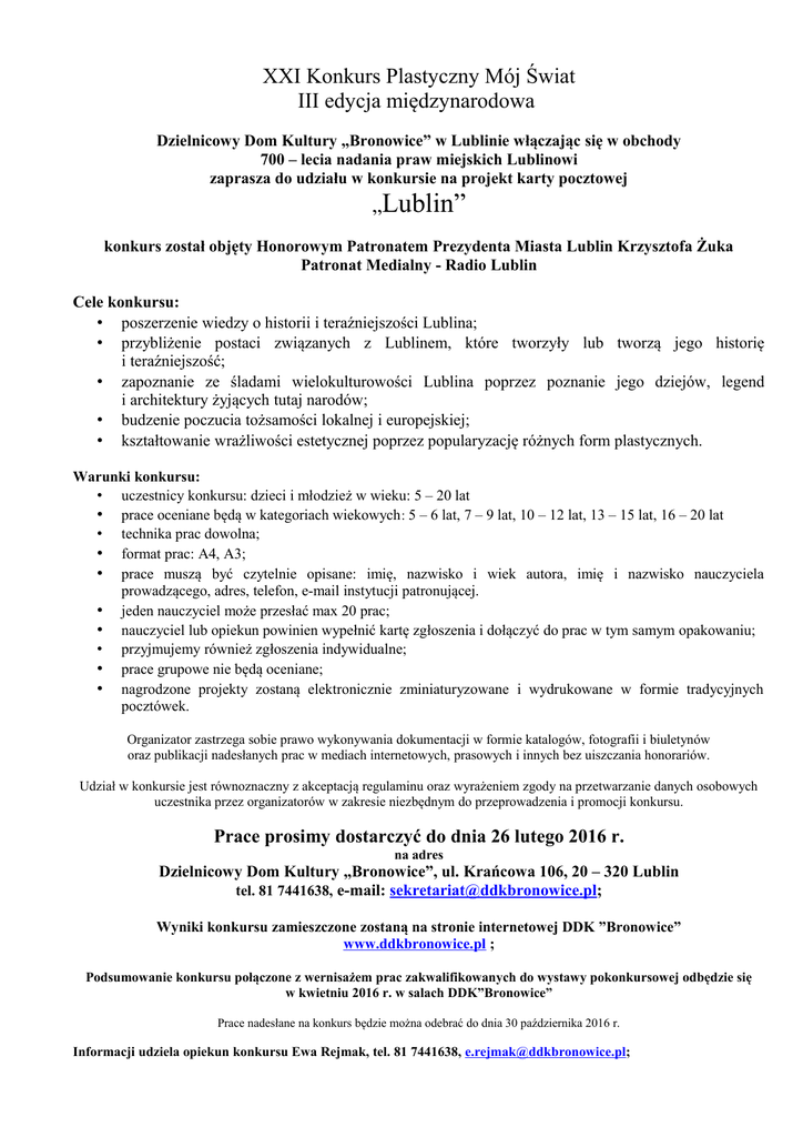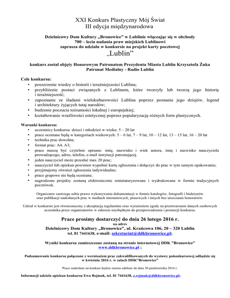 XXI Konkurs Plastyczny Mój Świat III edycja międzynarodowa Dzielnicowy Dom Kultury „Bronowice” w Lublinie włączając się w obchody 700 – lecia nadania praw miejskich Lublinowi zaprasza do udziału w konkursie na projekt karty pocztowej „Lublin” konkurs został objęty Honorowym Patronatem Prezydenta Miasta Lublin Krzysztofa Żuka Patronat Medialny - Radio Lublin Cele konkursu: • poszerzenie wiedzy o historii i teraźniejszości Lublina; • przybliżenie postaci związanych z Lublinem, które tworzyły lub tworzą jego historię i teraźniejszość; • zapoznanie ze śladami wielokulturowości Lublina poprzez poznanie jego dziejów, legend i architektury żyjących tutaj narodów; • budzenie poczucia tożsamości lokalnej i europejskiej; • kształtowanie wrażliwości estetycznej poprzez popularyzację różnych form plastycznych. Warunki konkursu: • uczestnicy konkursu: dzieci i młodzież w wieku: 5 – 20 lat • prace oceniane będą w kategoriach wiekowych : 5 – 6 lat, 7 – 9 lat, 10 – 12 lat, 13 – 15 lat, 16 – 20 lat • technika prac dowolna; • format prac: A4, A3; • prace muszą być czytelnie opisane: imię, nazwisko i wiek autora, imię i nazwisko nauczyciela prowadzącego, adres, telefon, e-mail instytucji patronującej. • jeden nauczyciel może przesłać max 20 prac; • nauczyciel lub opiekun powinien wypełnić kartę zgłoszenia i dołączyć do prac w tym samym opakowaniu; • przyjmujemy również zgłoszenia indywidualne; • prace grupowe nie będą oceniane; • nagrodzone projekty zostaną elektronicznie zminiaturyzowane i wydrukowane w formie tradycyjnych pocztówek. Organizator zastrzega sobie prawo wykonywania dokumentacji w formie katalogów, fotografii i biuletynów oraz publikacji nadesłanych prac w mediach internetowych, prasowych i innych bez uiszczania honorariów. Udział w konkursie jest równoznaczny z akceptacją regulaminu oraz wyrażeniem zgody na przetwarzanie danych osobowych uczestnika przez organizatorów w zakresie niezbędnym do przeprowadzenia i promocji konkursu. Prace prosimy dostarczyć do dnia 26 lutego 2016 r. na adres Dzielnicowy Dom Kultury „Bronowice”, ul. Krańcowa 106, 20 – 320 Lublin tel. 81 7441638, e-mail: [email protected]; Wyniki konkursu zamieszczone zostaną na stronie internetowej DDK ”Bronowice” www.ddkbronowice.pl ; Podsumowanie konkursu połączone z wernisażem prac zakwalifikowanych do wystawy pokonkursowej odbędzie się w kwietniu 2016 r. w salach DDK”Bronowice” Prace nadesłane na konkurs będzie można odebrać do dnia 30 października 2016 r. Informacji udziela opiekun konkursu Ewa Rejmak, tel. 81 7441638, [email protected]; XXI Konkurs Plastyczny „Mój Świat” III edycja międzynarodowa „Lublin” projekt karty pocztowej Karta zgłoszenia - zgłoszenie grupowe Prosimy wypełnić drukowanymi literami NAZWA I ADRES PLACÓWKI …………………………………………………………………………………………….............................…………………… telefon, e – mail …………………………………………………………………………………………................…………………… IMIĘ I NAZWISKO, TELEFON NAUCZYCIELA/INSTRUKTORA ……………………………………………………………………………………………................………………… Lp. Imię i nazwisko Uczestnika Wiek Tytuł pracy 1. 2. 3. 4. 5. 6. 7. 8. 9. 10. ………………………................. (miejscowość i data) …………………………………. (podpis nauczyciela lub instruktora) Udział w konkursie jest równoznaczny z akceptacją regulaminu oraz wyrażeniem zgody na przetwarzanie danych osobowych uczestnika przez organizatorów w zakresie niezbędnym do przeprowadzenia i promocji konkursu. XXI Konkurs Plastyczny „Mój Świat” III edycja międzynarodowa „Lublin” projekt karty pocztowej Karta zgłoszenia - zgłoszenie indywidualne Prosimy wypełnić drukowanymi literami Imię i nazwisko: …………………….................…………………………………………………………………………………………………….. Adres: …………………………………………………...............………………………………………………………………. ……………………………………………………………………………………………………..............………………………. telefon, e–mail ………………………………………………………………………………………………..............……………….. tytuł pracy :……...............……………………………………………………………………………………………. ………………………................. (miejscowość i data) …………………………………. (podpis rodzica/opiekuna) Udział w konkursie jest równoznaczny z akceptacją regulaminu oraz wyrażeniem zgody na przetwarzanie danych osobowych uczestnika przez organizatorów w zakresie niezbędnym do przeprowadzenia i promocji konkursu.