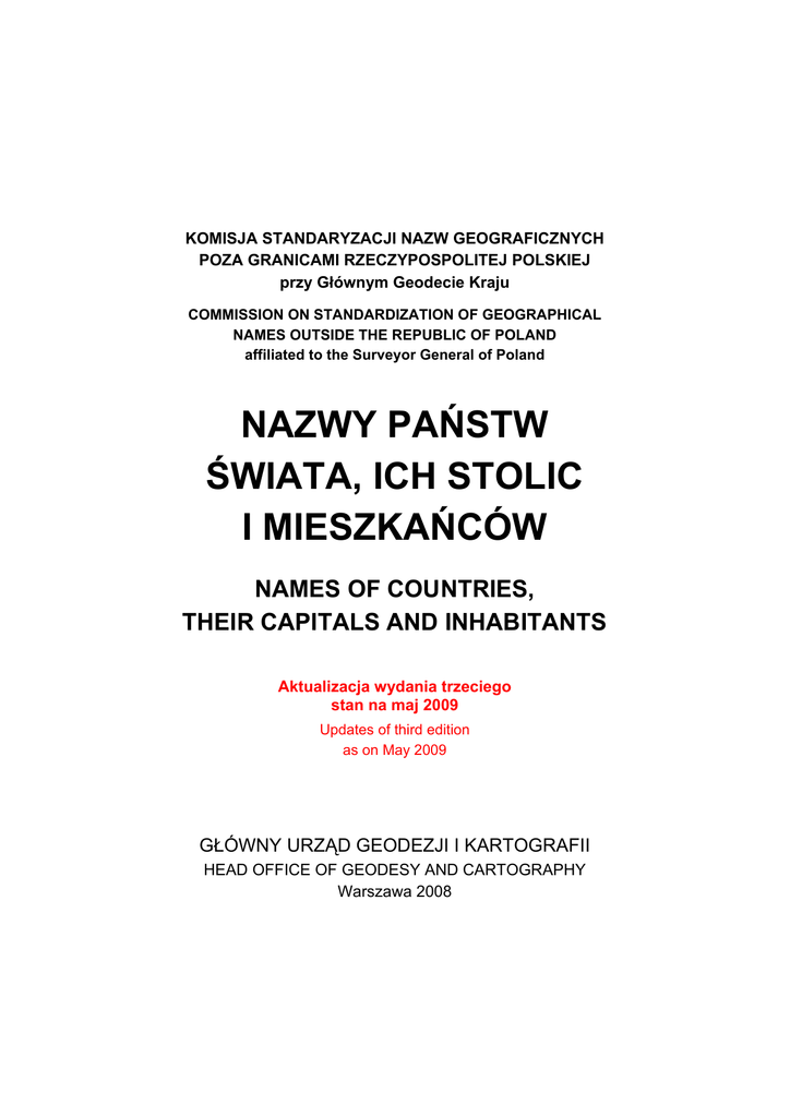 KOMISJA STANDARYZACJI NAZW GEOGRAFICZNYCH POZA GRANICAMI RZECZYPOSPOLITEJ POLSKIEJ przy Głównym Geodecie Kraju COMMISSION ON STANDARDIZATION OF GEOGRAPHICAL NAMES OUTSIDE THE REPUBLIC OF POLAND affiliated to the Surveyor General of Poland NAZWY PAŃSTW ŚWIATA, ICH STOLIC I MIESZKAŃCÓW NAMES OF COUNTRIES, THEIR CAPITALS AND INHABITANTS Aktualizacja wydania trzeciego stan na maj 2009 Updates of third edition as on May 2009 GŁÓWNY URZĄD GEODEZJI I KARTOGRAFII HEAD OFFICE OF GEODESY AND CARTOGRAPHY Warszawa 2008 1 W 2007 roku Komisja Standaryzacji Nazw Geograficznych poza Granicami Polski, realizując należący do niej obowiązek publikacji oficjalnych wykazów polskiego nazewnictwa geograficznego, opublikowała trzecie wydanie Nazw państw świata, ich stolic i mieszkańców. Zmiany w nazewnictwie zachodzą cały czas, stąd konieczność sukcesywnej aktualizacji zawartych w wykazie informacji, czemu służy niniejsza broszura. Zawiera ona wyłącznie te hasła, w których zaszły zmiany względem trzeciego wydania Nazw państw świata, ich stolic i mieszkańców. Fragmenty dodane i poprawione zaznaczono kolorem czerwonym. Zmiany, to głównie dodane nazwy państw lub terytoriów w kolejnych językach urzędowych. Kilka zmian to korekty zapisu nazwy podanego w trzecim wydaniu wykazu. Zmieniono również polskie nazwy niektórych języków. Pojawiły się hasła dotyczące kolejnych terytoriów autonomicznych. W związku z uznaniem przez Polskę niepodległości Kosowa, jego hasło przeniesiono do części „Państwa niepodległe”. Publikacja uwzględnia uchwały Komisji podjęte do dnia 6 maja 2009 r. 2 Przyjęte zasady transliteracji na alfabet łaciński z języków posługujących się innymi formami zapisu hindi (Indie) – system ISO 15919:2001; hindustani (Fidżi) – system ISO 15919:2001 dla języka hindi; serbski (Bośnia i Hercegowina, Kosowo, Serbia) – zapis w alfabecie łacińskim języka serbskiego (srpska latinica); Rules applied in romanization from languages using other forms of writing Hindi (India) – the ISO 15919:2001 system; Hindustani (Fiji) – the ISO 15919:2001 system for Hindi; Serbian (Bosnia and Herzegovina, Kosovo, Serbia) – Serbian Latin script (srpska latinica); 3 Objaśnienie skrótów i znaków ang. arab. fr. hiszp. nid. niem. pol. port. ros. Języki angielski arabski francuski hiszpański niderlandzki niemiecki polski portugalski rosyjski Explanation of abbreviations and symbols Languages ang. arab. fr. hiszp. nid. niem. pol. port. ros. English Arabic French Spanish Dutch German Polish Portuguese Russian 4 Państwa Countries Albania Europa pol. Albania, D. Albanii, Mc. Albanii; Republika Albanii albański Shqipëri; Shqipëria; Republika e Shqipërisë przym. albański obyw. Albańczyk, Albanka, Albańczycy stol. Tirana, D. Tirany, Mc. Tiranie – Tiranë; Tirana przym. tirański mieszk. tirańczyk, tiranka, tirańczycy Belgia Europa pol. Belgia, D. Belgii, Mc. Belgii; Królestwo Belgii fr. (la) Belgique; (le) Royaume de Belgique // nid. België; (het) Koninkrijk België // niem. Belgien; (das) Königreich Belgien przym. belgijski obyw. Belg, Belgijka, Belgowie stol. Bruksela, D. Brukseli, Mc. Brukseli – Bruxelles ( fr.) // Brussel (nid.) // Brüssel (niem.) przym. brukselski mieszk. brukselczyk, brukselka, brukselczycy Boliwia Ameryka Południowa pol. Boliwia, D. Boliwii, Mc. Boliwii; Republika Boliwii* hiszp. Bolivia; Estado Plurinacional de Bolivia przym. boliwijski obyw. Boliwijczyk, Boliwijka, Boliwijczycy stol. Sucre [wym. Sukre] ndm.; La Paz (siedziba rządu i parlamentu) [wym. La Pas] ndm. __________ * Nowa oficjalna nazwa państwa w języku polskim nie została jeszcze ustalona. Czarnogóra pol. Czarnogóra, D. Czarnogóry, Mc. Czarnogórze czarnogórski Crna Gora przym. czarnogórski Europa 5 obyw. Czarnogórzanin, Czarnogórzanka, Czarnogórzanie stol. Podgorica, D. Podgoricy, Mc. Podgoricy przym. podgoricki mieszk. podgoriczanin, podgoriczanka, podgoricznie Fidżi Australia i Oceania pol. Fidżi ndm.; Republika Wysp Fidżi ang. Fiji; (the) Republic of the Fiji Islands // fidżi Viti; Matanitu Tu-Vaka-i-koya ko Viti // hindustani trl. Fijī, trb. Fidźi; trl. Fijī Dvīp-samūh Ga•arājya, trb. Fidźi Dwip-samuh Ganaradźja przym. fidżyjski obyw. Fidżyjczyk, Fidżyjka, Fidżyjczycy stol. Suva, D. Suvy, Mc. Suvie – Suva (ang., fidżi) // trl. Suva, trb. Suwa (hindustani) przym. suwański mieszk. suwańczyk, suwanka, suwańczycy Grecja Europa pol. Grecja, D. Grecji, Mc. Grecji; Republika Grecka grecki trl. Ellás, trb. Elas; trl. Ellīnik¸ Dīmokratía; trb. Eliniki Dimokratia przym. grecki obyw. Grek, Greczynka, Grecy stol. Ateny, D. Aten, Mc. Atenach – trl. Ath¸na, trb. Atina przym. ateński mieszk. ateńczyk, atenka, ateńczycy Holandia Europa pol. Holandia, D. Holandii, Mc. Holandii; Królestwo Niderlandów nid. Nederland; (het) Koninkrijk der Nederlanden przym. holenderski, niderlandzki obyw. Holender, Holenderka, Holendrzy stol. Amsterdam, D. Amsterdamu, Mc. Amsterdamie – Amsterdam; Haga (siedziba rządu), D. Hagi, Mc. Hadze – Den Haag, ’s-Gravenhage przym. amsterdamski; haski mieszk. amsterdamczyk, amsterdamka, amsterdamczycy; hażanin, hażanka, hażanie 6 Irak Azja pol. Irak, D. Iraku, Mc. Iraku; Republika Iraku arab. trl. Al-‘Irāq, trb. Al-Irak; trl. Jumhūriyyat al-‘Irāq, trb. Dżumhurijjat al-Irak // kurdyjski trl. ’Êraq, trb. Irak; trl. Komarî ’Êraq, trb. Komari Irak przym. iracki obyw. Irakijczyk, Irakijka, Irakijczycy stol. Bagdad, D. Bagdadu, Mc. Bagdadzie – trl. Baghdād, trb. Baghdad (arab.) // trl. Bexda, trb. Beghda (kurdyjski) przym. bagdadzki mieszk. bagdadczyk, bagdadka, bagdadczycy Kosowo Europa pol. Kosowo, D. Kosowa, Mc. Kosowie; Republika Kosowa albański Kosovë; Kosova; Republika e Kosovës // serbski Kosovo; Republika Kosova przym. kosowski mieszk. Kosowianin, Kosowianka, Kosowianie stol. Prisztina, D. Prisztiny, Mc. Prisztinie – Prishtinë; Prishtina (albański) // P