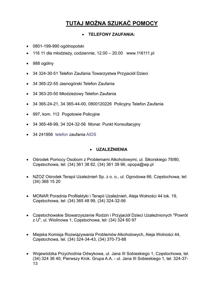 TUTAJ MOŻNA SZUKAĆ POMOCY TELEFONY ZAUFANIA: 0801-199-990 ogólnopolski 116 11 dla młodzieży, codziennie, 12.00 – 20.00 www.116111.pl 988 ogólny 34 324-30-51 Telefon Zaufania Towarzystwa Przyjaciół Dzieci 34 365-22-55 Jasnogórski Telefon Zaufania 34 363-20-50 Młodzieżowy Telefon Zaufania 34 365-24-21, 34 365-44-00, 0800120226 Policyjny Telefon Zaufania 997, kom. 112 Pogotowie Policyjne 34 365-48-99, 34 324-32-56 Monar. Punkt Konsultacyjny 34 241956 telefon zaufania AIDS UZALEŻNIENIA Ośrodek Pomocy Osobom z Problemami Alkoholowymi, ul. Sikorskiego 78/80, Częstochowa, tel: (34) 361 38 82, (34) 361 39 96, [email protected] NZOZ Ośrodek Terapii Uzależnień Sp. z o. o., ul. Ogrodowa 66, Częstochowa, tel: (34) 368 15 20 MONAR Poradnia Profilaktyki i Terapii Uzależnień, Aleja Wolności 44 lok. 19, Częstochowa, tel: (34) 365 48 99, (34) 324-32-56 Częstochowskie Stowarzyszenie Rodzin i Przyjaciół Dzieci Uzależnionych "Powrót z U", ul. Wiolinowa 1, Częstochowa, tel: (34) 324 60 97 Miejska Komisja Rozwiązywania Problemów Alkoholowych, Aleja Wolności 44, Częstochowa, tel. (34) 324-34-43, (34) 370-73-88 Wojewódzka Przychodnia Odwykowa, ul. Jana III Sobieskiego 1, Częstochowa, tel. (34) 324 36 40; Pierwszy Krok. Grupa A.A. - ul. Jana III Sobieskiego 1, tel. 324-3713 Intergrupa AA Częstochowa, ul. Krakowska 15/17, telefon 34 368 11 90 , e - mail: [email protected] www: www.aa.czest.pl http://www.anonimowi-alkoholicy.org.pl/ Niepubliczny Zakład Opieki Zdrowotnej Ośrodek Terapii Uzależnień i Współuzależnień, tel: 34 367 50 37, ul. Barlickiego 2 alkohol: www.parpa.pl Ogólnopolskie Pogotowie Makowe 0-801 10 96 96 Ogólnopolska Infolinia Narkotykowa 16:00-21:00, 0-801 199 990 Częstochowskie Towarzystwo Profilaktyki Społecznej Ośrodek RehabilitacyjnoWychowawczy dla Młodzieży Uzależnionej, ul. Rejtana 7b. Częstochowa, 34 36397-54 www. narkomania.org.pl 0801109696 infolinia pogotowia makowego "Pomarańczowa Linia" - system pomocy rodzicom, których dzieci upijają się, Infolinia czynna jest od poniedziałku do piątku w godz. 14.00 do 20.00 (telefon informacyjno-interwencyjny) 0 801 14 00 68, e-mail: [email protected] http://www.prom.org.pl PRZEMOC Niebieska Linia Punkt Konsultacyjny dla Ofiar Przemocy w Rodzinie 0 800 163 102 (dla dzwoniących osób telefon jest bezpłatny) czynny codziennie w godz. 16 001900, porady prawne w poniedziałki i czwartki; [email protected] Punkt konsultacyjny dla ofiar przemocy w Częstochowie, ul. Sikorskiego 78/80, tel. 0 34 3 66 48 89 Ośrodek Interwencji Kryzysowej, ul. Rejtana 7 B, Częstochowa, 34 366 32 31, 34 366 31 21, czynne całą dobę POMOC RODZINIE I DZIECKU Miejski Ośrodek Pomocy Społecznej Dział Pomocy Dziecku, Rodzinie oraz Pomocy Instytucjonalnej - ul. Niepodległości 20/22; tel. 343631819 wew. 22, 343710282 wew. 22, poniedziałek - piątek od 7.30-15.00. KMP w Częsztochowie, Biuro Porad Obywatelskich, Terenowy Komitet Ochrony Praw Dziecka, Częstochowa, ul. Al. Pokoju 9, 34 365 3044 Telefon Zaufania Towarzystwa Przyjaciół Dzieci - tel. 324-30-51, ul. Jasnogórska 26, Częstochowa, 34 3682182 Powiatowe Centrum Pomocy Rodzinie, Częstochowa, ul. Tkacka 3/5 34 322 92 06; 322 92 05 Terenowy Komitet Ochrony Praw Dziecka - ul. Śląska 22, 34 365-30-44 Pogotowie Opiekuńcze, Częstochowa, ul. Legionów 58, 34-361-92-69 ZDROWIE PSYCHICZNE – OPIEKA NAD MŁODZIEŻĄ Specjalistyczno-Diagnostyczny Ośrodek Zdrowia, Częstochowa, Sobieskiego 84, 34 324 41 55 Wojewódzki Zakład Opieki Zdrowotnej nad Matką, Dzieckiem i Młodzieżą, Częstochowa, Sobieskiego 7A, 34 360 61 32 Poradnia zdrowia psychicznego dla dzieci i młodzieży ul. Sobieskiego 7a, 34 249539 Centrum Rehabilitacji Osób z Zaburzeniami Psychicznymi, Częstochowa, ul. Focha 71 a, 34 3664320 Niepubliczny Zakład Opieki Zdrowotnej Centrum Zdrowia Psychicznego "EgoMedica" Częstochowa, Orkana 139B, 34 366 28 81 Stowarzyszenie Pomocy Osobom z Zaburzeniami Psychicznymi i Ich Rodzinom "Yava" ul. Lakowa 101; Częstochowa, 34 363-07-47 Stowarzyszenie na rzecz dzieci niepełnosprawnych i autystycznych „PIĘKNY UMYSŁ", ul. Kukuczki 6/37, Częstochowa, 602 220 036 Częstochowskie Stowarzyszenie Pomocy Osobom z Problemami Autyzmu, ul. Glogera 3/2, Częstochowa, 34 324 38 14 Stowarzyszenie na rzecz osób Niepełnosprawnych z Autyzmem i Zaburzeniami Pokrewnymi DAJ MI CZAS, ul. Legionów 58, Częstochowa, 34 324 18 38 INNE INSTYTUCJE Publiczna Poradnia Psychologiczno – Pedagogiczna, ul. Legionów 58/10, Częstochowa, 34 361 94 34, tel. kom. 533-300-966 www.ppppnr1.ids.czest.pl Miejski Ośrodek Pomocy Społecznej, ul. Polskiej Organizacji Wojskowej 2, Częstochowa, 34 372 42 00 Częstochowskie Stowarzyszenie Pomocy Osobom z Problemami Autyzmu, ul. Glogera 3/2, Częstochowa, 34 324 38 14 Stowarzyszenie Pomocy Osobom z Zaburzeniami Psychicznymi i Ich Rodzinom "Yava", ul. Lakowa 101; Częstochowa, 34 363 07 47 Polskie Stowarzyszenie na Rzecz Osób z Upośledzeniem Umysłowym - Koło w Częstochowie, ul. Waszyngtona 62 lok. 7, Częstochowa, 34 3680207 Komitet Ochrony Praw Dziecka, ul. Śląska 22, Częstochowa, 34 365 30 44 Centrum praw kobiet, Warszawa, ul. Wilcza 60, 0-22 622 25 17 cyberprzemoc www.helpline.org.pl tel. 800 100 100 Stowarzyszenie opieki hospicyjnej ziemi częstochowskiej, Częstochowa ul. Krakowska 45a, 34 360-54-91, 34 360-55-37,www.hospicjumczestochowa.pl Polski Czerwony Krzyż, ul. Waszyngtona 47a, 34-324-77-58 Centrum Pomocy Dziecku Niepełnosprawnemu i Jego Rodzinie, Częstochowa, ul. Jasnogórska 36, 34 3615943 Śląskie Centrum Informacji o Sektach i Grupach Psychomanipulacyjnych "KANA" Katowice http://www.sekty.cal.pl/ e-mail: [email protected] tel. (032) 241-20-68 (telefon na czas dyżuru) tel. kom. 0-501 48 73 44