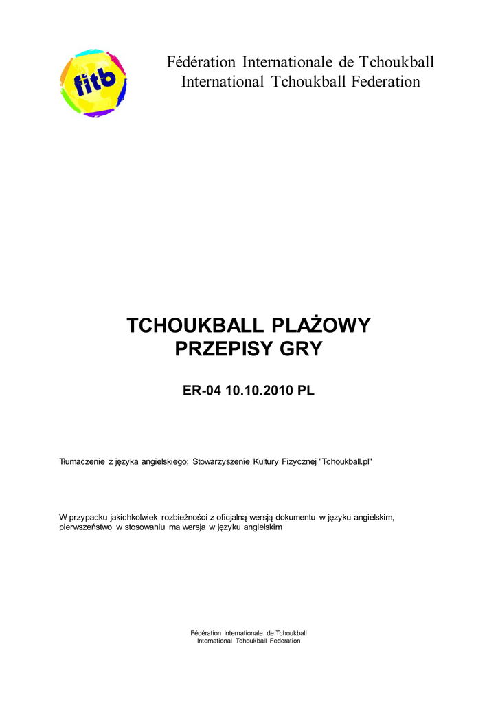 Fédération Internationale de Tchoukball International Tchoukball Federation TCHOUKBALL PLAŻOWY PRZEPISY GRY ER-04 10.10.2010 PL Tłumaczenie z języka angielskiego: Stowarzyszenie Kultury Fizycznej "Tchoukball.pl" W przypadku jakichkolwiek rozbieżności z oficjalną wersją dokumentu w języku angielskim, pierwszeństwo w stosowaniu ma wersja w języku angielskim Fédération Internationale de Tchoukball International Tchoukball Federation PRZEPISY GRY W TCHOUKBA LL PLAŻOWY FITB-P RC PRZEPISY GRY W TCHOUKBALL PLAŻOWY Spis treści Wprowadzenie ........................................................................................................................... 3 1. Boisko do tchoukballu plażowego .................................................................................... 3 2. Bramka ............................................................................................................................... 4 3. Piłka .................................................................................................................................... 4 4. Zawodnicy .......................................................................................................................... 4 5. Sędziowie i stanowisko sędziowskie ............................................................................... 4 6. Sety .................................................................................................................................... 4 7. Błędy gry ............................................................................................................................ 5 8. Zdobywanie punktów ........................................................................................................ 5 9. Zwycięzca .......................................................................................................................... 5 10. Rozpoczęcie i wznawianie gry ......................................................................................... 5 11. Błędne odbicie ................................................................................................................... 5 12. Duch gry ............................................................................................................................. 5 ER-04_B TB R_V1_0B eachTchoukballRules_pl.pdf 2 PRZEPISY GRY W TCHOUKBA LL PLAŻOWY FITB-P RC Wprowadzenie Tchoukball plażowy powstał we wczesnych latach 90. w Brazylii. Od tego czasu rozwijał się i był popularyzowany na całym świecie. Dzięki zdobytym doświadczeniom możliwe stało się stworzenie niniejszych regulacji, określających zasady organizacji zawodów plażowych, jak również założeń dotyczących boiska do tchoukballu plażowego. W tchoukball plażowy powinno się grać na boisku o rozmiarach 11-13 m szerokości i 21-23 m długości, po 5 zawodników na boisku w drużynie. Każda z drużyn może mieć 2 zawodników rezerwowych, tak więc jedna drużyna składa się łącznie z 7 zawodników. Celem niniejszego dokumentu jest wyjaśnienie różnic pomiędzy tchoukballem rozgrywanym w hali sportowej oraz jego odmianą plażową. Zakłada się, że kwestie dotyczące przepisów niewyszczególnionych w tym dokumencie są tożsame z oficjalnymi przepisami gry w tchoukball oraz ich interpretacjami (ER-01 Tchoukball. Oficjalne przepisy gry oraz ER-03 Oficjalne interpretacje przepisów gry w tchoukball). 1. Boisko do tchoukballu plażowego Rysunek 1 przedstawia wymiary boiska do tchoukballu plażowego. Wymiary są podane w centymetrach. Aby zminimalizować ryzyko kontuzji, wokół boiska konieczna jest strefa bezpieczeństwa, której szerokość wynosi 1 metr wzdłuż linii bocznych oraz 2 metry wzdłuż linii końcowych (strefa bezpieczeństwa została oznaczona na rysunku poniżej linią przerywaną). Zalecana szerokość strefy bezpieczeństwa wzdłuż linii bocznych wynosi 2 m. Na boisku nie powinny znajdować się żadne przedmioty zagrażające bezpieczeństwu zawodników, jak np. potłuczone szkło, plastikowe butelki, itp. Pole bramkowe powinno być oznaczone gumowymi pachołkami o średnicy 30-35 mm. Alternatywnie, pole bramkowe może być oznaczone ok. 12 plastikowymi pachołkami, pomiędzy którymi (na piasku) powinna być narysowana linia. Rys. 1 – Zalecane rozmiary boiska do tchoukballu plażowego [cm]. ER-04_B TB R_V1_0B eachTchoukballRules_pl.pdf 3 2. Bramka Poza odniesieniem do oficjalnych przepisów gry w tchoukball należy dodać, że w tchoukballu plażowym niezbędna jest pewność co do idealnego – poziomego i stabilnego – ustawienia bramek. 3. Piłka Nie ma różnic z oficjalnymi przepisami gry w tchoukball, jakkolwiek należy być świadomym, że niektóre piłki, które mogą być odpowiednie / homologowane do tchoukballu rozgrywanego w hali sportowej, mogą być nieodpowiednie do tchoukballu plażowego. 4. Zawodnicy Drużyna składa się z maksymalnie 7 zawodników. W każdej z drużyn na boisku gra po 5 zawodników – pozostali 2 są zawodnikami rezerwowymi. W przypadku, gdy drużyna na boisku do gry dysponuje 3 lub mniejszą ilością zawodników, oddaje mecz walkowerem z wynikiem 0-30. Zasadniczo zawodnicy grają boso. Sędzia może zezwolić zawodnikom na grę w obuwiu, jeżeli uzna to za niezbędne ze względów bezpieczeństwa (ostre przedmioty w piasku, gorący lub mokry piasek). 5. Sędziowie i stanowisko sędziowskie Oficjalny zespół sędziowski w przypadku tchoukballu plażowego jest złożony z 2 sędziów oraz 2 przedstawicieli obsługujących stanowisko sędziowskie (odpowiadających za pomiar czasu gry oraz liczenie punktów). 6. Sety Zamiast gry 3x15 minut, jak w tchoukballu rozgrywanym w hali sportowej, tchoukball plażowy rozgrywany jest w setach. Drużyna, która jako pierwsza wygra 2 sety, wygrywa mecz. Drużyna, która jako pierwsza zdobędzie odpowiednią liczbę punktów, mając co najmniej 2 punkty przewagi nad drużyną przeciwną, wygrywa set. Jeżel