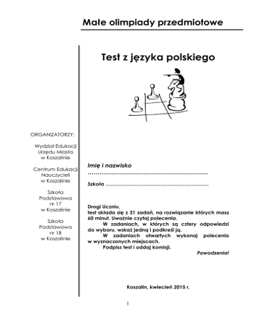 Małe olimpiady przedmiotowe Test z języka polskiego ORGANIZATORZY: Wydział Edukacji Urzędu Miasta w Koszalinie Centrum Edukacji Nauczycieli w Koszalinie Szkoła Podstawowa nr 17 w Koszalinie Szkoła Podstawowa nr 18 w Koszalinie Imię i nazwisko …………………………………………………… Szkoła …………………………………………………… Drogi Uczniu, test składa się z 31 zadań, na rozwiązanie których masz 60 minut. Uważnie czytaj polecenia. W zadaniach, w których są cztery odpowiedzi do wyboru, wskaż jedną i podkreśl ją. W zadaniach otwartych wykonaj polecenia w wyznaczonych miejscach. Podpisz test i oddaj komisji. Powodzenia! Koszalin, kwiecień 2015 r. 1 TEKST I Szachy są planszową grą strategiczną znaną na całym świecie, w każdej kulturze czy cywilizacji. Szachy są grą o wieloletniej tradycji. Nieznane są dokładne miejsce i czas powstania gry; najprawdopodobniej są to Indie, ok. V-VI w. n.e. Obecnie stosowane zasady opracowali Persowie. Słowo „szach” to przecież perski król. Inne hipotezy sytuują miejsce powstania gry w Chinach. Po zdobyciu Persji przez Arabów w VII wieku chętnie grywali w tę grę i propagowali ją Arabowie; w tym czasie dotarła do Europy. W XIII wieku szachownica przybrała dzisiejszy wygląd (uprzednio była jednobarwna). W XV wieku ustaliły się nazwy i niezmienne zasady ruchu bierek, a w XVI wieku - reguły gry ostatecznie przybrały formę dzisiejszą. Polska poznała szachy w XII wieku. Nie ustalono jednoznacznie, jak znalazły się one w Polsce, czy przywieziono je drogą morską, przeniesiono z Rosji, czy też szachy przywieźli rycerze powracający z wypraw krzyżowych. Te trzy teorie nie wykluczają się wzajemnie, a więc wszystkie mogą być prawdziwe. Umiejętność gry w szachy uznawana była za zaletę i zyskała sobie wysoką rangę na dworze królewskim. O wpływie szachów na współczesny język świadczy choćby zwrot w języku polskim: trzymać kogoś w szachu. Wiemy, czym jest patowa sytuacja, słyszymy, że ktoś wykonał roszadę na jakimś stanowisku. Mówimy, że ktoś jest czyimś pionkiem w grze. Szachownica to nie tylko plansza do gry w szachy, ale i ładny motyw graficzny. M. Litmanowicz: Szachy, www.szachy.pl Na podstawie TEKSTU I odpowiedz na pytania 1. – 3. 1. Na osi czasu zaznacz fakty z historii szachów i opisz je (pierwszy fakt jest już zaznaczony i opisany). V w. n.e. powstanie gry 2. Wyjaśnij związki frazeologiczne: trzymać kogoś w szachu ……………………………..………………………………… być pionkiem w grze ……………………………………………………….…… 2 3. Jak myślisz, dlaczego Umiejętność gry w szachy uznawana była za zaletę i zyskała sobie wysoką rangę na dworze królewskim? Uzasadnij. …………………………………………………………………………………… …………………………………………………………………………………… …………………………………………………………………………………… …………………………………………………………………………………… TEKST II Caissa – driada1 przedstawiana jako bogini szachów. Mit o powstaniu szachów nie występował w starożytności, jako pierwszy powiązanie między Caissą a szachami utworzył William Jones w poemacie Caissa or the game of chess (Caissa, czyli partia szachów), wydanym w Oxfordzie w 1772. Fabuła poematu opisuje partię szachów rozgrywaną na Olimpie w obecności bogów przez dwie nimfy. Podczas gry pojawiła się na Olimpie Caissa, wzbudzając zachwyt swą urodą. Szczególnie zauroczony jej wdziękami był Mars. Dowiedziawszy się, gdzie nimfa mieszka, aby ją zdobyć, przyniósł tam szachownicę o polach wykonanych ze srebrnych i złotych płytek i zaproponował jej rozegranie partii. Caissa nie znała jednak zasad tej gry, poprosiła zatem Marsa, by nauczył ją grać. Nie wiadomo, czy zaloty Marsa przyniosły oczekiwany przez niego skutek, gdyż w kulminacyjnym momencie akcja poematu przenosi się z powrotem na Olimp. na podstawie: pl.wikipedia.org Na podstawie TEKSTU II odpowiedz na pytania 4. - 12. 4. Mit o Caissie znamy: a) ze starożytnej mitologii. b) z osiemnastowiecznego poematu. c) z dawnych przekazów ustnych. d) z siedemnastowiecznej literatury. 5. Kim była Caissa? a) Driadą. b) Nimfą szachów. c) Boginią. d) Wszystkie odpowiedzi są poprawne. 1 driada – nimfa drzew 3 6. Historia Caissy rozgrywa się: a) w Oxfordzie. b) w starożytnej Grecji. c) w starożytnym Rzymie. d) w dawnej Anglii. 7. Czym zachwycił się Mars? a) Piękną szachownicą. b) Umiejętnością gry w szachy. c) Partią rozgrywaną przez nimfy. d) Urodą bogini. 8. Kim był Mars i skąd wywodzi się ta postać? Wybierz odpowiedź „1.” lub „2.” i połącz z odpowiedzią „a” lub „b”, lub „c” (np. 3a). Odpowiedź wpisz pod tabelą. 1. Mars był bogiem sprawiedliwej walki, 2. Mars był bogiem okrutnej wojny, wywodził a) mitologii greckiej się z b) mitologii rzymskiej c) poematu oxfordzkiego ……………… 9. Nazwy mitologiczne są obecne we współczesnej polszczyźnie. Podaj jeden przykład połączenia językowego z wyrazem marsowy. …………………………………………. 10.Wyobraź sobie zakończenie spotkania Caissy i Marsa. Zapisz swoją wersję w trzech - czterech zdaniach. ……………………………………………………………………………………. ……………………………………………………………………………………. ……………………………………………………………………………………. ……………………………………………………………………………………. ……………………………………………………………………………………. ………………………
