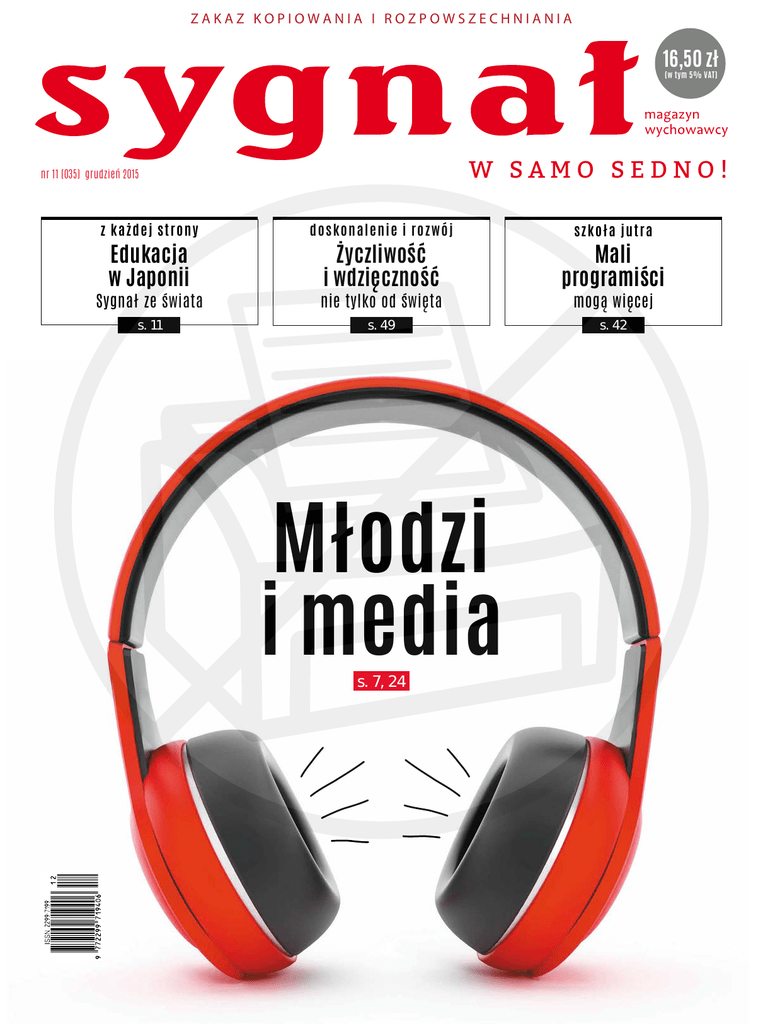 ZAKAZ KOPIOWANIA I ROZPOWSZECHNIANIA 16,50 zł (w tym 5% VAT) W SAMO SEDNO! nr 11 (035) grudzień 2015 z każdej st ro ny d os ko n a l e n i e i ro zw ó j szko ł a j ut ra Sygnał ze świata Życzliwość i wdzięczność nie tylko od święta Mali programiści s. 11 s. 49 s. 42 Edukacja w Japonii Młodzi i media s. 7, 24 mogą więcej ZAKAZ KOPIOWANIA I ROZPOWSZECHNIANIA Świętuj z nami już od 1 grudnia! Zaloguj się na www.oficynamm.pl do swojego panelu klienta, używając adresu e-mail wykorzystywanego do kontaktu z nami (jeśli nie masz jeszcze konta, wypełnij formularz rejestracyjny). Wejdź do zakładki „Prezenty świąteczne” (czerwone menu po prawej) i bezpłatnie pobierz świąteczne scenariusze lekcji oraz karty pracy. Korzystaj z naszych prezentów i wspólnie z uczniami ciesz się bożonarodzeniową atmosferą! ZAKAZ KOPIOWANIA I ROZPOWSZECHNIANIA Wszystkie materiały zamieszczone w niniejszej publikacji są chronione prawami autorskimi. Majątkowe prawa autorskie do materiałów umieszczonych w publikacji przysługują wyłącznie Oficynie MM Wydawnictwu Prawniczemu Sp. z o. o. Sp. k. Zamieszczone materiały lub ich część nie mogą być: kopiowane, dystrybuowane ani publikowane w żadnej formie i przy użyciu żadnych technik bez uprzedniego pisemnego zezwolenia Oficyny MM Wydawnictwa Prawniczego Sp. z o. o. Sp. k. ZAKAZ KOPIOWANIA I ROZPOWSZECHNIANIA OD REDAKCJI P atrzymy na współczesną młodzież i często komentujemy ich sytuację takimi słowami: ależ oni mają swobodę! W organizacji czasu wolnego, w zachowaniu, modzie, komunikacji… Wolno im więcej niż ich rodzicom, dziadkom czy wujkom (często nawet więcej niż starszemu rodzeństwu). Prawie wszędzie mogą pojechać, dzięki internetowi i nowym technologiom mają tyle możliwości i perspektyw... Mogą włączyć kilka stacji radiowych i wybrać tę, która puszcza ich ulubioną muzykę, zatrudnia dziennikarzy odpowiadających ich upodobaniom i nadaje wiadomości odpowiedniej jakości i we właściwych odstępach czasu. Mogą też przebierać w stacjach telewizyjnych, a w salonie prasowym spędzić wiele godzin, by ostatecznie nic nie kupić, ale zapoznać się z wieloma tytułami. Żeby przejrzeć internet, już nigdzie nie muszą chodzić, podłączać sprzętu do prądu, często wystarczy jedno kliknięcie. Jeśli jednak dokładniej przyjrzeć się tym przywilejom i dostępnym opcjom, okazuje się, że owszem – dziś świat stoi otworem, ale jednocześnie jest pełen pułapek i niebezpieczeństw. Tym bardziej są one niepokojące, im więcej w nich tzw. dobrodziejstw współczesności (powstałych z myślą o lepszym życiu, ale wykorzystywanych w różny sposób). Po pierwsze, dlatego że z tych niekończących się możliwości korzystają także ludzie o niekoniecznie dobrych zamiarach. I nie chodzi tylko o skrajne przypadki, np. cyberprzemocy. Z nowoczesnych słuchawek, które umieściliśmy na okładce tego wydania, można usłyszeć choćby reklamę, która prawie niezauważalnie wpłynie na młodą głowę i będzie mieć znaczenie przy podejmowaniu przez ucznia decyzji (od kulinarnych po życiowe). Po drugie: nie od dziś wiadomo, że od nadmiaru boli głowa. Im więcej mamy możliwości, tym trudniej nam podjąć właściwą decyzję. Nikt nie miał „lepiej” i nikt nie żył w „dobrych” czasach. Starsi mieli ograniczenia, młodsi mają ich zdecydowanie mniej, ale przez to łatwiej się gubią i czeka ich więcej niewiadomych. Co z tym zrobić? Nic nadzwyczajnego i odkrywczego: współpracować ze sobą. Mieszanka wiedzy i doświadczeń obu stron wydaje się idealna. Stara to prawda, wręcz banał, ale wciąż gdzieś nam umyka. Spokojnych i zdrowych Świąt Bożego Narodzenia, odpoczynku Redaktor prowadząca i wspaniałych chwil spędzonych w gronie najbliższych! Redakcja Spieszymy poinformować, że w poprzednim wydaniu, tj. nr 10 (034), na s. 10 umieściliśmy zdjęcie uczniów i nauczycieli z Zespołu Szkół Społecznych „Splot” im. Jana Karskiego w Nowym Sączu. Serdecznie pozdrawiamy całą placówkę i wraz z Polską Akcją Humanitarną przepraszamy za pomyłkę. Wydawca Oficyna MM Wydawnictwo Prawnicze Sp. z o. o. Sp. k. ul. Błażeja 10 j/1, 61-608 Poznań tel. (61) 653 64 30 [email protected] www.oficynamm.pl Nakład 1900 egz. papierowych Adres redakcji ul. Błażeja 12 j/2 61-608 Poznań Redaktor naczelna Aneta Mizera Redaktor prowadząca Agata Białachowska [email protected] Menedżer Produktu Agnieszka Korcz [email protected] Stali współpracownicy Magdalena Goetz Monika Gryboś Paulina Ilska Aleksandra Jagła Marcin Majchrzak Joanna Marglarczyk Jagna Niepokólczycka-Gac Anna Samsel Jarosław Szulski Agnieszka Ważny Małgorzata Wylegała dr Marzena Żylińska Korekta Anna Kaczmarek Reklama [email protected] tel. (61) 653 64 30 Dział obsługi klienta [email protected] tel. (61) 828 49 27 tel. (61) 828 49 72 Zdjęcia Zbiory własne Oficyny MM, Dreamstime.com, Fotolia.com Skład, druk i oprawa Zakład poligraficzny Moś i Łuczak sp.j. [email protected] Zamówienia na prenumeratę instytucjonalną przyjmuje firma Kolporter Spółka z ograniczoną odpowiedzialnością S.K.A. Informacje pod numerem infolinii: 0801 40 40 44 lub na stronie internetowej: http://dp.kolporter.com.pl/. Redakcja nie zwraca materiałów niezamówionych, zastrzega sobie prawo do skracania, redagowania oraz zmian tytułów i tekstów nadesłanych artykułów, nie odpowiada za treśc materiałów reklamowych. Zdjęcie na okładce: Destina. sygnał grudzień 2015 3 ZAKAZ KOPIOWANIA I ROZPOWSZECHNIANIA 16,50 zł (w tym 5% VAT) SPIS TREŚCI W SAMO SEDNO! nr 11 (035) grudzień 2015 z ka żdej strony doskona lenie i rozw ój Kalendarium 5 Aktualności 6 szkoł a ju tra Sygnał ze świata Życzliwość i wdzięczność nie tylko od święta Mali programiści s. 11 s. 49 s. 42 Edukacja w Japonii mogą więcej Młodzi i media s. 7, 24 TEMAT WYDANIA Młodzi i media 7 z każdej strony Sygnał ze 