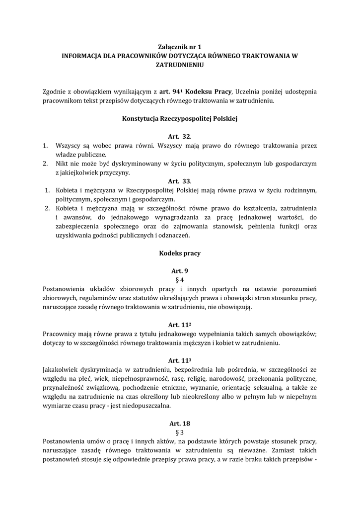 Załącznik nr 1 INFORMACJA DLA PRACOWNIKÓW DOTYCZĄCA RÓWNEGO TRAKTOWANIA W ZATRUDNIENIU Zgodnie z obowiązkiem wynikającym z art. 941 Kodeksu Pracy, Uczelnia poniżej udostępnia pracownikom tekst przepisów dotyczących równego traktowania w zatrudnieniu. Konstytucja Rzeczypospolitej Polskiej Art. 32. 1. Wszyscy są wobec prawa równi. Wszyscy mają prawo do równego traktowania przez władze publiczne. 2. Nikt nie może być dyskryminowany w życiu politycznym, społecznym lub gospodarczym z jakiejkolwiek przyczyny. Art. 33. 1. Kobieta i mężczyzna w Rzeczypospolitej Polskiej mają równe prawa w życiu rodzinnym, politycznym, społecznym i gospodarczym. 2. Kobieta i mężczyzna mają w szczególności równe prawo do kształcenia, zatrudnienia i awansów, do jednakowego wynagradzania za pracę jednakowej wartości, do zabezpieczenia społecznego oraz do zajmowania stanowisk, pełnienia funkcji oraz uzyskiwania godności publicznych i odznaczeń. Kodeks pracy Art. 9 §4 Postanowienia układów zbiorowych pracy i innych opartych na ustawie porozumień zbiorowych, regulaminów oraz statutów określających prawa i obowiązki stron stosunku pracy, naruszające zasadę równego traktowania w zatrudnieniu, nie obowiązują. Art. 112 Pracownicy mają równe prawa z tytułu jednakowego wypełniania takich samych obowiązków; dotyczy to w szczególności równego traktowania mężczyzn i kobiet w zatrudnieniu. Art. 113 Jakakolwiek dyskryminacja w zatrudnieniu, bezpośrednia lub pośrednia, w szczególności ze względu na płeć, wiek, niepełnosprawność, rasę, religię, narodowość, przekonania polityczne, przynależność związkową, pochodzenie etniczne, wyznanie, orientację seksualną, a także ze względu na zatrudnienie na czas określony lub nieokreślony albo w pełnym lub w niepełnym wymiarze czasu pracy - jest niedopuszczalna. Art. 18 §3 Postanowienia umów o pracę i innych aktów, na podstawie których powstaje stosunek pracy, naruszające zasadę równego traktowania w zatrudnieniu są nieważne. Zamiast takich postanowień stosuje się odpowiednie przepisy prawa pracy, a w razie braku takich przepisów - postanowienia te należy zastąpić odpowiednimi postanowieniami niemającymi charakteru dyskryminacyjnego. Art. 183a § 1. Pracownicy powinni być równo traktowani w zakresie nawiązania i rozwiązania stosunku pracy, warunków zatrudnienia, awansowania oraz dostępu do szkolenia w celu podnoszenia kwalifikacji zawodowych, w szczególności bez względu na płeć, wiek, niepełnosprawność, rasę, religię, narodowość, przekonania polityczne, przynależność związkową, pochodzenie etniczne, wyznanie, orientację seksualną, a także bez względu na zatrudnienie na czas określony lub nieokreślony albo w pełnym lub w niepełnym wymiarze czasu pracy. § 2. Równe traktowanie w zatrudnieniu oznacza niedyskryminowanie w jakikolwiek sposób, bezpośrednio lub pośrednio, z przyczyn określonych w § 1. § 3. Dyskryminowanie bezpośrednie istnieje wtedy, gdy pracownik z jednej lub z kilku przyczyn określonych w § 1 był, jest lub mógłby być traktowany w porównywalnej sytuacji mniej korzystnie niż inni pracownicy. § 4. Dyskryminowanie pośrednie istnieje wtedy, gdy na skutek pozornie neutralnego postanowienia, zastosowanego kryterium lub podjętego działania występują lub mogłyby wystąpić niekorzystne dysproporcje albo szczególnie niekorzystna sytuacja w zakresie nawiązania i rozwiązania stosunku pracy, warunków zatrudnienia, awansowania oraz dostępu do szkolenia w celu podnoszenia kwalifikacji zawodowych wobec wszystkich lub znacznej liczby pracowników należących do grupy wyróżnionej ze względu na jedną lub kilka przyczyn określonych w § 1, chyba że postanowienie, kryterium lub działanie jest obiektywnie uzasadnione ze względu na zgodny z prawem cel, który ma być osiągnięty, a środki służące osiągnięciu tego celu są właściwe i konieczne. § 5. Przejawem dyskryminowania w rozumieniu § 2 jest także: 1) działanie polegające na zachęcaniu innej osoby do naruszenia zasady równego traktowania w zatrudnieniu lub nakazaniu jej naruszenia tej zasady; 2) niepożądane zachowanie, którego celem lub skutkiem jest naruszenie godności pracownika i stworzenie wobec niego zastraszającej, wrogiej, poniżającej, upokarzającej lub uwłaczającej atmosfery (molestowanie). § 6. Dyskryminowaniem ze względu na płeć jest także każde niepożądane zachowanie o charakterze seksualnym lub odnoszące się do płci pracownika, którego celem lub skutkiem jest naruszenie godności pracownika, w szczególności stworzenie wobec niego zastraszającej, wrogiej, poniżającej, upokarzającej lub uwłaczającej atmosfery; na zachowanie to mogą się składać fizyczne, werbalne lub pozawerbalne elementy (molestowanie seksualne). § 7. Podporządkowanie się przez pracownika molestowaniu lub molestowaniu seksualnemu, a także podjęcie przez niego działań przeciwstawiających się molestowaniu lub molestowaniu seksualnemu nie może powodować jakichkolwiek negatywnych konsekwencji wobec pracownika. Art. 183b § 1. Za naruszenie zasady równego traktowania w zatrudnieniu, z zastrzeżeniem § 2-4, uważa się różnicowanie przez pracodawcę sytuacji pracownika z jednej lub kilku przyczyn określonych w art. 183a § 1, którego skutkiem jest w szczególności: 1) odmowa nawiązania lub rozwiązanie stosunku pracy, 2) niekorzystne ukształtowanie wynagrodzenia za pracę lub innych warunków zatrudnienia albo pominięcie przy awansowaniu lub przyznawaniu innych świadczeń związanych z pracą, 3) pominięcie przy typowaniu do udziału w szkoleniach podnoszących kwalifikacje zawodowe - chyba że pracodawca udowodni, że kierował się obiektywnymi powodami. § 2. Zasady równego traktowania w zatrudnieniu nie naruszają działania, proporcjonalne do osiągnięcia zgodnego z prawem celu różnicowania sytuacji pracownika, polegające na