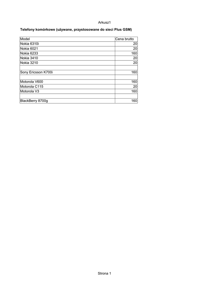Arkusz1 Strona 1 Telefony komórkowe (używane, przystosowane do