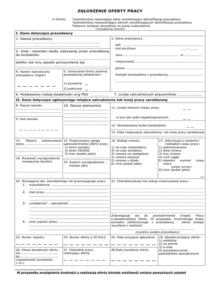 ZGŁOSZENIE OFERTY PRACY w formie: *pośrednictwo zawierające dane umożliwiające identyfikację pracodawcy *pośrednictwo niezawierające danych umożliwiających identyfikację pracodawcy *dotyczy wydania zezwolenia na pracę cudzoziemca *(niewłaściwe skreslić) I. Dane dotyczące pracodawcy 1. Nazwa pracodawcy ...................................................................................................... ...................................................................................................... 3. Adres pracodawcy : NIP ........................................................................... kod pocztowy __-___ 2. Imię i nazwisko osoby wskazanej przez pracodawcę do kontaktów: ............................................................................. telefon lub inny sposób porozumienia się: ............................................................................. 4. Numer statystyczny pracodawcy (regon) _______ ulica ................................................... nr ................ miejscowość ................................................................ gmina ........................................................................ 5. Oznaczenie formy prawnej prowadzonej działalności 1) prywatna 2) publiczna _ _ 6. Podstawowy rodzaj działalności w/g PKD _ _ _ _ _ Kontakt kandydatów z pracodawcą: ............................... ................................................................................... 7. Liczba zatrudnionych pracowników .................... II. Dane dotyczące zgłoszonego miejsca zatrudnienia lub innej pracy zarobkowej 8. Nazwa zawodu 10. Nazwa stanowiska .......................................... ..................................... 11. Liczba wolnych miejsc pracy .......................................... ..................................... 9. Kod zawodu _________ ..................................... w tym dla osób niepełnosprawnych ..................................... ..................................... 12. Wnioskowana liczba kandydatów __ __ __ 13. Data rozpoczęcia zatrudnienia lub innej pracy zarobkowej ...................................................................................... 14. Miejsce wykonywania 15. Proponowany zasięg pracy ................................. upowszechnienia oferty pracy .......................................... 1) teren powiatu .......................................... 2) teren UE/EOG 3) inne (podać jakie) .......................................... 18. Wysokość wynagrodzenia miesięcznie (brutto) 19. System wynagradzania (wpisać jaki) 16. Rodzaj umowy: 1) 2) 3) 4) 5) 6) na czas nieokreślony na czas określony umowa na zastępstwo umowa zlecenia umowa o dzieło inna (podać jaka) 17. Informacja o systemie i rozkładzie czasu pracy: 1) jednozmianowa 2) dwie zmiany 3) trzy zmiany 4) ruch ciągły 5) niepełny wymiar czasu pracy (podać wymiar) 6) inne (podać jakie) .......................................... .......................................... _ 20. Wymagania dot. bezrobotnego lub poszukującego pracy21. Charakterystyka lub rodzaj wykonywanej pracy 1. wykształcenie ................................................ 2. 3. 4. .................................................................. staż pracy .................................................... .................................................................. .................................................................. umiejętność – specjalność ................................ .................................................................. .................................................................. .................................................................. .................................................................. inne (wpisać jakie) .......................................... .................................................................. .................................................................. ............................................................................................................... ............................................................................................................... ............................................................................................................... ............................................................................................................... ............................................................................................................... ............................................................................................................... ............................................................................................................... .............................................................................................................. Zobowiązuję się do powiadomienia Urzędu Pracy o dezaktualizacji oferty. W przypadku trzykrotnego braku kontaktu telefonicznego z pracodawcą – oferta zostaje wycofana z realizacji. ...................................................................... (czytelny podpis pracodawcy) 22. Numer rejestru 23. Numer oferty w SI PULS 24. Data przyjęcia zgłoszenia ________ ________ ________ 26. Okres aktualności oferty od.................................... do.................................... Częstotliwość kontaktów: 1 m-c 27. Pośrednik pracy realizujący ofertę 28.Data wycofania oferty ________ ________ 25. Sposób przyjęcia oferty 1) osobiście 2) na pismie 3) e-mail 4) pozyskana przez pośredników zewnętrznych W przypadku wystąpienia trudności z realizacją oferty istnieje możliwość zmiany powyższych ustaleń Informacja dla pracodawcy ● Pracodawca zgłasza ofertę pracy do jednego powiatowego urzędu pracy właściwego ze względu na siedzibę pracodawcy albo miejsce wykonywania pracy albo innego wybranego przez siebie urzędu. ● Powiatowy Urz