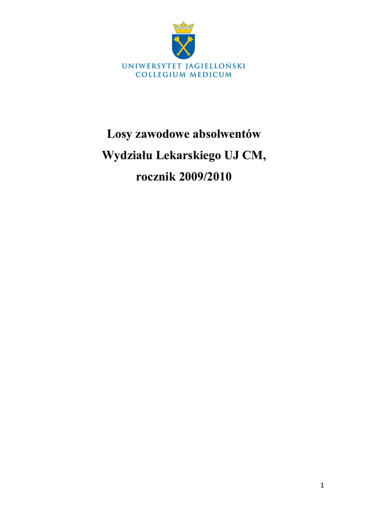 Losy zawodowe absolwentów Wydziału Lekarskiego UJ CM, rocznik 2009/2010 1 Wstęp Metodologia Wyjaśnienie głównych pojęć Absolwent – osoba, która w roku akademickim 2009/2010 była studentem ostatniego roku i zdała wszystkie egzaminy końcowe objęte planem i programem studiów na Wydziale Lekarskim UJ CM. Losy zawodowe – sytuacja zawodowa absolwentów po sześciu miesiącach od ukończenia stażu podyplomowego, a następnie po trzech latach od jego zakończenia oraz zespół cech z nią związanych, takich jak na przykład: miejsce zatrudnienia, forma zatrudnienia, stanowisko, wysokość zarobków, branża zatrudnienia, rodzaj prowadzonej działalności gospodarczej, forma kontynuacji nauki, przyczyny pozostawania bez pracy i plany osób niepracujących. Kompetencje – zbiór następujących składowych: wiedzy z danego zakresu - wiem co; umiejętności - wiem jak i potrafię, oraz postaw - chcę i jestem gotów wykorzystać swą wiedzę. Charakterystyka badania Raport przedstawia losy zawodowe absolwentów Wydziału Lekarskiego Uniwersytetu Jagiellońskiego Collegium Medicum rocznika 2009/2010. Jest on częścią realizowanego na 15 Wydziałach Uniwersytetu Jagiellońskiego projektu pod nazwą „Losy zawodowe absolwentów Uniwersytetu Jagiellońskiego” realizowanego przez Biuro Karier UJ. Badania na Wydziale Lekarskim prowadziła Sekcja ds. Dydaktyki i Karier Akademickich CM. Celem badania było poznanie, w jaki sposób kształtuje się kariera zawodowa absolwentów Wydziału Lekarskiego. Projekt był realizowany we współpracy z SPSS Polska z wykorzystaniem platformy badawczej IBM SPSS Data Collection. Firma SPSS udostępniła infrastrukturę informatyczną tj. serwer oraz łącze internetowe umożliwiające realizację badania, następnie odpowiednio dostosowała bazę respondentów do wymogów badania, skonstruowała ankietę on-line, po czym zgromadzone dane przekazała CM UJ w celu opracowania wyników. 2 Populacja badawcza Badaniem zostali objęci absolwenci następujących kierunków Wydziału Lekarskiego Uniwersytetu Jagiellońskiego Collegium Medicum rocznika 2009/2010: lekarskiego i lekarsko-dentystycznego. Zastosowano metodę panelową, pozwalającą na uchwycenie dynamiki zmian w ścieżkach zawodowych absolwentów. Przyjęto, iż ci sami członkowie populacji badawczej będą testowani w dwóch turach: 1. po 6 miesiącach od ukończenia stażu podyplomowego (po 18 miesiącach od daty odbioru dyplomu) 2. po trzech latach od ukończenia stażu podyplomowego Niniejszy raport przedstawia wyniki pierwszej tury badania. W założeniu badanie miało charakter wyczerpujący (pełny), ankieta miała zostać wysłana do każdej jednostki populacji badawczej, tj. absolwentów, którzy złożyli egzamin magisterski Ze względu na konieczność spełnienia wymogu formalno-prawnego wynikającego z ustawy z dnia 29 sierpnia 1997 roku o ochronie danych osobowych w badaniu mogły wziąć tylko te osoby, które wcześniej wyraziły zgodę na gromadzenie, wykorzystanie i przetwarzanie ich danych osobowych. W tym celu absolwenci wypełniali formularz, umożliwiający złożenie stosownego oświadczenia. Formularz był rozdawany i zbierany przez pracowników dziekanatu Wydziału Lekarskiego UJ CM. W sumie zebrano 190 wypełnione formularze, tj. 58.6 % z ogólnej liczby 324 absolwentów Wydziału Lekarskiego UJ CM (według stanu na 30.11.2010). Formularze w liczbie 182 zawierały zgodę na udział w badaniu, natomiast 8 osób odmówiło udziału lub niejednoznacznie określiło swoje stanowisko. Z grupy 182 osób, 96 absolwentów wypełniło prawidłowo ankietę i tym samym ukończyło badanie. Pozostała liczba osób 86 rozpoczęła badanie, ale go nie ukończyła. Wśród grupy 182 osób deklarujących zgodę na udział w badaniu znalazły się i te, które w formularzu nie podały danych kontaktowych lub podały je błędnie, co uniemożliwiało dotarcie do nich. 3 Tabela 1 przedstawia gotowość studentów do wzięcia udziału w badaniu w rozbiciu na poszczególne kierunki Wydziału Lekarskiego UJ CM. Kierunek Ilość Odsetek wśród Ilość Odsetek wśród Odsetek formularzy ze ankiet ze poprawnie poprawnie względem zgodą zgodą (%) wypełnionych wypełnionych formularzy ze ankiet ankiet (%) zgodą (%) Lekarski 156 85.7 85 88.5 54.5 Lekarsko - 26 14.3 11 11.5 42.3 182 100 96 100 52,7 dentystyczny Ogółem Metoda zbierania danych, monitorowanie zwrotów Przeprowadzone zostało ilościowe badanie sondażowe techniką CAWI, w którym zindywidualizowany link do ankiety był wysyłany drogą elektroniczną w oparciu o wcześniej przygotowaną listę adresów e-mailowych. Ankieta zawierała pięćdziesiąt dziewięć pytań wraz z metryczką, w zdecydowanej większości zamkniętych. Pierwsze dziewięć pytań odnosiło się do wszystkich ankietowanych, a następne dzieliły respondentów na cztery podstawowe grupy ze względu na sytuację zawodową: 1. pracujący, 2. pracujący, kontynuujący naukę, 3. niepracujący, kontynuujący naukę, 4. niepracujący, niekontynuujący nauki. W zależności od reakcji respondenta, podejmowano dwie kolejne próby wysyłki linku do ankiety, po około dwóch tygodniach od daty poprzedniej wysyłki. W przypadku dalszego nieuzyskania odpowiedzi kontaktowano się z respondentem telefonicznie, ponownie prosząc o wzięcie udziału w badaniu. 4 Charakterystyka badanej próby W badaniu losów absolwentów Wydziału Lekarskiego UJ CM, którzy ukończyli studia w roku 2010 wzięło udział 96 osób, w tym 85 (88,5%) absolwentów kierunku lekarskiego oraz 11 absolwentów kierunku lekarsko-dentystycznego (11,5%). Większość badanych stanowiły kobiety (70 osób - 73%) – analizowane kierunki nie różniły się istotnie odsetkiem kobiet, choć na kierunku lekarskim stanowiły one 70% analizowanej próby, podczas gdy na kierunku lekarsko-dentystycznym ponad 90%. Wykres 1: Struktura płci badanych absolwentów poszczególnych kierunków Wydziału Le