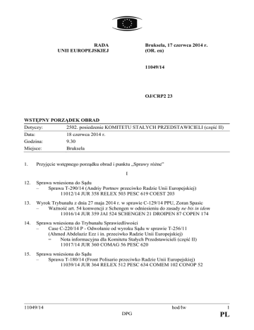 RADA UNII EUROPEJSKIEJ Bruksela, 17 czerwca 2014 r. (OR. en) 11049/14 OJ/CRP2 23 WSTĘPNY PORZĄDEK OBRAD Dotyczy: 2502. posiedzenie KOMITETU STAŁYCH PRZEDSTAWICIELI (część II) Data: Godzina: Miejsce: 18 czerwca 2014 r. 9.30 Bruksela 1. Przyjęcie wstępnego porządku obrad i punktu „Sprawy różne” I 12. Sprawa wniesiona do Sądu – Sprawa T-290/14 (Andriy Portnov przeciwko Radzie Unii Europejskiej) 11012/14 JUR 358 RELEX 503 PESC 619 COEST 203 13. Wyrok Trybunału z dnia 27 maja 2014 r. w sprawie C-129/14 PPU, Zoran Spasic – Ważność art. 54 konwencji z Schengen w odniesieniu do zasady ne bis in idem 11016/14 JUR 359 JAI 524 SCHENGEN 21 DROIPEN 87 COPEN 174 14. Sprawa wniesiona do Trybunału Sprawiedliwości – Case C-220/14 P - Odwołanie od wyroku Sądu w sprawie T-256/11 (Ahmed Abdelaziz Ezz i in. przeciwko Radzie Unii Europejskiej) = Nota informacyjna dla Komitetu Stałych Przedstawicieli (część II) 11017/14 JUR 360 COMAG 56 PESC 620 15. Sprawa wniesiona do Sądu – Sprawa T-180/14 (Front Polisario przeciwko Radzie Unii Europejskiej) 11039/14 JUR 364 RELEX 512 PESC 634 COMEM 102 CONOP 52 11049/14 hod/lw DPG 1 PL 16. Sprawa wniesiona do Sądu – Sprawa T-200/14 (Mehdi BEN ALI przeciwko Radzie) 11029/14 JUR 363 RELEX 509 COMEM 101 CONOP 51 PESC 630 17. Sprawa wniesiona do Sądu UE – Sprawa T-341/14, Sergiy Klyuyev przeciwko Radzie 11040/14 JUR 365 RELEX 513 PESC 635 COEST 208 18. Sprawa wniesiona do Sądu UE – Sprawa T-340/14, Andriy Klyuyev przeciwko Radzie 11041/14 JUR 366 RELEX 514 PESC 636 COEST 209 19. Sprawa wniesiona do Sądu UE – Sprawa T-339/14, Serhiy Vitaliyovych Kurchenko przeciwko Radzie 11042/14 JUR 367 RELEX 515 PESC 637 COEST 210 20. Sprawa wniesiona do Sądu – Sprawa T-290/14, A. Portnov przeciwko Radzie – Sprawa T-331/14, M.Y. Azarov przeciwko Radzie – Sprawa T-332/14, O.M. Azarov przeciwko Radzie – Sprawa T-339/14, S.V. Kurchenko przeciwko Radzie – Sprawa T-340/14, A. Klyuyev przeciwko Radzie – Sprawa T-341/14, S. Klyuyev przeciwko Radzie = Przedłożenie dokumentu Rady Sądowi Unii Europejskiej (°) 11032/14 JUR 362 RELEX 508 COEST 205 21. Komitet Regionów – Decyzja Rady w sprawie mianowania do Komitetu Regionów trzech członków i czterech zastępców członków z Włoch 10844/14 CDR 39 10843/14 CDR 38 22. Europejski Komitet Ekonomiczno-Społeczny – Decyzja Rady w sprawie mianowania do Europejskiego Komitetu EkonomicznoSpołecznego członka z Belgii 10776/14 CES 26 10774/14 CES 25 23. Europejski Komitet Ekonomiczno-Społeczny – Decyzja Rady w sprawie mianowania do Europejskiego Komitetu EkonomicznoSpołecznego członka z Niemiec 10780/14 CES 28 10778/14 CES 27 11049/14 hod/lw DPG 2 PL 24. Europejski Komitet Ekonomiczno-Społeczny – Decyzja Rady w sprawie mianowania do Europejskiego Komitetu EkonomicznoSpołecznego członka z Austrii 10782/14 CES 30 10781/14 CES 29 25. Rezolucje, decyzje i opinie przyjęte przez Parlament Europejski podczas sesji miesięcznej w Strasburgu w dniach 14–17 kwietnia 2014 r. 10174/14 PE-RE 8 26. Projekt konkluzji Rady w sprawie zintegrowanej polityki morskiej – Przyjęcie 10606/14 POLGEN 84 POLMAR 13 PESC 579 CSDP/PCSD 335 AGRI 416 TRANS 304 JAI 430 ENV 536 PECHE 297 10607/14 POLGEN 85 POLMAR 14 PESC 580 CSDP/PCSD 336 AGRI 417 TRANS 305 JAI 431 ENV 537 PECHE 298 27. Przejrzystość – publiczny dostęp do dokumentów a) Wniosek nr 14/c/01/14 (ponowny) 9999/14 INF 200 API 60 b) Wniosek nr 15/c/01/14 (ponowny) 10077/14 INF 204 API 63 28. Wniosek dotyczący rozporządzenia Rady w sprawie nominałów i parametrów technicznych monet euro przeznaczonych do obiegu (przekształcenie) 8950/14 ECOFIN 391 UEM 93 29. (ewent.) Mianowanie członków Komitetu Nadzoru Europejskiego Urzędu ds. Zwalczania Nadużyć Finansowych (OLAF) – Procedura (°) 10587/1/14 REV 1 GAF 32 PE-L 33 30. Żądanie przeprowadzenia oceny zagrożeń dotyczącej nowej substancji psychoaktywnej: 4,4'DMAR (4-metylo-5-(4-metylofenylo)-4,5-dihydrooxazolo-2-amina) 10619/14 CORDROGUE 44 SAN 223 10613/14 CORDROGUE 43 SAN 222 31. Projekt decyzji Rady w sprawie uruchomienia w Belgii zautomatyzowanej wymiany danych w odniesieniu do danych DNA 10503/14 JAI 410 DAPIX 76 CRIMORG 51 ENFOPOL 159 ENFOCUSTOM 75 10472/14 JAI 395 DAPIX 74 CRIMORG 48 ENFOPOL 155 ENFOCUSTOM 72 6355/14 JAI 79 DAPIX 16 CRIMORG 10 ENFOPOL 28 ENFOCUSTOM 17 32. Projekt wytycznych w sprawie pojedynczego punktu kontaktowego do międzynarodowej wymiany informacji przez organy ścigania 10492/14 DAPIX 75 ENFOPOL 157 + ADD 1 11049/14 hod/lw DPG 3 PL 33. Stosunki z Republiką Mołdawii – Określenie stanowiska Unii Europejskiej na 16. posiedzenie Rady Współpracy UE-Republika Mołdawii (Bruksela, 26 czerwca 2014 r.) 9621/14 COEST 159 34. Stosunki z Republiką Mołdawii – Program stowarzyszeniowy między Unią Europejską a Republiką Mołdawii 10981/14 COEST 202 35. Stosunki z Gruzją – Program stowarzyszeniowy między Unią Europejską a Gruzją 10978/14 COEST 201 36. Decyzja Rady w sprawie stanowiska, jakie ma zająć Unia Europejska w ramach Wspólnego Komitetu ustanowionego Umową między Europejską Wspólnotą Gospodarczą a Konfederacją Szwajcarską z dnia 22 lipca 1972 r. w odniesieniu do zastąpienia Protokołu 3 do tej umowy dotyczącego definicji pojęcia „produkty pochodzące” oraz metod współpracy administracyjnej nowym protokołem, który w odniesieniu do reguł pochodzenia odwołuje się do Regionalnej konwencji w sprawie paneurośródziemnomorskich preferencyjnych reguł pochodzenia 9958/14 AELE 33 CH 22 UD 141 9959/14 AELE 34 CH 23 UD 142 37. Decyzja Rady w sprawie stanowiska, jakie ma zająć Unia Europejska w ramach Wspólnego Komitetu ustanowionego Umową między Europejską Wspólnotą Gospodarczą a Republiką Islandii z dnia 22 lipca 1972 r. w odniesieniu do zastąpienia Protokołu 3 do tej umowy dotyczącego definicji pojęcia „produkty pochodzące” oraz metod współpracy administracyjnej nowym protokołem, który w odniesieni