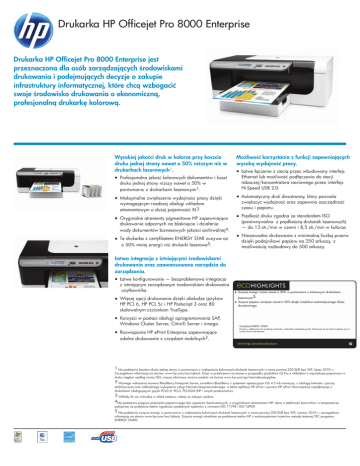 Drukarka HP Officejet Pro 8000 Enterprise Drukarka HP Officejet Pro 8000 Enterprise jest przeznaczona dla osób zarządzających środowiskami drukowania i podejmujących decyzje o zakupie infrastruktury informatycznej, które chcą wzbogacić swoje środowisko drukowania o ekonomiczną, profesjonalną drukarkę kolorową. Wysokiej jakości druk w kolorze przy koszcie druku jednej strony nawet o 50% niższym niż w drukarkach laserowych1. ● Profesjonalna jakość kolorowych dokumentów i koszt druku jednej strony niższy nawet o 50% w porównaniu z drukarkami laserowymi1. ● Maksymalne zwiększenie wydajności pracy dzięki wymagającym rzadszej obsługi wkładom atramentowym o dużej pojemności XL3. ● Oryginalne atramenty pigmentowe HP zapewniające drukowanie odpornych na blaknięcie i działanie wody dokumentów biznesowych jakości archiwalnej4. ● Ta drukarka z certyfikatem ENERGY STAR zużywa aż o 50% mniej energii niż drukarki laserowe5. Możliwość korzystania z funkcji zapewniających wysoką wydajność pracy. ● Łatwe łączenie z siecią przez wbudowany interfejs Ethernet lub możliwość podłączenia do stacji roboczej/koncentratora sieciowego przez interfejs Hi-Speed USB 2.0. ● Automatyczny druk dwustronny, który pozwala zwiększyć wydajność oraz zapewnia oszczędność czasu i papieru. ● Prędkość druku zgodna ze standardem ISO (porównywalna z prędkością drukarek laserowych) — do 13 str./min w czerni i 8,5 str./min w kolorze. ● Niezawodne drukowanie z minimalną liczbą przerw dzięki podajnikowi papieru na 250 arkuszy, z możliwością rozbudowy do 500 arkuszy. Łatwa integracja z istniejącymi środowiskami drukowania oraz zaawansowane narzędzia do zarządzania. ● Łatwe konfigurowanie — bezproblemowa integracja z istniejącym zarządzanym środowiskiem drukowania użytkownika. ● Więcej opcji drukowania dzięki obsłudze języków HP PCL 6, HP PCL 5c i HP Postscript 3 oraz 80 skalowalnym czcionkom TrueType. ● Korzyści w postaci obsługi oprogramowania SAP, Windows Cluster Server, Citrix® Server i innego. ● Rozwiązanie HP ePrint Enterprise zapewniające zdalne drukowanie z urządzeń mobilnych2. ● Zużycie energii niższe nawet o 50% w porównaniu z kolorowymi drukarkami laserowymi5. ● Zużycie papieru mniejsze nawet o 50% dzięki modułowi automatycznego druku dwustronnego. Certyfikat ENERGY STAR® Prosimy o oddawanie do recyklingu drukarek i materiałów eksploatacyjnych. Informacje na ten temat znajdują się na naszej stronie internetowej. 1 Na podstawie kosztów druku jednej strony w porównaniu z większością kolorowych drukarek laserowych w cenie poniżej 200 EUR bez VAT, lipiec 2010 r.; Szczegółowe informacje na stronie: www.hp.com/eur/ojfacts. Koszt w przeliczeniu na stronę w przypadku produktów OJ Pro z wkładami o największej pojemności w druku ciągłym według normy ISO; więcej informacji można znaleźć na stronie www.hp.com/go/learnaboutsupplies. 2 Wymaga wdrożenia serwera BlackBerry Enterprise Server, smartfonu BlackBerry z systemem operacyjnym OS 4.5 lub nowszym, z obsługą Internetu i poczty elektronicznej oraz oddzielnego wykupienia usługi Internetu bezprzewodowego, a także aplikacji HP ePrint i serwera HP ePrint. Rozwiązanie współpracuje z drukarkami obsługującymi języki PCL5/6, PCL3, PCL3GUI (HP i innych producentów). 3 Wkłady XL nie wchodzą w skład zestawu, należy je zakupić osobno. 4Na podstawie prognoz przemysłu papierniczego dot. papierów bezkwasowych, z oryginalnymi atramentami HP; dane o stabilności barwników w temperaturze pokojowej na podstawie testów zgodności podobnych systemów z normami ISO 11798 i ISO 18909. 5 Na podstawie zużycia energii w porównaniu z większością kolorowych drukarek laserowych w cenie poniżej 200 EUR bez VAT, marzec 2010 r.; szczegółowe informacje na stronie www.hp.com/eur/ojfacts. Zużycie energii określane na podstawie testów HP z wykorzystaniem kryteriów metody testowej TEC programu ENERGY STAR®. Drukarka HP Officejet Pro 8000 Enterprise DANE TECHNICZNE Technologia termiczna HP Inkjet W czerni (best): Do 600 x 600 dpi; Kolor (best): Do 600 x 600 dpi Prędkość druku Czarny (tryb roboczy): Do 15 str./min; Kolorowy (tryb roboczy): Do 14 str./min W czerni (best): Do 3,5 str./min; Czarny (ISO): Do 13 str./min; Kolorowy (ISO): Do 8,5 str./min Możliwości drukarki Druk bez marginesów: Brak Czujnik automatycznie rozpoznający rodzaj papieru: Brak; Obsługiwane drukowanie bezpośrednie: Brak Standardowe języki drukarki HP PCL 6, PCL 5, PS Zgodne typy atramentu Atrament barwnikowy (kolorowy); Atrament pigmentowy (czarny) Standardowe podłączenia 1 Hi-Speed USB 2.0; 1 Ethernet Przygotowany do pracy w sieci Standardowy (wbudowana karta Ethernet) Możliwości pracy w sieci Wbudowany Możliwość pracy bezprzewodowej Opcjonalny, dostępny wraz z zakupem akcesorium sprzętowego Panel sterowania 8 przycisków sterowania na panelu przednim (Power (Zasilanie), Resume (Wznów), Cancel (Anuluj), Help (Pomoc), Left navigation (W lewo), Right navigation (W prawo), OK, Back (Wstecz)); 3 diody LED (1 dioda przyciągająca uwagę (Attention), 1 dioda zalecająca wznowienie druku (Resume), 1 dioda sygnalizująca stan zasilania (Power) Normatywny cykl pracy (miesięcznie, Do 15000 stron Technologia druku Środowisko pracy Rozdzielczość druku Certyfikaty Zawartość opakowania Gwarancja Materiały eksploatacyjne format A4) Nośniki Obsługiwane formaty nośników Własne wymiary nośników Obsługiwana gramatura nośników Obsługa papieru Pamięć standardowa prędkość procesora Zgodne systemy operacyjne Minimalne wymagania systemowe Dołączone oprogramowanie Wymiary waga produktu Zasilanie Akustyka Papier (do druku broszur, do drukarek atramentowych, zwykły), papier fotograficzny, koperty, karty (indeksowe), folie A4; A5; A6; B5 (JIS); 10 x 15 cm; koperty (DL, C6, C5) Od 76 x 127 do 216 x 356 mm Podajnik 1: Od 60 do 250 g/m2 Podajnik papi