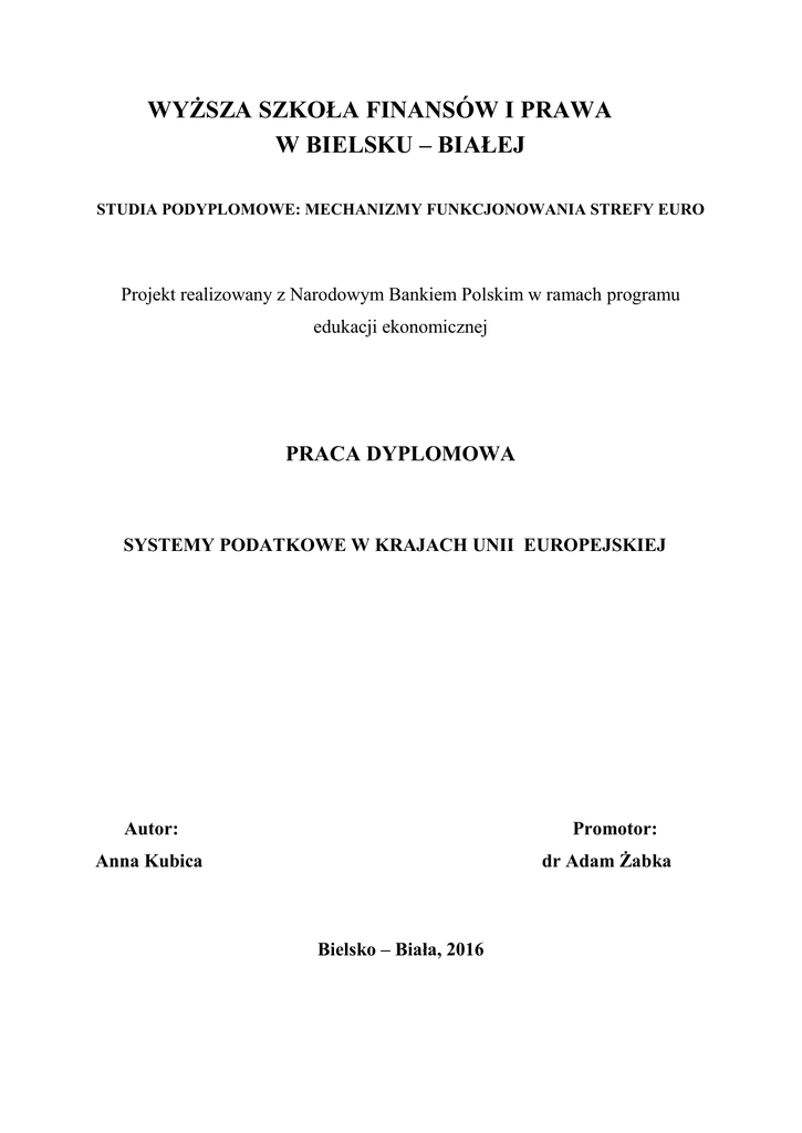 WYŻSZA SZKOŁA FINANSÓW I PRAWA W BIELSKU – BIAŁEJ STUDIA PODYPLOMOWE: MECHANIZMY FUNKCJONOWANIA STREFY EURO Projekt realizowany z Narodowym Bankiem Polskim w ramach programu edukacji ekonomicznej PRACA DYPLOMOWA SYSTEMY PODATKOWE W KRAJACH UNII EUROPEJSKIEJ Autor: Promotor: dr Adam Żabka Anna Kubica Bielsko – Biała, 2016 Strona |1 Spis treści Wstęp ......................................................................................................................................... 2 Rozdział I. Finanse publiczne w gospodarce......................................................................... 3 1.1 Funkcje finansów publicznych ......................................................................................... 3 1.2 Funkcje podatków ............................................................................................................ 8 1.3 Klasyfikacja podatków ................................................................................................... 11 Rozdział II. Charakterystyka systemów podatkowych w krajach Unii Europejskiej .... 16 2.1 Obecne regulacje dotyczące harmonizacji podatków w krajach Unii Europejskiej ...... 16 2.2 Konkurencyjność systemów podatkowych w krajach Unii Europejskiej ...................... 20 2.3 Potrzeba i ogólne założenia dalszej harmonizacji i optymalizacji systemów podatkowych ........................................................................................................................ 23 Rozdział III. Analiza systemów podatkowych w krajach Unii Europejskiej .................... 27 3.1 Stawki podatkowe w krajach Unii Europejskiej ............................................................ 27 3.2 Udział dochodów podatkowych w PKB poszczególnych państw członkowskich........ 33 3.3 Porównanie systemów podatkowych krajów Unii Europejskiej .................................... 36 Podsumowanie ........................................................................................................................ 38 Bibliografia............................................................................................................................... 40 Spis tabel ................................................................................................................................. 41 Spis wykresów ......................................................................................................................... 41 Strona |2 Wstęp Systemy podatkowe mają szczególne znaczenie dla rozwoju społeczno-gospodarczego każdego kraju. Podatki stanowią bowiem główne źródło dochodów budżetowych państw a co za tym idzie decydują o ich bezpieczeństwie finansowym i możliwościach rozwoju. Konstrukcje systemów podatkowych w krajach Unii Europejskiej wynikają z założeń gospodarki rynkowej i służą nadrzędnym interesom ogółu społeczeństwa. Należy jednak wyraźnie podkreślić, że pomimo licznych zmian , obarczone są one wadami i wymagają ciągłego doskonalenia mającego na celu ich dostosowanie do nowych warunków gospodarowania. Dlatego celem pracy jest porównanie systemów podatkowych państw wchodzących w skład Unii Europejskiej oraz ocena stopnia ich harmonizacji . Praca składa się z trzech rozdziałów oraz podsumowania. W pierwszym rozdziale zostaną omówione funkcje finansów publicznych i dochody podatkowe jako źródło dochodów budżetu państwa oraz budżetów samorządowych. Przeanalizowana zostanie struktura dochodów ogółem w sektorze instytucji rządowych i samorządowych, w 2015r. dla 28 krajów Unii Europejskiej . Ponadto przedstawiona zostanie funkcja podatków oraz ich klasyfikacja według rozmaitych kryteriów. Rozdział drugi przedstawia regulacje dotyczące harmonizacji podatków , wynikające wprost z Traktatu ustanawiającego Wspólnotę Europejską oraz wszelkie działania w celu ich stosowania. W rozdziale tym omówione zostaną negatywne i pozytywne skutki konkurowania poprzez stawki podatkowe oraz wpływ tej konkurencji na zachowanie osób fizycznych i podmiotów gospodarczych. Potrzeba i ogólne założenia dalszej harmonizacji będą punktem wyjścia do kolejnego rozdziału. Rozdział trzeci koncentruje się na analizie i porównaniu systemów podatkowych poszczególnych krajów Unii Europejskiej. W tym celu najpierw zostały porównane górne stawki podatku dochodowego od osób prawnych, podatku dochodowego od osób fizycznych, podatku od towarów i usług oraz składek na ubezpieczenie społeczne w poszczególnych krajach Unii Europejskiej oraz ich zmiany w latach 2006-2015. Następnie porównano dochody z głównych kategorii podatków i składek na ubezpieczenie społeczne , w sektorze instytucji rządowych i samorządowych , w krajach Unii Europejskiej, w latach 2006-2015 jako % PKB. W pracy wykorzystano literaturę na temat finansów publicznych, podatków oraz regulacji dotyczących ich harmonizacji. Przytoczono artykuły naukowe z zakresu budowy systemów podatkowych. Część informacji pochodzi ze stron internetowych. Strona |3 Rozdział I. Finanse publiczne w gospodarce Finanse publiczne to z jednej strony gromadzenie środków dla realizacji funkcji państwa, z drugiej zaś ich wydawanie zgodnie z obowiązującym prawem. Do czynników społeczno - politycznych określających funkcje finansów publicznych zalicza się: zaspokajanie potrzeb zbiorowych społeczeństwa oraz ochronę grup najsłabszych ekonomicznie z powodów od siebie Do potrzeb zbiorowych społeczeństwa w znacznym stopniu niezależnych. zalicza się np. potrzeby bezpieczeństwa, zewnętrznego i wewnętrznego, funkcjonowania administracji publicznej, utrzymanie szlaków komunikacyjnych, ochrona przyrody. Korzyści z zaspokajania tych potrzeb nie podlegają podziałowi na poszczególnych obywateli. Są finansowane ze środków publicznych. Inne potrzeby związane np. z edukacją i ochroną zdrowia mogą być zaspokajane zarówno indywidualnie
