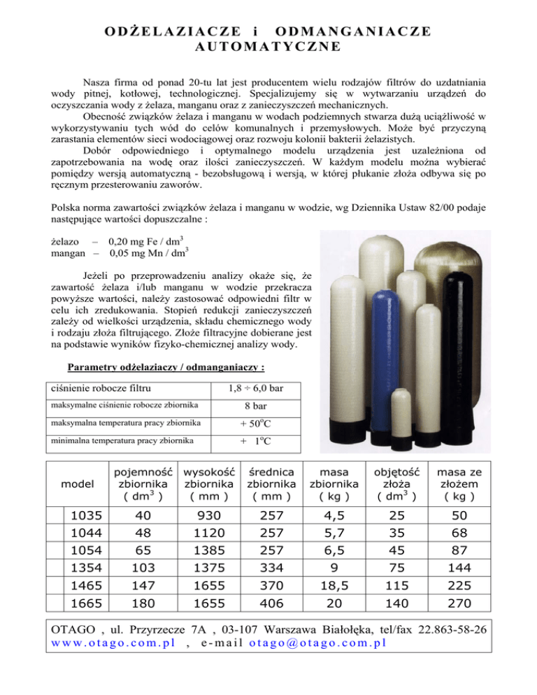 ODŻELAZIACZE i ODMANGANIACZE AUTOMATYCZNE Nasza firma od ponad 20-tu lat jest producentem wielu rodzajów filtrów do uzdatniania wody pitnej, kotłowej, technologicznej. Specjalizujemy się w wytwarzaniu urządzeń do oczyszczania wody z żelaza, manganu oraz z zanieczyszczeń mechanicznych. Obecność związków żelaza i manganu w wodach podziemnych stwarza dużą uciążliwość w wykorzystywaniu tych wód do celów komunalnych i przemysłowych. Może być przyczyną zarastania elementów sieci wodociągowej oraz rozwoju kolonii bakterii żelazistych. Dobór odpowiedniego i optymalnego modelu urządzenia jest uzależniona od zapotrzebowania na wodę oraz ilości zanieczyszczeń. W każdym modelu można wybierać pomiędzy wersją automatyczną - bezobsługową i wersją, w której płukanie złoża odbywa się po ręcznym przesterowaniu zaworów. Polska norma zawartości związków żelaza i manganu w wodzie, wg Dziennika Ustaw 82/00 podaje następujące wartości dopuszczalne : żelazo – 0,20 mg Fe / dm3 mangan – 0,05 mg Mn / dm3 Jeżeli po przeprowadzeniu analizy okaże się, że zawartość żelaza i/lub manganu w wodzie przekracza powyższe wartości, należy zastosować odpowiedni filtr w celu ich zredukowania. Stopień redukcji zanieczyszczeń zależy od wielkości urządzenia, składu chemicznego wody i rodzaju złoża filtrującego. Złoże filtracyjne dobierane jest na podstawie wyników fizyko-chemicznej analizy wody. Parametry odżelaziaczy / odmanganiaczy : ciśnienie robocze filtru 1,8 ÷ 6,0 bar maksymalne ciśnienie robocze zbiornika 8 bar maksymalna temperatura pracy zbiornika + 50oC minimalna temperatura pracy zbiornika + 1o C model pojemność wysokość zbiornika zbiornika 3 ( dm ) ( mm ) średnica zbiornika ( mm ) masa zbiornika ( kg ) objętość złoża ( dm3 ) masa ze złożem ( kg ) 1035 40 930 257 4,5 25 50 1044 48 1120 257 5,7 35 68 1054 65 1385 257 6,5 45 87 1354 103 1375 334 9 75 144 1465 147 1655 370 18,5 115 225 1665 180 1655 406 20 140 270 OTAGO , ul. Przyrzecze 7A , 03-107 Warszawa Białołęka, tel/fax 22.863-58-26 www.otago.com.pl , e-mail [email protected] by-pass wê¿e a a a a a a antywibracyjne a a a a a a a a a a a a a a a a a a wlot wody surowej dysza rozpryskowa wylot wody uzdatnionej pop³uczyny wylot filtra wlot filtra dpowietrznik zawór bezp. 5 bar by-pass a hydrofor zawór zwrotny a a a a a a a wy³¹cznik ciœnienia filtr aspirator wlot wody do pompy a a a a a SYSTEM UZDATNIANIA WODY Na proces technologiczny odżelaziania i odmanganiania wody składa się : - samoczynne napowietrzanie wody surowej przy użyciu aspiratora - mieszanie i magazynowanie wody w zbiorniku hydroforowym ( tradycyjnym, bez membrany ) - filtracja na złożu w zbiorniku filtru - okresowe płukanie złoża poprzez zmianą kierunku przepływu wody i odprowadzenie popłuczyn W skład stacji uzdatniania wody wchodzą następujące elementy : 1. 2. 3. 4. 5. 6. 7. 8. 9. 10. 11. 12. 13. 14. 15. Pompa wodna Zbiornik ciśnieniowy (hydrofor) Aspirator Zbiornik filtru z rurą dystrybucyjną i złożem filtracyjnym Automatyczna głowica sterująca Dysza rozpryskowa montowana w zbiorniku hydroforowym Zawór obejściowy (by-pass) Rura do odprowadzania popłuczyn Wyłącznik ciśnienia Manometr wylotowy umożliwiający odczyt spadku ciśnienia Zawór zwrotny Zawór bezpieczeństwa nastawiony na 5 bar Elastyczne węże przyłączeniowe Odpowietrznik Drożną kratkę ściekową mogącą odebrać popłuczyny i skutki ewentualnego wycieku z instalacji UWAGA : pozycje wyróżnione stanowią komplet wchodzący w skład dostarczanego zestawu. Cena podana w cenniku obejmuje zestaw. 1. ASPIRATOR Aspirator jest to urządzenie, które służy do napowietrzania wody w procesie jej oczyszczania z żelaza i manganu. Efektem napowietrzania wody jest przemiana związków żelaza łatwo rozpuszczalnych w wodzie w związki trudno rozpuszczalne, które mogą zostać zatrzymane na złożu filtracyjnym. Aspirator pozwala także na utrzymywania stałego poziomu poduszki powietrznej w zbiorniku hydroforowym. Przepływająca przez zwężkę woda wywołuje podciśnienie w dyszy, czego konsekwencją jest zasysanie powietrza. Konstrukcja aspiratora produkowanego przez „OTAGO” oparta jest na zwężce (inżektorze) Venturiego, która wykorzystuje efekt różnicy ciśnień między jej wlotem a wylotem. Aspirator ma prostą konstrukcję. Pozwala to na łatwy montaż i nieskomplikowaną, bezawaryjną obsługę. Zwężka Venturiego umieszczona jest w by-passie. Zawór kulowy pełni rolę regulatora ciśnienia między wlotem a wylotem inżektora. Na dyszy zasysającej umieszczony jest zawór zwrotny. Uwagi montażowe dotyczące aspiratora : • • • • • • Aspirator należy zainstalować w sieci hydraulicznej między pompą a zbiornikiem hydroforowym Zalecamy, aby zamontować go zaworem zwrotnym pionowo do góry Aspirator jest urządzeniem typu WE/WY, należy więc zamontować go tak, aby woda przepływała w kierunku zgodnym ze strzałką wybitą na zwężce inżektorowej. Do współpracy z aspiratorem należy użyć zbiornik hydroforowy bez przepony (membrany). Pomiędzy aspiratorem a zbiornikiem hydroforowym należy zamontować zawór zwrotny. Na czas montażu należy rozkręcić oba półśrubunki i zdjąć zwężkę z kolanami. 2. ZBIORNIK HYDROFOROWY Do współpracy z filtrem należy zainstalować zbiornik hydroforowy tzw. tradycyjny (bezprzeponowy), sposób podłączenia zbiornika musi być zgodny z następującymi zaleceniami : • • • 3. wodę do zbiornika należy wprowadzić przez otwór górny wskazane jest zastosowanie na wlocie do zbiornika dyszy rozpryskowej, dodatkowo miesza ona wodę z powietrzem w otworze dolnym zbiornika należy zamontować zawór spustowy FILTR ODŻELAZIAJĄCO - ODMANGANIAJĄCY Filtr zbudowany jest z następujących elementów : 1. 2. 3. 4. zbiornik nierdzewny z tworzywa sztucznego (włókno szklane pokryte żywicą epoksydową) głowica sterująca automatyc
