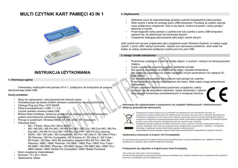 MULTI CZYTNIK KART PAMIĘCI 43 IN 1 2. Użytkowanie • • • • Delikatnie wsuń do odpowiedniego gniazda czytnika kompatybilną kartę pamięci. Włóż czytnik z kartą do wolnego portu USB komputera. Poczekaj aż system wykryje nowo podłączone urządzenie. Gdy to się stanie, można korzystać z karty pamięci włożonej w czytnik. Przed wyjęciem karty pamięci z czytnika kart lub czytnika z portu USB komputera upewnić się, że zakończyła się transmisja danych. Urządzenie obsługuje jednocześnie tylko jeden nośnik danych. Jeśli czytnik kart nie jest znajdowany jako urządzenie przez Windows Explorer, to należy wyjąć czytnik z portu USB i włożyć ponownie - będzie ono wykrywane powtórnie. Jeśli nadal nie działa, to należy spróbować podłączyć czytnik pod inny port USB. L P . IN X 3. Uwagi i środki ostrożności • INSTRUKCJA UŻYTKOWANIA O R LL T • • 1. Informacje ogólne Uniwersalny multiczytnik kart pamięci 43 in 1, podłączany do komputera za pomocą wbudowanego kabla USB. A . W W Cechy produktu: • • • • • • • • • • • • • • Służy do zapisywania i odczytywania kart różnych typów. Charakteryzuje się bardzo krótkim okresem oczekiwania na odczytanie karty. Obsługa Plug and Play i HOT-SWAP. Pełna kompatybilność z USB 1.1 i 2.0. Czytnik posiada chowany kabel USB. Bardzo łatwa instalacja, wystarczy podłączyć do wolnego portu USB komputera system automatycznie zainstaluje urządzenie. Pracuje w systemach: Windows 98SE, NT, ME, 2000, XP i nowszych. Odczytuje karty: • M2 / T-Flash / Micro SD / Micro SDHC • MS / MS MG / MS Pro MG / HS MS Pro /MG / MS Duo / MS Duo MG / MS Pro Duo MG / HS MS Pro Duo MG / MS Pro Duo PSP / MS Pro Duo Gaming • SDHC / SD / SD Ultra / SD Compatible / SD Pro / SD Ultra II / SD Ultra II Plus / SD Pleomax / SD Pro Compatible / SD Extreme III / SD Ultra X / SD Turbo / SD Super / SD Max / Mini SD (potrzebny adapter)/ Mini SD Pro / Mini SD Pleomax / MMC / MMC Pleomax / HS MMC / MMC Plus / MMC Plus Turbo / RS MMC / RS MMC /Pleomax / RS MMC Speed / RS MMC Max / MMC Pro / MMC Mobile / MMC Mobile Pro Compatible / MMC Mobile Pocketnet Kolor urządzenia: białoniebieski Wymiary: 73 x 24 x 15mm Opakowanie: blister W Przechowuj urządzenie z dala od źródła wilgoci, w suchym i wolnym od zanieczyszczeń miejscu. Czyść urządzenie za pomocą suchej, delikatnej szmatki. Nie narażaj urządzenia na ekstremalnie niskie i wysokie temperatury. Nie podłączaj urządzenia do źródła napięcia o innych parametrach niż napięcie 5V, prąd 500mA Nie wkładać jednocześnie kilku różnych kart pamięci do czytnika. Przechowywać w miejscu niedostępnym dla dzieci. Małe części mogą spowodować zadławienie. W celu uzyskania maksymalnej żywotności urządzenia, należy stosować się do wszystkich ostrzeżeń, zasad ostrożności i zaleceń dotyczących konserwacji przedstawionych w niniejszej instrukcji. •