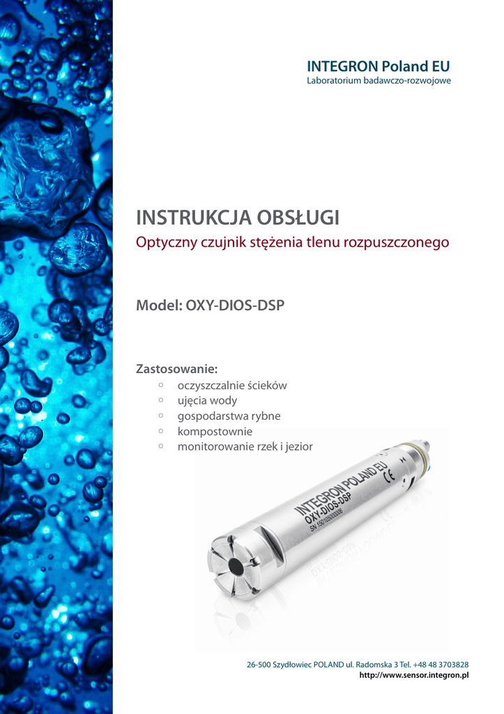 INTEGRON Poland EU Laboratorium badawczo-rozwojowe INSTRUKCJA OBSŁUGI Optyczny czujnik stężenia tlenu rozpuszczonego Model: OXY-DIOS-DSP Zastosowanie: ◦ ◦ ◦ ◦ ◦ oczyszczalnie ścieków ujęcia wody gospodarstwa rybne kompostownie monitorowanie rzek i jezior 26-500 Szydłowiec POLAND ul. Radomska 3 Tel. +48 48 3703828 http://www.sensor.integron.pl Data: 11-05-2016 Wersja: 1.33 Szydłowiec POLAND 26-500 Szydłowiec POLAND ul. Radomska 3 Tel. +48 48 3703828 http://www.sensor.integron.pl Spis treści ........................................................................................................................................ Spis treści 1. Specyfikacja techniczna.................................................................................................................................................5 2. Zawartość zestawu..........................................................................................................................................................9 3. Rysunek wymiarowy.....................................................................................................................................................10 4. Rysunek poglądowy.....................................................................................................................................................11 5. Rysunek złożeniowy.....................................................................................................................................................12 6. Podłączenie elektryczne..............................................................................................................................................14 6.1. Złącze M12.............................................................................................................................................................14 6.2. Podłączenie wyjść sterujących........................................................................................................................15 6.3. Podłączenie magistral CANopen / MODBUS..............................................................................................16 6.4. Podłączenie pętli prądowej 4-20mA.............................................................................................................17 7. Demontaż / montaż obudowy czujnika.................................................................................................................18 7.1. Demontaż.............................................................................................................................................................. 18 7.2. Montaż....................................................................................................................................................................18 8. Okno pomiarowe...........................................................................................................................................................19 8.1. Demontaż.............................................................................................................................................................. 19 8.2. Montaż....................................................................................................................................................................20 8.3. Widok okna pomiarowego i głowicy.............................................................................................................21 9. Montaż czujnika na wsporniku.................................................................................................................................22 10. Zasada działania..........................................................................................................................................................24 11. Metodologia kalibracji...............................................................................................................................................29 12. Oprogramowanie konfiguracyjne.........................................................................................................................30 12.1. Instalacja sterowników systemowych........................................................................................................30 12.2. Obsługa aplikacji...............................................................................................................................................31 12.3. Ekran główny......................................................................................................................................................31 12.4. Aktywacja fabrycznego okna pomiarowego...........................................................................................33 12.5. Struktura menu..................................................................................................................................................34 12.6. Opis funkcji menu.............................................................................................................................................38 12.6.1. Data i czas................................................................................................................................................38 12.6.2. Interfejsy komunikacyjne Loop 4-20mA, CANopen, MODBUS ............................................38 12.6.3. Automatyczne czyszczenie okna pomiarowego.........................................................................45 12.6.4. Sterowanie dmuchawą powietrza...................................................................................................46 12.6.5. Interwał pomiarowy i filtr uśredniający..........................................................................................47 12.6.6. Kalibracja i instalacja nowego okna pomiarowego....................................................................48 12.6.7. Zmiana oprogr