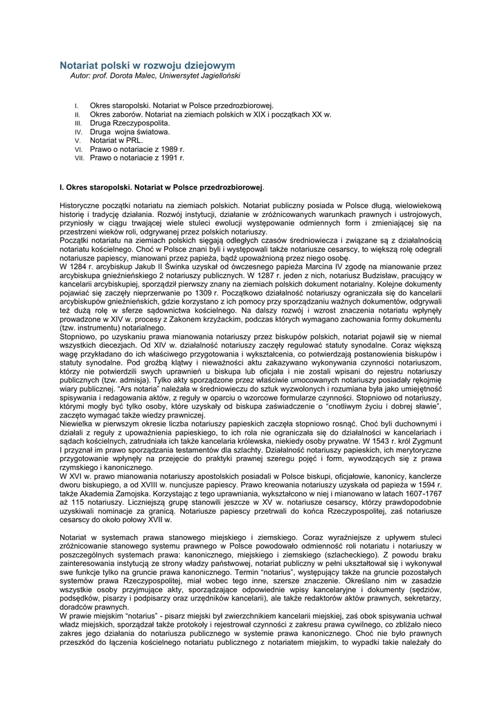 Notariat polski w rozwoju dziejowym Autor: prof. Dorota Malec, Uniwersytet Jagielloński I. II. III. IV. V. VI. VII. Okres staropolski. Notariat w Polsce przedrozbiorowej. Okres zaborów. Notariat na ziemiach polskich w XIX i początkach XX w. Druga Rzeczypospolita. Druga wojna światowa. Notariat w PRL. Prawo o notariacie z 1989 r. Prawo o notariacie z 1991 r. I. Okres staropolski. Notariat w Polsce przedrozbiorowej. Historyczne początki notariatu na ziemiach polskich. Notariat publiczny posiada w Polsce długą, wielowiekową historię i tradycję działania. Rozwój instytucji, działanie w zróżnicowanych warunkach prawnych i ustrojowych, przyniosły w ciągu trwającej wiele stuleci ewolucji występowanie odmiennych form i zmieniającej się na przestrzeni wieków roli, odgrywanej przez polskich notariuszy. Początki notariatu na ziemiach polskich sięgają odległych czasów średniowiecza i związane są z działalnością notariatu kościelnego. Choć w Polsce znani byli i występowali także notariusze cesarscy, to większą rolę odegrali notariusze papiescy, mianowani przez papieża, bądź upoważnioną przez niego osobę. W 1284 r. arcybiskup Jakub II Świnka uzyskał od ówczesnego papieża Marcina IV zgodę na mianowanie przez arcybiskupa gnieźnieńskiego 2 notariuszy publicznych. W 1287 r. jeden z nich, notariusz Budzisław, pracujący w kancelarii arcybiskupiej, sporządził pierwszy znany na ziemiach polskich dokument notarialny. Kolejne dokumenty pojawiać się zaczęły nieprzerwanie po 1309 r. Początkowo działalność notariuszy ograniczała się do kancelarii arcybiskupów gnieźnieńskich, gdzie korzystano z ich pomocy przy sporządzaniu ważnych dokumentów, odgrywali też dużą rolę w sferze sądownictwa kościelnego. Na dalszy rozwój i wzrost znaczenia notariatu wpłynęły prowadzone w XIV w. procesy z Zakonem krzyżackim, podczas których wymagano zachowania formy dokumentu (tzw. instrumentu) notarialnego. Stopniowo, po uzyskaniu prawa mianowania notariuszy przez biskupów polskich, notariat pojawił się w niemal wszystkich diecezjach. Od XIV w. działalność notariuszy zaczęły regulować statuty synodalne. Coraz większą wagę przykładano do ich właściwego przygotowania i wykształcenia, co potwierdzają postanowienia biskupów i statuty synodalne. Pod groźbą klątwy i nieważności aktu zakazywano wykonywania czynności notariuszom, którzy nie potwierdzili swych uprawnień u biskupa lub oficjała i nie zostali wpisani do rejestru notariuszy publicznych (tzw. admisja). Tylko akty sporządzone przez właściwie umocowanych notariuszy posiadały rękojmię wiary publicznej. “Ars notaria” należała w średniowieczu do sztuk wyzwolonych i rozumiana była jako umiejętność spisywania i redagowania aktów, z reguły w oparciu o wzorcowe formularze czynności. Stopniowo od notariuszy, którymi mogły być tylko osoby, które uzyskały od biskupa zaświadczenie o “cnotliwym życiu i dobrej sławie”, zaczęto wymagać także wiedzy prawniczej. Niewielka w pierwszym okresie liczba notariuszy papieskich zaczęła stopniowo rosnąć. Choć byli duchownymi i działali z reguły z upoważnienia papieskiego, to ich rola nie ograniczała się do działalności w kancelariach i sądach kościelnych, zatrudniała ich także kancelaria królewska, niekiedy osoby prywatne. W 1543 r. król Zygmunt I przyznał im prawo sporządzania testamentów dla szlachty. Działalność notariuszy papieskich, ich merytoryczne przygotowanie wpłynęły na przejęcie do praktyki prawnej szeregu pojęć i form, wywodzących się z prawa rzymskiego i kanonicznego. W XVI w. prawo mianowania notariuszy apostolskich posiadali w Polsce biskupi, oficjałowie, kanonicy, kanclerze dworu biskupiego, a od XVIII w. nuncjusze papiescy. Prawo kreowania notariuszy uzyskała od papieża w 1594 r. także Akademia Zamojska. Korzystając z tego uprawniania, wykształcono w niej i mianowano w latach 1607-1767 aż 115 notariuszy. Liczniejszą grupę stanowili jeszcze w XV w. notariusze cesarscy, którzy prawdopodobnie uzyskiwali nominacje za granicą. Notariusze papiescy przetrwali do końca Rzeczypospolitej, zaś notariusze cesarscy do około połowy XVII w. Notariat w systemach prawa stanowego miejskiego i ziemskiego. Coraz wyraźniejsze z upływem stuleci zróżnicowanie stanowego systemu prawnego w Polsce powodowało odmienność roli notariatu i notariuszy w poszczególnych systemach prawa: kanonicznego, miejskiego i ziemskiego (szlacheckiego). Z powodu braku zainteresowania instytucją ze strony władzy państwowej, notariat publiczny w pełni ukształtował się i wykonywał swe funkcje tylko na gruncie prawa kanonicznego. Termin “notarius”, występujący także na gruncie pozostałych systemów prawa Rzeczypospolitej, miał wobec tego inne, szersze znaczenie. Określano nim w zasadzie wszystkie osoby przyjmujące akty, sporządzające odpowiednie wpisy kancelaryjne i dokumenty (sędziów, podsędków, pisarzy i podpisarzy oraz urzędników kancelarii), ale także redaktorów aktów prawnych, sekretarzy, doradców prawnych. W prawie miejskim “notarius” - pisarz miejski był zwierzchnikiem kancelarii miejskiej, zaś obok spisywania uchwał władz miejskich, sporządzał także protokoły i rejestrował czynności z zakresu prawa cywilnego, co zbliżało nieco zakres jego działania do notariusza publicznego w systemie prawa kanonicznego. Choć nie było prawnych przeszkód do łączenia kościelnego notariatu publicznego z notariatem miejskim, to wypadki takie należały do rzadkości. Urząd pisarza miejskiego- notariusza traktowano jako publiczny, a do właściwego wykonywania przez niego powierzonych mu czynności przykładano dużą wagę. Za wystawienie wadliwego dokumentu groziła mu kara obcięcia ręki. Surowo karano także fałszerstwo dokumentu. Wśród notariuszy miejskich od XVI w. dominowały osoby świeckie, pobierające za swą pracę wynagrodzenie od miasta