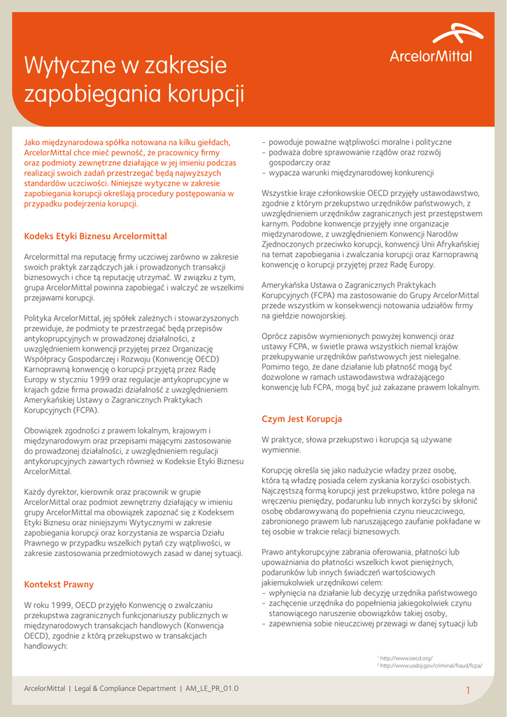 Wytyczne w zakresie zapobiegania korupcji Jako międzynarodowa spółka notowana na kilku giełdach, ArcelorMittal chce mieć pewność, że pracownicy firmy oraz podmioty zewnętrzne działające w jej imieniu podczas realizacji swoich zadań przestrzegać będą najwyższych standardów uczciwości. Niniejsze wytyczne w zakresie zapobiegania korupcji określają procedury postępowania w przypadku podejrzenia korupcji. Kodeks Etyki Biznesu Arcelormittal Arcelormittal ma reputację firmy uczciwej zarówno w zakresie swoich praktyk zarządczych jak i prowadzonych transakcji biznesowych i chce tą reputację utrzymać. W związku z tym, grupa ArcelorMittal powinna zapobiegać i walczyć ze wszelkimi przejawami korupcji. Polityka ArcelorMittal, jej spółek zależnych i stowarzyszonych przewiduje, że podmioty te przestrzegać będą przepisów antykoprupcyjnych w prowadzonej działalności, z uwzględnieniem konwencji przyjętej przez Organizację Współpracy Gospodarczej i Rozwoju (Konwencję OECD) Karnoprawną konwencję o korupcji przyjętą przez Radę Europy w styczniu 1999 oraz regulacje antykoprupcyjne w krajach gdzie firma prowadzi działalność z uwzględnieniem Amerykańskiej Ustawy o Zagranicznych Praktykach Korupcyjnych (FCPA). Obowiązek zgodności z prawem lokalnym, krajowym i międzynarodowym oraz przepisami mającymi zastosowanie do prowadzonej działalności, z uwzględnieniem regulacji antykorupcyjnych zawartych również w Kodeksie Etyki Biznesu ArcelorMittal. Każdy dyrektor, kierownik oraz pracownik w grupie ArcelorMittal oraz podmiot zewnętrzny działający w imieniu grupy ArcelorMittal ma obowiązek zapoznać się z Kodeksem Etyki Biznesu oraz niniejszymi Wytycznymi w zakresie zapobiegania korupcji oraz korzystania ze wsparcia Działu Prawnego w przypadku wszelkich pytań czy wątpliwości, w zakresie zastosowania przedmiotowych zasad w danej sytuacji. Kontekst Prawny W roku 1999, OECD przyjęło Konwencję o zwalczaniu przekupstwa zagranicznych funkcjonariuszy publicznych w międzynarodowych transakcjach handlowych (Konwencja OECD), zgodnie z którą przekupstwo w transakcjach handlowych: - powoduje poważne wątpliwości moralne i polityczne - podważa dobre sprawowanie rządów oraz rozwój gospodarczy oraz - wypacza warunki międzynarodowej konkurencji Wszystkie kraje członkowskie OECD przyjęły ustawodawstwo, zgodnie z którym przekupstwo urzędników państwowych, z uwzględnieniem urzędników zagranicznych jest przestępstwem karnym. Podobne konwencje przyjęły inne organizacje międzynarodowe, z uwzględnieniem Konwencji Narodów Zjednoczonych przeciwko korupcji, konwencji Unii Afrykańskiej na temat zapobiegania i zwalczania korupcji oraz Karnoprawną konwencję o korupcji przyjętej przez Radę Europy. Amerykańska Ustawa o Zagranicznych Praktykach Korupcyjnych (FCPA) ma zastosowanie do Grupy ArcelorMittal przede wszystkim w konsekwencji notowania udziałów firmy na giełdzie nowojorskiej. Oprócz zapisów wymienionych powyżej konwencji oraz ustawy FCPA, w świetle prawa wszystkich niemal krajów przekupywanie urzędników państwowych jest nielegalne. Pomimo tego, że dane działanie lub płatność mogą być dozwolone w ramach ustawodawstwa wdrażającego konwencję lub FCPA, mogą być już zakazane prawem lokalnym. Czym Jest Korupcja W praktyce, słowa przekupstwo i korupcja są używane wymiennie. Korupcję określa się jako nadużycie władzy przez osobę, która tą władzę posiada celem zyskania korzyści osobistych. Najczęstszą formą korupcji jest przekupstwo, które polega na wręczeniu pieniędzy, podarunku lub innych korzyści by skłonić osobę obdarowywaną do popełnienia czynu nieuczciwego, zabronionego prawem lub naruszającego zaufanie pokładane w tej osobie w trakcie relacji biznesowych. Prawo antykorupcyjne zabrania oferowania, płatności lub upoważniania do płatności wszelkich kwot pieniężnych, podarunków lub innych świadczeń wartościowych jakiemukolwiek urzędnikowi celem: - wpłynięcia na działanie lub decyzję urzędnika państwowego - zachęcenie urzędnika do popełnienia jakiegokolwiek czynu stanowiącego naruszenie obowiązków takiej osoby, - zapewnienia sobie nieuczciwej przewagi w danej sytuacji lub 1 2 ArcelorMittal | Legal & Compliance Department | AM_LE_PR_01.0 http://www.oecd.org/ http://www.usdoj.gov/criminal/fraud/fcpa/ 1 - zachęcania urzędnika do wykorzystania swoich wpływów w danej agencji rządowej, by zapewnić sobie pomoc w uzyskaniu lub zachowaniu działalności biznesowej w danym zakresie lub zlecenia takiej działalności wskazanej osobie. Sformułowanie uzyskanie lub zachowanie działalności biznesowej jest szeroko rozumiane jako korzyści biznesowe takie jak uzyskanie pozwolenia lub zwolnienia podatkowego. Ponadto, zgodnie z prawem mającym zastosowanie w niektórych krajach, na przykład w krajach które ratyfikowały Karnoprawną konwencję o korupcji wydaną przez Radę Europy, korupcję uznaje się za przestępstwo karne nawet jeśli wręczenie łapówki nie miałoby na celu uzyskania lub zachowania działalności biznesowej. Innymi słowy, akt korumpowania danej osoby celem skłonienia do niepodejmowania działań w ramach wykonywania swoich obowiązków stanowi przestępstwo karne. Oznacza to, że w odróżnieniu od amerykańskiej ustawy FCPA, prawo takich krajów (na przykład prawo Luksemburga gdzie zarejestrowana jest spółka ArcelorMittal oraz Królestwo Zjednoczone i Francja, gdzie ArcelorMittal ma biura korporacyjne) nie czyni wyjątku dla płatności przyspieszających wykonanie przez urzędnika czynności służbowych. Płatności przyspieszające wykonanie przez urzędnika czynności służbowych to forma łapówki, która: (i) opiewa na niewielką kwotę i oferowana jest urzędnikowi niskiego szczebla (ii) ma zabezpieczyć działanie lub usługę, do której dana osoba lub firma jest i tak uprawniona w sposób rutynowy i legalny (np. rutynowe załatwianie form