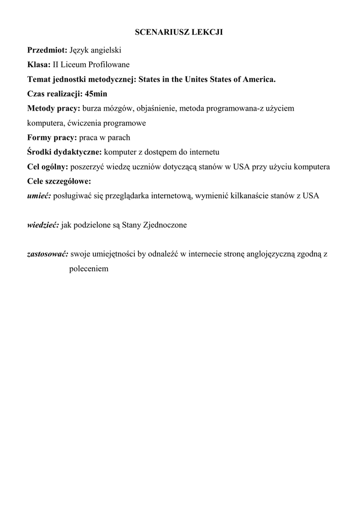 SCENARIUSZ LEKCJI Przedmiot: Język angielski Klasa: II Liceum Profilowane Temat jednostki metodycznej: States in the Unites States of America. Czas realizacji: 45min Metody pracy: burza mózgów, objaśnienie, metoda programowana-z uŜyciem komputera, ćwiczenia programowe Formy pracy: praca w parach Środki dydaktyczne: komputer z dostępem do internetu Cel ogólny: poszerzyć wiedzę uczniów dotyczącą stanów w USA przy uŜyciu komputera Cele szczegółowe: umieć: posługiwać się przeglądarka internetową, wymienić kilkanaście stanów z USA wiedzieć: jak podzielone są Stany Zjednoczone zastosować: swoje umiejętności by odnaleźć w internecie stronę anglojęzyczną zgodną z poleceniem PLAN LEKCJI Etap: I Faza wprowadzająca: 1. Czynności organizacyjne: sprawdzenie obecności, podanie tematu, włączenie komputerów. (3min) II Faza realizacyjna: 1.Przedstawienie tematu: na zapytanie nauczyciela o skojarzenia uczniów ze Stanami Zjednoczonymi; uczniowie podają swoje pomysły, np.: Statue of Liberty, New York. Trudniejsze nazwy nauczyciel wyjaśnia i opisuje reszcie klasy, np.: The Statue of Liberty was founded by French. (7min) 2. Ćwiczenia z nauczycielem: uczniowie wpisują podany przez nauczyciela adres strony internetowej: www.yourchildlearns.com/us_map.htm. Po wpisaniu adresu ukazuje się mapa USA, na której są zarysowane stany. Po kliknięciu myszką na jedno z pól ukazuje się jego nazwa i stolica danego stanu. Zadaniem uczniów jest zapoznać się z mapką oraz wyszukać odpowiedzi na pytania: - How many states are there? (50) - Which state is the biggest one? (Texas) - Which states are the neighbours of Washington State? (Oregano, Idaho) - Which states are the neighbours of Lake Superior? (Minnesota, Wiscounsin, Michigan) - What is the capital of California? (Sacramento) - Is North Dakota touching the ocean? (No) Nauczyciel pomaga pracującym w parach uczniom. Pytania są przeczytane i tłumaczone, a odpowiedzi sprawdzone z cała grupą. (15min) 3. Ćwiczenia samodzielne: Uczniowie w dalszym ciągu pracują w parach. Wybierają jeden ze stanów znajdujących się na mapce i w podanej wyszukiwarce stron internetowych szukają stron anglojęzycznych z informacjami na jego temat. Zadaniem uczniów jest wymienić 3 miejsca w danym stanie, które warto zobaczyć lub zwiedzić podczas ferii zimowych czy wakacji np.: Museum of Art. In New York. Nauczyciel monitoruje pracę uczniów, pomaga im. Następnie uczniowie odczytują wyszukane informacje. Na koniec lekcji nauczyciel jeszcze raz pyta uczniów o najwaŜniejsze informacje na temat Stanów Zjednoczonych i sprawdza co uczniowie zapamiętali z lekcji. (18min) III Faza podsumowująca: Uczniowie zapisują zadanie domowe: napisać 7 zdaniowe opowiadanie na temat wizyty z wybranym wcześniej przez siebie stanie w USA. (2min) IV Uwagi: Komputery ze względu na tempo pracy muszą być włączone zaraz na początku lekcji.