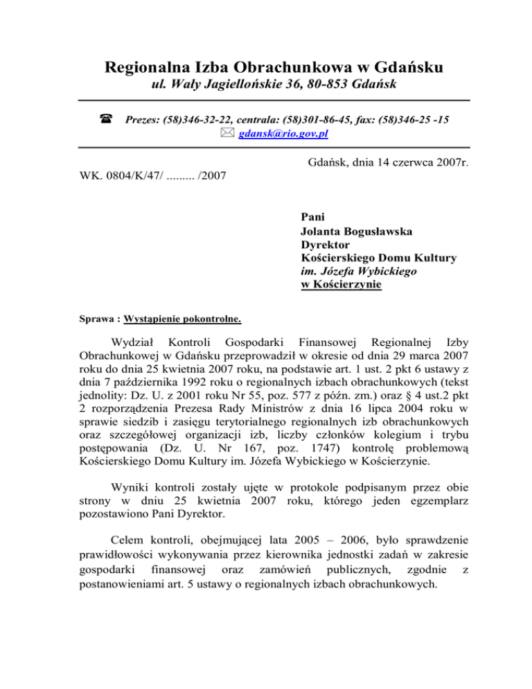 Regionalna Izba Obrachunkowa w Gdańsku ul. Wały Jagiellońskie 36, 80-853 Gdańsk ( Prezes: (58)346-32-22, centrala: (58)301-86-45, fax: (58)346-25 -15 * [email protected] Gdańsk, dnia 14 czerwca 2007r. WK. 0804/K/47/ ......... /2007 Pani Jolanta Bogusławska Dyrektor Kościerskiego Domu Kultury im. Józefa Wybickiego w Kościerzynie Sprawa : Wystąpienie pokontrolne. Wydział Kontroli Gospodarki Finansowej Regionalnej Izby Obrachunkowej w Gdańsku przeprowadził w okresie od dnia 29 marca 2007 roku do dnia 25 kwietnia 2007 roku, na podstawie art. 1 ust. 2 pkt 6 ustawy z dnia 7 października 1992 roku o regionalnych izbach obrachunkowych (tekst jednolity: Dz. U. z 2001 roku Nr 55, poz. 577 z późn. zm.) oraz § 4 ust.2 pkt 2 rozporządzenia Prezesa Rady Ministrów z dnia 16 lipca 2004 roku w sprawie siedzib i zasięgu terytorialnego regionalnych izb obrachunkowych oraz szczegółowej organizacji izb, liczby członków kolegium i trybu postępowania (Dz. U. Nr 167, poz. 1747) kontrolę problemową Kościerskiego Domu Kultury im. Józefa Wybickiego w Kościerzynie. Wyniki kontroli zostały ujęte w protokole podpisanym przez obie strony w dniu 25 kwietnia 2007 roku, którego jeden egzemplarz pozostawiono Pani Dyrektor. Celem kontroli, obejmującej lata 2005 – 2006, było sprawdzenie prawidłowości wykonywania przez kierownika jednostki zadań w zakresie gospodarki finansowej oraz zamówień publicznych, zgodnie z postanowieniami art. 5 ustawy o regionalnych izbach obrachunkowych. 2 Z dokonanych ustaleń kontroli wynika, że w kierowanej przez Panią jednostce znaczna część zadań wykonywana była niewłaściwie, z naruszeniem przepisów zawartych w aktach prawnych regulujących zasady gospodarki finansowej jednostek sektora finansów publicznych. Do najistotniejszych nieprawidłowości i uchybień stwierdzonych podczas badania zagadnień będących przedmiotem kontroli należy zaliczyć: 1) prowadzenie ksiąg rachunkowych z rażącym naruszeniem postanowień ustawy z dnia 29 września 1994r. o rachunkowości (tekst jednolity: Dz. U. z 2002r. Nr 76, poz. 694 z późn. zm.), poprzez: • zaniechanie prowadzenia ksiąg rachunkowych w latach 2005 – 2006 (księgi zostały sporządzone dopiero na wniosek inspektorów kontroli w dniu 23 kwietnia 2007r.), czym naruszono art. 12 ust. 1 pkt 1, ust. 2 pkt 1 i ust. 4, art. 13 ust. 1 art. 14 ust. 1 i 2 i art. 15 ust. 1 i 2 ww. ustawy – (str. 8-9 protokołu). Zgodnie z przywołanymi przepisami ustawy o rachunkowości księgi rachunkowe otwiera się na dzień rozpoczęcia działalności, którym jest dzień pierwszego zdarzenia wywołującego skutki o charakterze majątkowym lub finansowym, zamyka się je natomiast, m.in. na dzień kończący rok obrotowy. Ostateczne zamknięcie i otwarcie ksiąg rachunkowych jednostki kontynuującej działalność powinno nastąpić najpóźniej w ciągu 15 dni od dnia zatwierdzenia sprawozdania finansowego za rok obrotowy. Księgi rachunkowe obejmują zbiory zapisów księgowych, obrotów (sum zapisów) i sald, które tworzą: dziennik, księgę główną, księgi pomocnicze, zestawienia obrotów i sald ksiąg księgi głównej oraz sald kont ksiąg pomocniczych oraz wykaz składników aktywów i pasywów (inwentarz). Dziennik zawiera chronologiczne ujęcie zdarzeń, jakie nastąpiły w danym okresie sprawozdawczym. Zapisy w dzienniku muszą być kolejno numerowane, a sumy zapisów (obroty) liczone w sposób ciągły. Stosownie natomiast do treści art. 15 ust. 1 i 2 ustawy konta księgi głównej zawierają zapisy o zdarzeniach w ujęciu systematycznym. Na kontach tych obowiązuje ujęcie zarejestrowanych uprzednio lub równocześnie w dzienniku 3 zdarzeń, zgodnie z zasadą podwójnego zapisu. Zapisów na określonym koncie księgi głównej dokonuje się w kolejności chronologicznej, • niesporządzanie zestawień ksiąg księgi głównej na żaden wymagany ustawowo termin, czym naruszono art. 18 ust. 1 w związku z art. 24 ust. 5 pkt 2 ustawy – (str. 9 protokołu). Zgodnie z przywołanymi przepisami na podstawie zapisów na kontach księgi głównej sporządza się na koniec każdego okresu sprawozdawczego, nie rzadziej niż na koniec miesiąca, zestawienie obrotów i sald. Księgi rachunkowe uznaje się za prowadzone na bieżąco, jeżeli zestawienia obrotów i sald kont księgi głównej są sporządzane przynajmniej za poszczególne okresy sprawozdawcze nie rzadziej niż na koniec miesiąca, a za rok obrotowy – nie później niż do 85 dnia po dniu bilansowym, • brak dekretacji dowodów księgowych z 2005r. poprzez stwierdzenie sprawdzenia i zakwalifikowania dowodów księgowych do ujęcia w księgach rachunkowych przez wskazanie miesiąca oraz sposobu ujęcia dowodu w księgach rachunkowych, czym naruszono przepis art. 21 ust. 1 pkt 6 ww. ustawy o rachunkowości – (str. 9 protokołu). Stosownie do przywołanego przepisu dowód księgowy winien zawierać, między innymi, stwierdzenie sprawdzenia i zakwalifikowania dowodu do ujęcia w księgach rachunkowych przez wskazanie miesiąca oraz sposobu ujęcia dowodu w księgach rachunkowych (dekretacja), podpis osoby odpowiedzialnej za te wskazania, • dokonywanie wypłat gotówki z kasy na podstawie dowodów źródłowych (faktur, umów – zleceń), bez dokumentowania daty wypłaty i potwierdzenia odbioru gotówki przez zleceniodawców, co jest niezgodne z art. 23 ust. 2 pkt 1 i 4 ww. ustawy o rachunkowości oraz art. 44 ust. 1 w zw. z art. 47 ustawy z 2005r. o finansach publicznych (Dz. U. z 2005r. Nr 249, poz. 2104 z późn. zm., poprzednio: art.28a ust. 1 w zw. z art. 35a obowiązującej w 2005r. ustawy z 1998r. o finansach publicznych) – (str. 12 protokołu). Stosownie do przywołanego przepisu ustawy o rachunkowości zapis księgowy powinien zawierać co najmniej: datę dokonania operacji gospodarczej oraz kwotę i datę zapisu. Zgodnie z ww. przepisami ustawy o finansach publicznych 4 kierownik jednostki sektora finansów publicznych 
