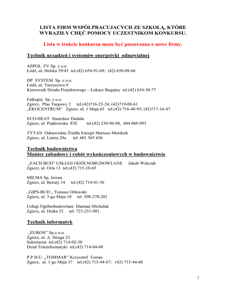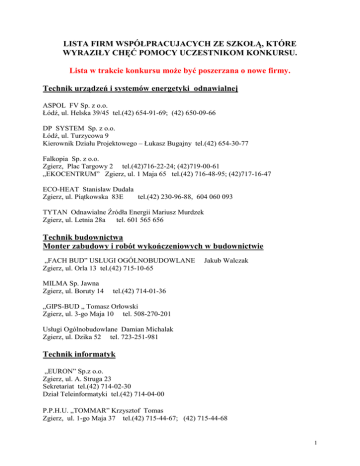 LISTA FIRM WSPÓŁPRACUJACYCH ZE SZKOŁĄ, KTÓRE WYRAZIŁY CHĘĆ POMOCY UCZESTNIKOM KONKURSU. Lista w trakcie konkursu może być poszerzana o nowe firmy. Technik urządzeń i systemów energetyki odnawialnej ASPOL FV Sp. z o.o. Łódź, ul. Helska 39/45 tel.(42) 654-91-69; (42) 650-09-66 DP SYSTEM Sp. z o.o. Łódź, ul. Turzycowa 9 Kierownik Działu Projektowego – Łukasz Bugajny tel.(42) 654-30-77 Falkopia Sp. z o.o. Zgierz, Plac Targowy 2 tel.(42)716-22-24; (42)719-00-61 „EKOCENTRUM” Zgierz, ul. 1 Maja 65 tel.(42) 716-48-95; (42)717-16-47 ECO-HEAT Stanisław Dudała Zgierz, ul. Piątkowska 83E tel.(42) 230-96-88, 604 060 093 TYTAN Odnawialne Źródła Energii Mariusz Murdzek Zgierz, ul. Letnia 28a tel. 601 565 656 Technik budownictwa Monter zabudowy i robót wykończeniowych w budownictwie „FACH BUD” USŁUGI OGÓLNOBUDOWLANE Zgierz, ul. Orla 13 tel.(42) 715-10-65 MILMA Sp. Jawna Zgierz, ul. Boruty 14 Jakub Walczak tel.(42) 714-01-36 „GIPS-BUD „ Tomasz Orłowski Zgierz, ul. 3-go Maja 10 tel. 508-270-201 Usługi Ogólnobudowlane Damian Michalak Zgierz, ul. Dzika 52 tel. 723-251-981 Technik informatyk „EURON” Sp.z o.o. Zgierz, ul. A. Struga 23 Sekretariat tel.(42) 714-02-30 Dział Teleinformatyki tel.(42) 714-04-00 P.P.H.U. „TOMMAR” Krzysztof Tomas Zgierz, ul. 1-go Maja 37 tel.(42) 715-44-67; (42) 715-44-68 1 DIM COMPUTERS Sebastian Andzelak Zgierz, ul. Parzęczewska 18 tel.(42) 278 23 35 GEOPLAN Andrzej Kwiatkowski Zgierz, ul. Długa 7 tel.(42) 715-69-86 SKOMUR J.K. Pruscy i D.P. Karczmarek Zgierz, ul. Boya-Żeleńskiego 39 tel.(42)716-76-60, Przedsiębiorstwo Handlowo-Usługowe „RABEX” Zgierz, ul. Łęczycka 24 tel.501 669 029 Technik elektryk DP SYSTEM Sp. z o.o. Łódź, ul. Turzycowa 9 Dyrektor ds. Technicznych – Robert Wlaźlak tel.(42) 654-30-77 „DOM FACH” Zygmunt Żebrowski Zgierz, ul. Parzęczewska 21, tel.(42) 716-40-97; (42) 716-28-53 PHU „EL-TIC” Tadeusz Iwaniuk Zgierz, ul. Żytnia 57 tel.(42) 716-82-08 Zakład Obsługi Energetyki Sp. z o.o. Zgierz, ul. Kuropatwińskiej 16 tel.(42) 675-25-37 PGE Górnictwo i Energetyka Konwencjonalna Spółka Akcyjna Oddział Elektrociepłownia Zgierz Zgierz, ul. Energetyków 9 Sekretariat tel.(42)717-49-31; 501 505 593 „EURON” Sp. z o.o. Zgierz, ul. A. Struga 23, Sekretariat tel.(42) 714-02-30 Dział Usług Elektrycznych tel.(42) 714-02-22 Technik mechanik „Wandalex” S.A. Odział Łódź, Zgierz, ul. Szczawińska 54/58 tel.(42)716-26-62 BIEL-MET Jerzy Bielawski Ozorków – Aleksandria 1 tel.(42) 718-12-85 Zakład Wyrobów Metalowych Witold Wieczorek Zgierz, ul. Żeromskiego 17 tel.(42) 716-3446; (42)717-19-89 Odlewnia Żeliwa i Staliwa Sp. z o.o. Zgierz, ul. Sienkiewicza 20A tel.(42) 716-13-12 2 Zakład Wyrobów Metalowych Odlewnia Metali "Sowinex" Zgierz, ul. Łąkowa 2 tel. (42) 719-01-50 „TECHSERWIS” Andrzej Pakuła Lućmierz, ul. Główna 12 tel. 601 695 100 Mechanik pojazdów samochodowych „JASZPOL” Sp.j. Zgierz, ul. Łódzka 28 Kierownik serwisu- Marek Wilk tel.(42) 716-26-52 lub 502 281 724 „JAPOŃCZYK” Krzysztof Bieliński, Zgierz, ul. 3 Maja 10 tel.(42) 715-04-54 PPHU „AUTO CENTRUM” mgr inż. Paweł Zieliński Zgierz, ul. Długa 153 tel.(42) 716-13-43; (42) 716-68-74 J.J. Idczak Spółka z o.o. Łódź, ul. Niciarniana 51/53 Zakład ul. Lipowa 11A 95 – 100 Zgierz tel. (42)716-69-96 Serwis - Janusz Mroczkowski (42)716-33-04 AUTO – SERVICE inż. Leszek Rogiński Zgierz, ul. Musierowicza 15 tel.(42) 716-25-40 OPEL – SERVICE A.Boruch J. Kubik Zgierz, ul Łęczycka 38 tel.(42) 716-26-28 Technik ochrony środowiska. Starostwo Powiatowe w Zgierzu Wydział Budownictwa i Ochrony środowiska Zgierz, ul. Sadowa 6a tel.(42) 288-82-00 Urząd Miasta Zgierza Wydział Ochrony Środowiska i Rolnictwa Zgierz, Plac Jana Pawła II 16 tel.(42)714-31-61 PGE Górnictwo i Energetyka Konwencjonalna Spółka Akcyjna Oddział Elektrociepłownia Zgierz Zgierz, ul. Energetyków 9 Sekretariat tel.(42)717-49-31 lub 501 505 593 3