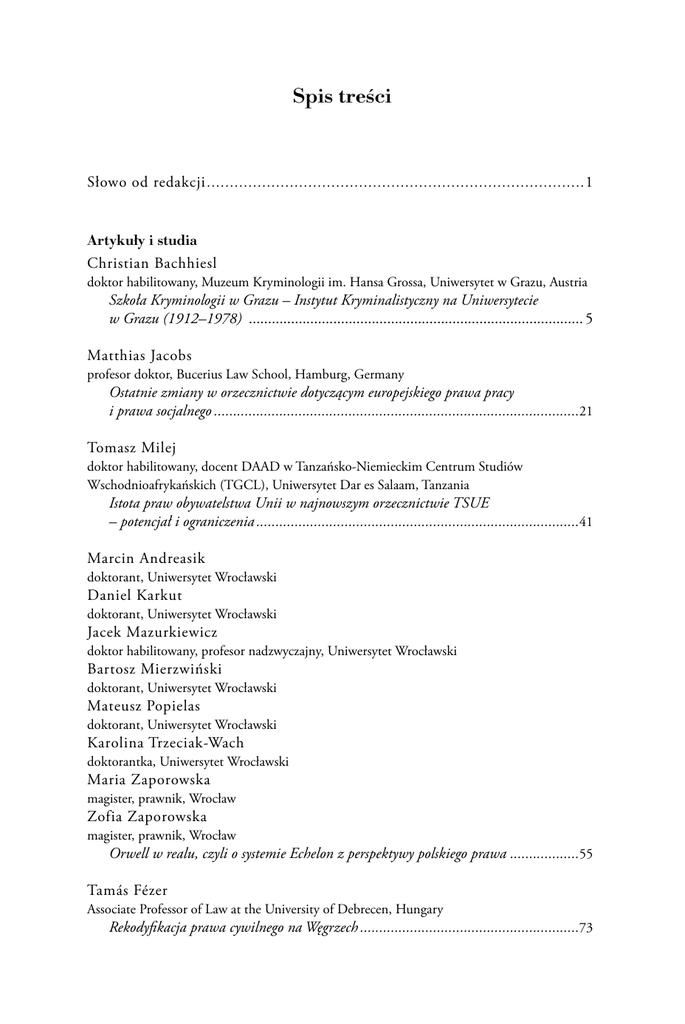 Spis treści Słowo od redakcji ..................................................................................1 Artykuły i studia Christian Bachhiesl doktor habilitowany, Muzeum Kryminologii im. Hansa Grossa, Uniwersytet w Grazu, Austria Szkoła Kryminologii w Grazu – Instytut Kryminalistyczny na Uniwersytecie w Grazu (1912–1978) ....................................................................................... 5 Matthias Jacobs profesor doktor, Bucerius Law School, Hamburg, Germany Ostatnie zmiany w orzecznictwie dotyczącym europejskiego prawa pracy i prawa socjalnego ...............................................................................................21 Tomasz Milej doktor habilitowany, docent DAAD w Tanzańsko-Niemieckim Centrum Studiów Wschodnioafrykańskich (TGCL), Uniwersytet Dar es Salaam, Tanzania Istota praw obywatelstwa Unii w najnowszym orzecznictwie TSUE – potencjał i ograniczenia ....................................................................................41 Marcin Andreasik doktorant, Uniwersytet Wrocławski Daniel Karkut doktorant, Uniwersytet Wrocławski Jacek Mazurkiewicz doktor habilitowany, profesor nadzwyczajny, Uniwersytet Wrocławski Bartosz Mierzwiński doktorant, Uniwersytet Wrocławski Mateusz Popielas doktorant, Uniwersytet Wrocławski Karolina Trzeciak-Wach doktorantka, Uniwersytet Wrocławski Maria Zaporowska magister, prawnik, Wrocław Zofia Zaporowska magister, prawnik, Wrocław Orwell w realu, czyli o systemie Echelon z perspektywy polskiego prawa ..................55 Tamás Fézer Associate Professor of Law at the University of Debrecen, Hungary Rekodyfikacja prawa cywilnego na Węgrzech .........................................................73 IV Spis treści Contents Anna Konert adiunkt, Uczelnia Łazarskiego Odpowiedzialność cywilna biur podróży w USA w świetle orzecznictwa .................93 Renata Pawlik doktor, Krakowska Akademia im. Andrzeja Frycza Modrzewskiego Znamiona ilościowe w procesie kontrawencjonalizacji w kontekście zasady nullum crimen sine lege – wybrane zagadnienia .............................................. 111 Michał Kobylarz doktor, Krakowska Akademia im. Andrzeja Frycza Modrzewskiego Jakub Gałka student, Krakowska Akademia im. Andrzeja Frycza Modrzewskiego Pojęcie informacji przetworzonej w kontekście dostępu do informacji publicznej ...147 Piotr Zaporowski doktorant, Uniwersytet Wrocławski; Bangkok, Tajlandia Wskazanie w firmie statusu przedsiębiorcy będącego osobą fizyczną oraz przedsiębiorcy będącego fundacją ............................................................... 159 Izabela Pilarczyk studentka, Krakowska Akademia im. Andrzeja Frycza Modrzewskiego Poszukiwanie prawdy w procesie cywilnym ........................................................ 169 Rafał Dubowski doktorant, Uniwersytet Wrocławski Egzaminy wstępne na aplikacje prawnicze. Uwagi de lege ferenda w świetle ustawy deregulacyjnej ......................................................................... 181 Adam Wróbel doktorant, Uczelnia Łazarskiego Rozwiązanie umowy o pracę bez wypowiedzenia z winy pracownika z powodu popełnienia oczywistego przestępstwa .................................................. 195 Julita Kostka-Twór doktorantka, Uczelnia Łazarskiego Prawnofinansowe aspekty bezpieczeństwa energetycznego w Polsce i UE ............... 209 Krzysztof A. Wójcik Prokuratura Generalna w Warszawie Uzyskanie informacji objętych tajemnicą bankową w sprawach dotyczących przestępstw powszechnych i skarbowych .............................................................. 219 Cezary Wiśniewski magister, Wydział Prawa Uniwersytetu w Białymstoku Karta bankowa w ujęciu art. 278 Kodeksu karnego ........................................... 239 Spis treści Contents V Recenzje, Glosy, Sprawozdania, Varia Renata Pawlik doktor, Krakowska Akademia im. Andrzeja Frycza Modrzewskiego Marcin Sala-Szczypiński doktor, Krakowska Akademia im. Andrzeja Frycza Modrzewskiego Ryszard Więckowski (1952–2014) – wspomnienie pośmiertne ........................... 251 Tommaso Edoardo Frosini profesor, University of Naples, Italy Democracy, Electoral Systems and Lobbies ........................................................... 255 Paweł Janowski doktorant, Krakowska Akademia im. Andrzeja Frycza Modrzewskiego Rafał Adamus, Bartosz Groele, Aleksandra Machowska, Zbigniew Miczek, Paweł Kuglarz, Janusz Płoch, Upadłość deweloperska. Komentarz do wybranych przepisów ustawy o ochronie praw nabywcy lokalu mieszkalnego lub domu jednorodzinnego, [Difin, Warszawa 2012, 219 s.] ........................................... 259 Márton Leó Zaccaria University of Debrecen Faculty of Law, Debrecen, Hungary Commentary on the principal judicial resolution EBH 2014. M.8. of the Curia of Hungary .................................................................................... 269 Łukasz Mroczyński-Szmaj magister, Uniwersytet Rzeszowski Sprawozdanie z II Euroregionalnej Konferencji Naukowej „Mediacja – między teorią a praktyką” .............................................................................. 279 Mateusz Mądel doktorant, Krakowska Akademia im. Andrzeja Frycza Modrzewskiego Szymon Solarski doktorant, Krakowska Akademia im. Andrzeja Frycza Modrzewskiego Sprawozdanie z konferencji naukowej „50 lat Kodeksu cywilnego. Sens i nonsens rekodyfikacji”, Kraków, 15–16 kwietnia 2014 r. ........................... 283 Daniel Karkut doktorant, Uniwersyt Wrocławski Sprawozdanie z konferencji naukowej „Wirtualne światy z perspektywy prawa polskiego, unijnego i międzynarodowego”, Wrocław, 23 maja 2014 r. ................... 291 VI Spis treści Contents Jubileusze w Krakowskiej Akademii im Andrzeja Frycza Modrzewskiego Mariusz Załucki profesor nadzwyczajny doktor habilitowany, Krakowska Akademia im. Andrzeja Frycza Modrzewskiego Sprawozdanie z konferencji naukowej Państwo demokratyczne