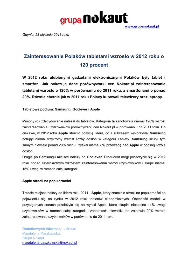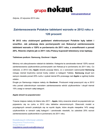 www.grupanokaut.pl Gdynia, 23 stycznia 2013 roku Zainteresowanie Polaków tabletami wzrosło w 2012 roku o 120 procent W 2012 roku ulubionymi gadżetami elektronicznymi Polaków były tablet i smartfon. Jak pokazują dane porównywarki cen Nokaut.pl zainteresowanie tabletami wzrosło o 120% w porównaniu do 2011 roku, a smartfonami o ponad 20%. Równie chętnie jak w 2011 roku Polacy kupowali telewizory oraz laptopy. Tabletowe podium: Samsung, Goclever i Apple Miniony rok zdecydowanie należał do tabletów. Kategoria ta zanotowała niemal 120% wzrost zainteresowania użytkowników porównywarki cen Nokaut.pl w porównaniu do 2011 toku. Co ciekawe, w 2012 roku Apple straciło pozycję lidera, co z sukcesem wykorzystał Samsung notując niemal trzykrotny wzrost liczby odsłon w kategorii Tablety. Samsung skupił tym samym niewiele ponad 20% ruchu i zyskał niemal 8% przewagę nad Apple w ogólnej liczbie odsłon. Drugie po Samsungu miejsce należy do Goclever. Producent mógł poszczycić się w 2012 roku ponad czterokrotnym wzrostem zainteresowania wśród użytkowników i skupił niemal 15% uwagi w ramach całej kategorii. Apple stracił na popularności Trzecie miejsce należy do lidera roku 2011 - Apple, który znacznie stracił na popularności po pojawieniu się na rynku w 2012 roku tabletów ekonomicznych. Obecność modeli w przystępnych cenach przełożyło się na wyniki Apple, które skupiło niespełna 14% uwagi użytkowników w ramach całej kategorii i zanotowało niewielki, bo zaledwie 20% wzrost zainteresowania użytkowników w porównaniu do 2011 roku. Dodatkowych informacji udziela: Magdalena Paszkowska, Grupa Nokaut [email protected] www.grupanokaut.pl Na czwartym miejscu znalazła się Manta - producent, którego produkty zyskały aż ośmiokrotnie na popularności, a w ogólnym rozrachunku skupiły cztery razy więcej ruchu w całej kategorii Tablety w Nokaut.pl w porównaniu do 2011 roku. Podobnie Lark, który zanotował w minionym roku prawie siedmiokrotny wzrost zainteresowania i skupił niemal trzykrotnie więcej zainteresowania użytkowniów w odniesieniu do całej kategorii. Jak pokazują dane Nokaut.pl, tablet na przestrzeni ostatniego roku stał się nie tylko pożądanym gadżetem elektronicznym, ale przede wszystkim po zakończonej dominacji Apple w 2011 roku, dostępnym dla większości narzędziem do pracy i zabawy. Użytkownicy zwrócili bowiem swoją uwagę w stronę tabletów ekonomicznych, które w przystępnej cenie oferują niezbędne funkcjonalności. Ma to odzwierciedlenie w zestawieniu TOP 10 tabletów 2012 roku, w którym aż połowa miejsc należy właśnie do tabletów ekonomicznych. TOP 10 tabletów w 2012 roku wg. Nokaut.pl 1. Tablet SAMSUNG Galaxy Tab 8.9 2. MANTA MID04 3. SAMSUNG GALAXY Tab 2 4. MODECOM FREE TAB 9701 5. APOLLO TABLET 7 QUICKI 6. GOCLEVER TAB A73 7. PRESTIGIO MultiPad 5080 8. APPLE iPad 16GB 9. Lark FreeMe 70.5 GPS DVB-T 10. SAMSUNG GALAXY Tab 2 10.1 Smartfon rządzi, liderem znów jest Samsung O tym, że Polakom do gustu przypadły smartfony, potwierdzają dane Nokaut.pl bo to właśnie telefony komórkowe były drugą po tabletach kategorią gadżetów elektronicznych, która odnotowała największe zainteresowanie w 2012 roku. Na koniec minionego roku cieszyła się Dodatkowych informacji udziela: Magdalena Paszkowska, Grupa Nokaut [email protected] www.grupanokaut.pl ona aż o 20% większą popularnością w zestawieniu do 2011 i odebrała ją znanym dotychczas feature phones, które w porównaniu do 2011 roku zanotowały ponad 20% spadek. Ponadto, w żadnej innej kategorii w ramach Nokaut.pl topowe produkty nie skupiły tak dużego ruchu użytkowników jak w przypadku telefonów komórkowych. Liderem wśród producentów smartfonów w 2012 roku został Samsung. Modele tej marki skupiły niemal połowę zainteresowania użytkowników w całej kategorii telefonów komórkowych i w porównaniu do 2011 roku zyskały wzrost na poziomie 15%. W kategorii telefonów komórkowych wyraźny spadek zainteresowania zanotowała Nokia, która na łącznej liczbie odsłon w całej kategorii straciła aż 12% oraz HTC (spadek o 5%), który po premierze modelu smartfona Wildfire S w 2011 roku nie zaproponował użytkownikom nic równie interesującego. Straty za to odrobił Sony Ericsson, którego produkty zyskały ponad 4% na popularności, co dało mu kolejne po Samsungu i Nokii miejsce w rankingu najpopularniejszych producentów telefonów komórkowych. W przypadku telefonów marki Apple popularność w odniesieniu do całej kategorii wzrosła w 2012 roku zaledwie o 2%. Równocześnie liczba odsłon produktów tegoż producenta zwiększyła się dwukrotnie, co może wskazywać na to, że mimo wysokich cen, produkty z logiem jabłuszka ciągle cieszą się zainteresowaniem użytkowników. Porównując popularność telefonów komórkowych ze względu na system operacyjny wyraźnie widać, że podobnie jak 2011 tak i 2012 rok należał do Androida. System ten zyskał 10% w skali roku na popularności użytkowników. Zainteresowanie modelami telefonów z systemem iOS skoczyło wśród użytkowników o prawie 8%, a o niespełna 2% wzrosło zainteresowanie systemem Windows Phone. TOP 10 telefonów komórkowych w 2012 roku: 1. Samsung Galaxy S II 2. Samsung Galaxy S III 3. Nokia 500 Dodatkowych informacji udziela: Magdalena Paszkowska, Grupa Nokaut [email protected] www.grupanokaut.pl 4. SAMSUNG GT-S5830 Galaxy Ace Onyx 5. SONY ERICSSON Xperia neo V 6. SONY ERICSSON Xperia Arc S 7. Nokia N8 8. Nokia E52 9. SAMSUNG Galaxy Note (N7000) 10. SAMSUNG Galaxy Note II (N7100) Niesłabnąca popularność telewizorów Rok 2012 pokazał również, że zainteresowanie Polaków nowymi modelami telewizorów nie słabnie. Popularność tej kategorii utrzymuje się w Nokaut.pl na wysokim poziomie, a ranking najpopularniejszych producentów nie uległ zmianie względem 2011 roku. Tu, podobnie jak przy tabletach i telefonach komórkowych, niekwestionowanym 