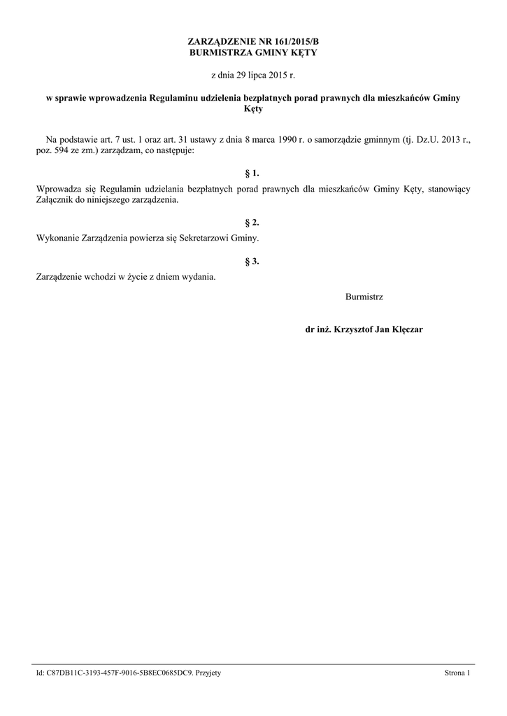 ZARZĄDZENIE NR 161/2015/B BURMISTRZA GMINY KĘTY z dnia 29 lipca 2015 r. w sprawie wprowadzenia Regulaminu udzielenia bezpłatnych porad prawnych dla mieszkańców Gminy Kęty Na podstawie art. 7 ust. 1 oraz art. 31 ustawy z dnia 8 marca 1990 r. o samorządzie gminnym (tj. Dz.U. 2013 r., poz. 594 ze zm.) zarządzam, co następuje: § 1. Wprowadza się Regulamin udzielania bezpłatnych porad prawnych dla mieszkańców Gminy Kęty, stanowiący Załącznik do niniejszego zarządzenia. § 2. Wykonanie Zarządzenia powierza się Sekretarzowi Gminy. § 3. Zarządzenie wchodzi w życie z dniem wydania. Burmistrz dr inż. Krzysztof Jan Klęczar Id: C87DB11C-3193-457F-9016-5B8EC0685DC9. Przyjety Strona 1 Załącznik Nr 1 do Zarządzenia Nr 161/2015/B Burmistrza Gminy Kęty z dnia 29 lipca 2015 r. Regulamin udzielania bezpłatnych porad prawnychdla mieszkańców Gminy Kęty § 1. Postanowienia ogólne Niniejszy regulamin określa zasady, zakres i sposób udzielania bezpłatnych porad prawnych na rzecz mieszkańców Gminy Kęty. § 2. Definicje Ilekroć w niniejszym regulaminie jest mowa o: 1) Dyżurze - należy przez to rozumieć czas, w którym udzielane są bezpłatne porady prawne przez prawnika w wyznaczonych harmonogramem terminach, 2) Kancelarii – należy przez to rozumieć Kancelarię świadczącą bezpłatne porady prawne dla mieszkańców Gminy Kęty, 3) Kliencie – należy przez to rozumieć osobę fizyczną, zamieszkującą na terenie Gminy Kęty, korzystającą z bezpłatnej porady prawnej, 4) poradach prawnych – należy przez to rozumieć - udzieloną ustnie konsultację prawną lub informację o obowiązującym stanie prawnym regulującym daną sprawę oraz wynikających z niego prawach i obowiązkach oraz o trybie, podmiocie lub organizacjach właściwych do jej załatwienia, 5) Prawniku – należy rozumieć radcę prawnego lub aplikanta radcowskiego udzielającego bezpłatnej porady prawnej, 6) Regulaminie – należy przez to rozumieć niniejszy regulamin, 7) Urzędzie Gminy – należy przez to rozumieć Urząd Gminy Kęty, ul. Rynek 7, 32-650 Kęty, 8) Karta - należy przez ro rozumieć Kartę Klienta korzystającego z bezpłatnych porad prawnych dla mieszkańców Gminy Kęty. § 3. Zakres i warunki poradnictwa prawnego 1. Zakres porad prawnych obejmuje: a) prawo cywilne, b) prawo rodzinne, c) prawo spadkowe, d) prawo administracyjne, e) prawo pracy, g) prawa konsumenckie. Id: C87DB11C-3193-457F-9016-5B8EC0685DC9. Przyjety Strona 2 2. Treść porady udzielana jest Klientowi w oparciu o przedstawiony przez niego stan faktyczny sprawy i przedłożone dokumenty. Nieujawnienie lub zatajenie jakichkolwiek informacji faktycznych i prawnych może skutkować tym, że porada nie będzie adekwatna do istniejącego problemu. Kancelaria nie ponosi odpowiedzialności za udzielenie porady odpowiadającej na problem przedstawiony przez klienta niezgodnie z prawdą. 3. Kancelaria nie świadczy na rzecz Klienta korzystającego z bezpłatnych porad prawnych zastępstwa procesowego, w szczególności nie podejmuje żadnych działań w imieniu i na rzecz przed sądami lub organami administracji. Podejmując działanie w swojej sprawie, klient czyni to we własnym imieniu i na własną odpowiedzialność. 4. Kancelaria nie udziela żadnej gwarancji, że korzystając z udzielonych porad i informacji Klient osiągnie pożądane rezultaty. 5. Kancelaria w ramach bezpłatnych porad prawnych nie sporządza pism procesowych i wniosków, w szczególności pozwów, prywatnych aktów oskarżenia, apelacji, zażaleń odpowiedzi na pozew, odwołań, skarg konstytucyjnych oraz skarg do Trybunału Konstytucyjnego. § 4. Procedura udzielania porad prawnych 1. Z bezpłatnych porad prawnych mogą korzystać osoby fizyczne zamieszkujące na terenie Gminy Kęty. 2. Bezpłatne porady prawne udzielane są: a) w pierwszy wtorek miesiąca w godzinach od 15.00 do 17.00 b) w trzeci piątek miesiąca w godzinach od 8.00 do 10.00 3. Zapisy na bezpłatne porady prawne odbywają się drogą telefoniczną pod nr telefonu: 33 8447600 lub przez osobiste zgłoszenie się do sekretariatu Urzędu Gminy. Termin i zakres tematyczny można ustalić w Kancelarii Urzędu Gminy Kęty pok. 29 I piętro w dni robocze od poniedziałku do piątku w godzinach od 8:00 do 15:00. 4. Przed udzieleniem porady prawnej Klient na odrębnym formularzu składa pisemne oświadczenie, że zapoznał się z Regulaminem i akceptuje go i wnioskuje o udzielenie takiej porady. 5. Porady udzielane są w formie ustnej przez pracowników Kancelarii podczas spotkania w Urzędzie Gminy. Czas przeznaczony na jedną poradę wynosi ok. 20 minut. 6. Każda porada prawna jest dokumentowana w Karcie. Klient zobowiązany jest do przekazania niezbędnych danych do wypełnienia Karty. Fakt otrzymania porady prawnej Klient potwierdza poprzez złożenie własnoręcznego podpisu na Karcie. 7. Klienci niezapisani na poradę prawną przyjmowani są tylko w wyjątkowych sytuacjach (np. zobligowani terminem pism urzędowych, sądowych). W innym przypadku Klient zostaje umówiony na najbliższy wolny termin. 8. W trakcie porady Klient powinien udostępnić do wglądu dokumenty i informacje mające wpływ na właściwą ocenę problemu i co się z tym wiąże udzielenie rzetelnej porady. Kancelaria nie zatrzymuje ani nie przechowuje oryginalnych dokumentów. Z oryginałów prawnik korzysta jedynie w obecności klienta. 9. Zastrzega się możliwość odmowy udzielenia porady prawnej w szczególności w przypadku, gdy Klient swoją postawą wyraża lekceważenie wobec prawnika, gdy zachowuje się w sposób agresywny, jest pod wpływem alkoholu. Kancelaria może również odmówić udzielenia porady w przypadku, gdy Klient umawia się na poradę i nie zgłasza się w umówionym czasie. 10. Wszelkie dane uzyskane podczas udzielania porad odnoszące się do Klienta są informacjami poufnymi i objęte są zakazem ich upubliczniania i przetwarzania. Wyjątek stanowią dobrowolne dane