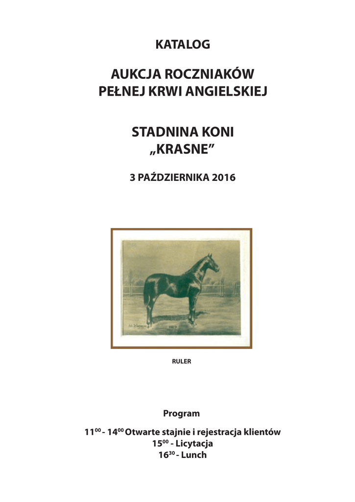 KATALOG AUKCJA ROCZNIAKÓW PEŁNEJ KRWI ANGIELSKIEJ STADNINA KONI „KRASNE” 3 PAŹDZIERNIKA 2016 RULER Program 1100 - 1400 Otwarte stajnie i rejestracja klientów 1500 - Licytacja 1630 - Lunch OPRACOWANIE KATALOGU CARTRANS JESIENNE AUKCJE KONI www.aukcjakoni.eu Kariery koni w sezonie 2016 do dnia 31 lipca 2016 WARUNKI AUKCJI ROCZNIAKÓW W STADNINIE KONI KRASNE I. SPRZEDAŻ: OGIERY - nr kat. 1- 10 1. 2. 3. 4. 5. 6. 7. 8. 9. 10. 11. 12. 13. 14. 15. Do licytacji mogą przystąpić osoby fizyczne i osoby prawne na równych prawach, bez żadnych ograniczeń. Warunkiem dopuszczenia do licytacji jest wpłacenie wadium w wysokości 1000 PLN lub ekwiwalent w biurze w dniu aukcji. Wadium przestanie być przyjmowane na 15 minut przed godziną rozpoczęcia aukcji. Wadium upoważnia do wzięcia udziału w licytacji każdego konia. Wpłacone wadium zostaje zaliczone w cenę zakupu. Wadium zostanie zwrócone wpłacającemu bezpośrednio po aukcji, o ile zakup nie dojdzie do skutku. Licytacja będzie prowadzona systemem zwyczajowo przyjętym na aukcjach sprzedażnych koni. Nabywcą staje się osoba oferująca najwyższą cenę. W przypadku powstania sporu między dwoma lub więcej licytującymi , sporny koń poddany zostanie ponownej licytacji od najwyższej ceny niespornej, lub też spór zostanie rozstrzygnięty przez aukcjonera. Wystawca zastrzega sobie prawo wycofania z licytacji każdego konia bez podania przyczyny. Nabywca zobowiązany jest potwierdzić podpisem zakup każdego konia bezpośrednio po aukcji. Nabywca zobowiązany jest wpłacić należność za konia /konie/ na konto Stadniny Koni „Krasne” - Bank Spółdzielczy O/Ciechanów Nr 78 8213 0008 2001 8108 2524 0001 w terminie pięciu dni od daty licytacji. Żaden koń nie zostanie wydany nabywcy zanim cena zakupu nie wpłynie na powyższe konto. Brak wpłaty ceny zakupu w terminie 5 dni od daty aukcji powoduje przepadek wadium i rozwiązanie umowy z winy nabywcy. Zakupionego konia należy odebrać ze Stadniny w terminie do 31 października 2016 r. Do tego terminu koń może przebywać w Stadninie bez dodatkowych opłat ale na ryzyko nabywcy. Istnieje możliwość dalszego utrzymania konia w Stadninie w drodze zawartej odrębnej umowy. Koszt utrzymania konia wynosi 22 PLN dziennie + 8% VAT Zawarcie umowy na dalsze utrzymanie konia jest możliwe tylko w przypadku wcześniejszego wniesienia pełnej ceny zakupu. Nabywca zagraniczny ponosi koszty wymaganych badań weterynaryjnych oraz wszelkie koszty wynikające z wysyłki koni za granicę. Nabywca załaduje konia w miejscu aukcji do swojego środka transportu na własny koszt i ryzyko. Po udostępnieniu konia do załadunku na środek transportu wskazany przez nabywcę, ryzyko związane z końmi przechodzi całkowicie na nabywcę. Stadnina Koni Krasne sprzedaje konie w stanie „jak jest” i jakiekolwiek gwarancje, łącznię z gwarancjami przydatności handlowej, użytkowej i innej, ze strony Stadniny są wykluczone. Wszystkie oficjalne informacje i poprawki ogłaszane podczas aukcji mają moc korygującą. Stadnina Koni Krasne Aukcja Roczniaków 2016 II. DZIERŻAWA : KLACZE - nr kat. 11-22 1. 2. 3. 4. 5. 6. 7. 8. 9. Dzierżawcą staje się osoba oferująca najwyższy procent dzierżawy tj. % dla Stadniny Koni Krasne od wygranych przez konia brutto. W przypadku powstania sporu między dwoma lub więcej licytującymi, sporny koń poddany zostanie ponownej licytacji od najwyższego procentu niespornego lub też spór zostanie rozstrzygnięty przez aukcjonera. Aukcjoner zastrzega sobie prawo wycofania z przetargu każdego konia bez podania przyczyny. Stadnina Koni Krasne wydzierżawia konie na dwa sezony wyścigowe. Wylicytowany procent dzierżawy dotyczy wygranych konia w wieku trzech lat. Procent od wygranych w wieku dwóch lat ustala się dla każdego konia na poziomie 5 %. Przetarg będzie prowadzony systemem zwyczajowo przyjętym na aukcjach sprzedanych koni, począwszy od poziomu 5% sumy wygranych brutto. Postąpienie licytacji ustala się w wysokości 2%. Dzierżawca zobowiązany jest do podpisania umowy dzierżawnej bezpośrednio po aukcji. Wydzierżawione konie mogą być utrzymywane w Stadninie na jej koszt, ale na ryzyko dzierżawcy do dnia 30 listopada 2016 roku. Po tym terminie istnieje możliwość dalszego utrzymania koni w Stadninie w drodze zawartej odrębnej umowy. Koszt utrzymania konia wynosi 22 PLN dziennie +8% VAT Stadnina Koni Krasne zastrzega sobie prawo akceptacji trenera, któremu dzierżawca przekaże konia do treningu. Stadnina Koni Krasne dzierżawi konie w stanie „ jak jest” i jakiekolwiek gwarancje łącznie z gwarancjami przydatności handlowej, użytkowej i innej ze strony Stadniny są wykluczone. Wszystkie oficjalne informacje i poprawki ogłaszane podczas aukcji mają moc korygującą. Wszystkie osoby przebywające na terenie Stadniny podczas trwania aukcji i imprez z nią związanych czynią to na własne ryzyko. Stadnina Koni Krasne nie będzie ponosić odpowiedzialności za jakiekolwiek szkody na zdrowiu czy mieniu poniesione przez te osoby podczas trwania imprezy. Stadnina Koni Krasne Aukcja Roczniaków 2016 LISTA KONI 1. BAILANDO og. gn. ur.19.01. Calming Influence – Baia Mare/Great Lakes 2. BERGEN og. gn. ur.24.01. Calming Influence – Bagera/Royal Court 3. GOLDEN CUP og. c.gn. ur.26.02 Camill – Golden Queen/All Hand on Deck 4. HAMILTON og. gn.. ur.02.04. Camill – Hamada/Great Lakes 5. JARL og. kaszt. ur.18.02. Calming Influence – Jareda/Great Lakes 6. JONATAN og. gn. ur.11.04. Calming Influence – Joka/Tioman Island 7. MAMERTYN og. kaszr. ur.20.03. Calming Influence – Maranta/Saphir 8. SAN CRISTOBAL og. kaszt. ur.07.03. Calming Influence – Santa Caterina/In Camera 9. TANATOS og. gn. ur.08.03. Calming Influence – Tormenta/Jape 10. WALL STREET og. gn.. ur.11.01 Calming Influence – Wellamy(GER)/Black Sam Bellamy 11. ARMINA kl. c.gn. ur.05.03. Calming Influence – Amarna/Great Lakes 12. BIANCAVILLA kl. kaszt. ur.15.01. Calming I