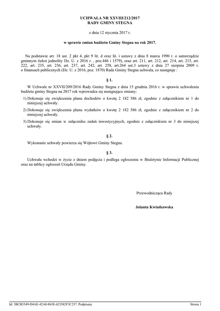 UCHWAŁA NR XXVIII/212/2017 RADY GMINY STEGNA z dnia 12 stycznia 2017 r. w sprawie zmian budżetu Gminy Stegna na rok 2017. Na podstawie art. 18 ust. 2 pkt 4, pkt 9 lit. d oraz lit. i ustawy z dnia 8 marca 1990 r. o samorządzie gminnym (tekst jednolity Dz. U. z 2016 r. , poz.446 i 1579), oraz art. 211, art. 212, art. 214, art. 215, art. 222, art. 235, art. 236, art. 237, art. 242, art. 258, art.264 ust.3 ustawy z dnia 27 sierpnia 2009 r. o finansach publicznych (Dz. U. z 2016, poz. 1870) Rada Gminy Stegna uchwala, co następuje : § 1. W Uchwale nr XXVII/209/2016 Rady Gminy Stegna z dnia 15 grudnia 2016 r. w sprawie uchwalenia budżetu gminy Stegna na 2017 rok wprowadza się następujące zmiany: 1) Dokonuje się zwiększenia planu dochodów o kwotę 2 182 586 zł, zgodnie z załącznikiem nr 1 do niniejszej uchwały. 2) Dokonuje się zwiększenia planu wydatków o kwotę 2 182 586 zł, zgodnie z załącznikiem nr 2 do niniejszej uchwały. 3) Dokonuje się zmian w załączniku zadań inwestycyjnych, zgodnie z załącznikiem nr 3 do niniejszej uchwały. § 2. Wykonanie uchwały powierza się Wójtowi Gminy Stegna. § 3. Uchwała wchodzi w życie z dniem podjęcia i podlega ogłoszeniu w Biuletynie Informacji Publicznej oraz na tablicy ogłoszeń Urzędu Gminy. Przewodnicząca Rady Jolanta Kwiatkowska Id: 3BCB3549-D4AE-42A0-863E-623582F3C237. Podpisany Strona 1 Załącznik Nr 1 do Uchwały Nr XXVIII/212/2017 Rady Gminy Stegna z dnia 12 stycznia 2017 r. Zmiany planu dochodów Dział 853 Rozdział Paragraf 85395 Treść Przed zmianą Pozostałe zadania w zakresie polityki społecznej 595 755,00 Pozostała działalność 2007 2009 6207 6209 Dotacje celowe w ramach programów finansowanych z udziałem środków europejskich oraz środków, o których mowa w art.5 ust.1 pkt 3 oraz ust. 3 pkt 5 i 6 ustawy, lub płatności w ramach budżetu środków europejskich, z wyłączeniem dochodów klasyfikowanych w paragrafie 205 Dotacje celowe w ramach programów finansowanych z udziałem środków europejskich oraz środków, o których mowa w art.5 ust.1 pkt 3 oraz ust. 3 pkt 5 i 6 ustawy, lub płatności w ramach budżetu środków europejskich, z wyłączeniem dochodów klasyfikowanych w paragrafie 205 Dotacje celowe w ramach programów finansowanych z udziałem środków europejskich oraz środków, o których mowa w art.5 ust.1 pkt. 3 oraz ust. 3 pkt 5 i 6 ustawy, lub płatności w ramach budżetu środków europejskich, z wyłączeniem dochodów klasyfikowanych w paragrafie 625 Dotacje celowe w ramach programów finansowanych z udziałem środków europejskich oraz środków, o których mowa w art.5 ust.1 pkt. 3 oraz ust. 3 pkt 5 i 6 ustawy, lub płatności w ramach budżetu środków europejskich, z wyłączeniem dochodów klasyfikowanych w paragrafie 625 Razem: BeSTia Id: 3BCB3549-D4AE-42A0-863E-623582F3C237. Podpisany 595 755,00 Zmiana 2 182 586,00 2 182 586,00 Po zmianie 2 778 341,00 2 778 341,00 595 755,00 1 482 684,00 2 078 439,00 0,00 174 502,00 174 502,00 0,00 470 075,00 470 075,00 0,00 55 325,00 55 325,00 2 182 586,00 50 028 708,00 47 846 122,00 Strona 1 Strona 1 Załącznik Nr 2 do Uchwały Nr XXVIII/212/2017 Rady Gminy Stegna z dnia 12 stycznia 2017 r. Zmiany planu wydatków Dział 853 Rozdział 85395 Paragraf 4307 4309 6057 6059 Treść Przed zmianą Pozostałe zadania w zakresie polityki społecznej 847 971,00 Pozostała działalność 847 971,00 Zakup usług pozostałych 794 340,00 Zakup usług pozostałych 53 631,00 Wydatki inwestycyjne jednostek budżetowych 0,00 Wydatki inwestycyjne jednostek budżetowych 0,00 Razem: BeSTia Id: 3BCB3549-D4AE-42A0-863E-623582F3C237. Podpisany 54 541 970,00 Zmiana 2 182 586,00 2 182 586,00 1 482 684,00 174 502,00 470 075,00 55 325,00 2 182 586,00 Po zmianie 3 030 557,00 3 030 557,00 2 277 024,00 228 133,00 470 075,00 55 325,00 56 724 556,00 Strona 1 Strona 1 Załącznik Nr 3 do Uchwały Nr XXVIII/212/2017 Rady Gminy Stegna z dnia 12 stycznia 2017 r. Zadania inwestycyjne Dział 853 Rozdział 85395 Paragraf 6057 6059 Treść Przed zmianą Pozostałe zadania w zakresie polityki społecznej Pozostała działalność 0,00 0,00 Wydatki inwestycyjne jednostek budżetowych 0,00 Szkoła Talentów 0,00 Szkoła Talentów 0,00 Wydatki inwestycyjne jednostek budżetowych 0,00 Razem 15 084 259,00 Zmiana 525 400,00 525 400,00 470 075,00 470 075,00 55 325,00 55 325,00 525 400,00 Po zmianie 525 400,00 525 400,00 470 075,00 470 075,00 55 325,00 55 325,00 15 609 659,00 Strona 1 z 1 Id: 3BCB3549-D4AE-42A0-863E-623582F3C237. Podpisany Strona 1 Uzasadnienie W niniejszej uchwale dokonano następujących zmian: · w planie dochodów i wydatków dokonano zwiększenia o kwotę 2 182 586 zł, z tytułu otrzymania dotacji na realizację projektu "Szkoła Talentów" w Ramach Regionalnego Programu Operacyjnego Województwa Pomorskiego na lata 2014-2020 współfinansowanego z Europejskiego Funduszu Społecznego, zgodnie z podpisaną umową nr RPPM.03.02.01-22-0124/15-00 z dnia 29.12.2016. Id: 3BCB3549-D4AE-42A0-863E-623582F3C237. Podpisany Strona 1