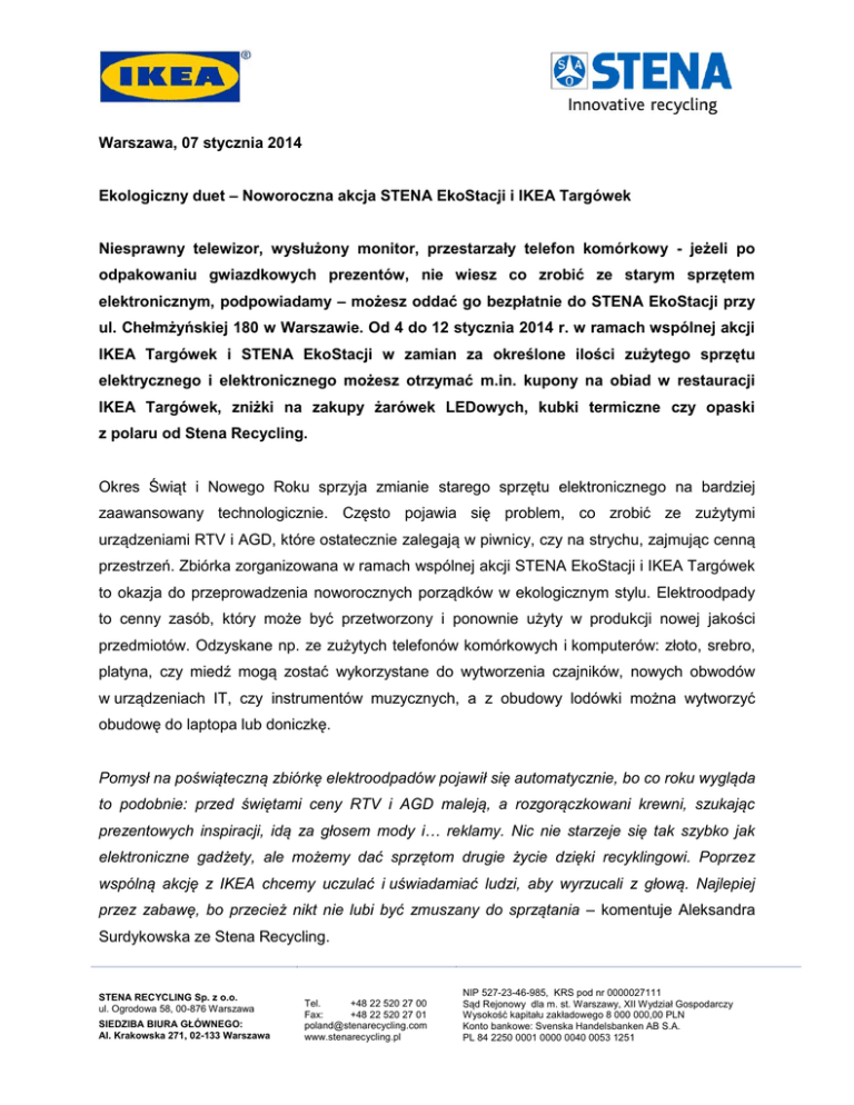 Warszawa, 07 stycznia 2014 Ekologiczny duet – Noworoczna akcja STENA EkoStacji i IKEA Targówek Niesprawny telewizor, wysłużony monitor, przestarzały telefon komórkowy - jeżeli po odpakowaniu gwiazdkowych prezentów, nie wiesz co zrobić ze starym sprzętem elektronicznym, podpowiadamy – możesz oddać go bezpłatnie do STENA EkoStacji przy ul. Chełmżyńskiej 180 w Warszawie. Od 4 do 12 stycznia 2014 r. w ramach wspólnej akcji IKEA Targówek i STENA EkoStacji w zamian za określone ilości zużytego sprzętu elektrycznego i elektronicznego możesz otrzymać m.in. kupony na obiad w restauracji IKEA Targówek, zniżki na zakupy żarówek LEDowych, kubki termiczne czy opaski z polaru od Stena Recycling. Okres Świąt i Nowego Roku sprzyja zmianie starego sprzętu elektronicznego na bardziej zaawansowany technologicznie. Często pojawia się problem, co zrobić ze zużytymi urządzeniami RTV i AGD, które ostatecznie zalegają w piwnicy, czy na strychu, zajmując cenną przestrzeń. Zbiórka zorganizowana w ramach wspólnej akcji STENA EkoStacji i IKEA Targówek to okazja do przeprowadzenia noworocznych porządków w ekologicznym stylu. Elektroodpady to cenny zasób, który może być przetworzony i ponownie użyty w produkcji nowej jakości przedmiotów. Odzyskane np. ze zużytych telefonów komórkowych i komputerów: złoto, srebro, platyna, czy miedź mogą zostać wykorzystane do wytworzenia czajników, nowych obwodów w urządzeniach IT, czy instrumentów muzycznych, a z obudowy lodówki można wytworzyć obudowę do laptopa lub doniczkę. Pomysł na poświąteczną zbiórkę elektroodpadów pojawił się automatycznie, bo co roku wygląda to podobnie: przed świętami ceny RTV i AGD maleją, a rozgorączkowani krewni, szukając prezentowych inspiracji, idą za głosem mody i… reklamy. Nic nie starzeje się tak szybko jak elektroniczne gadżety, ale możemy dać sprzętom drugie życie dzięki recyklingowi. Poprzez wspólną akcję z IKEA chcemy uczulać i uświadamiać ludzi, aby wyrzucali z głową. Najlepiej przez zabawę, bo przecież nikt nie lubi być zmuszany do sprzątania – komentuje Aleksandra Surdykowska ze Stena Recycling. STENA RECYCLING Sp. z o.o. ul. Ogrodowa 58, 00-876 Warszawa SIEDZIBA BIURA GŁÓWNEGO: Al. Krakowska 271, 02-133 Warszawa Tel. +48 22 520 27 00 Fax: +48 22 520 27 01 [email protected] www.stenarecycling.pl NIP 527-23-46-985, KRS pod nr 0000027111 Sąd Rejonowy dla m. st. Warszawy, XII Wydział Gospodarczy Wysokość kapitału zakładowego 8 000 000,00 PLN Konto bankowe: Svenska Handelsbanken AB S.A. PL 84 2250 0001 0000 0040 0053 1251 Im większy sprzęt tym więcej prezentów Za oddanie minimum 5 sztuk małego sprzętu elektronicznego w trakcie trwania akcji będzie można odebrać m.in. kupon na lunch w restauracji IKEA oraz opaskę z polaru. Za elektroodpady większych rozmiarów będzie można odebrać nie tylko kupon na lunch, ale także kubek termiczny i zniżkę na zakup żarówek LEDowych w IKEA Targówek. Warto wiedzieć, że oświetlenie wykorzystujące technologię LED jest najlepsze dla domowego budżetu i środowiska naturalnego, ponieważ nie tylko zużywa do 85% mniej energii, ale też świeci do 25 razy dłużej w stosunku do oświetlenia wykorzystującego tradycyjne żarówki. Dzięki temu żarówki LED wymagają rzadszej wymiany, więc redukowana jest ilość wytwarzanych odpadów. Ponadto nie zawierają rtęci i mogą być przetwarzane w procesie recyklingu. Żarówki LED można używać w każdego rodzaju lampach. Szukasz Inspiracji – przyjdź do EkoStacji EkoStacja to pierwsza i jedyna w Warszawie stacja recyklingu, w której można bezpłatnie zostawić wszystkie surowce wtórne, wielkogabarytowe, elektroniczne i niebezpieczne. Stacja działa na bazie najlepszych skandynawskich doświadczeń w organizacji i prowadzeniu tego typu punktów zbiórki opadów, które zostają poddane przetworzeniu lub utylizacji, zgodnie z obowiązującymi standardami i normami. STENA EkoStacja to także wyjątkowe miejsce ze względu na Showroom przygotowany wspólnie z IKEA, w którym można zobaczyć jak tworząc eko-wnętrza, żyć w zgodzie z najnowszymi trendami i naturą. Propagując ideę zrównoważonego życia w domu, IKEA pragnie pokazać, że ekologia to przede wszystkim małe zmiany w codziennych czynnościach, które przynoszą duże efekty. Showroom w STENA EkoStacji prezentuje jak ważny i potrzebny jest recykling, a także jak na przykładzie produktów IKEA można oszczędzać energię i zmniejszać ilość odpadów w domu. Dodatkowe informacje: Paulina Nesteruk, [email protected], 22 334 4543 Ewelina Ciuchta, [email protected], 508 338 267 Izabela Heinrich, [email protected], 22 628 50 42 STENA RECYCLING Sp. z o.o. ul. Ogrodowa 58, 00-876 Warszawa SIEDZIBA BIURA GŁÓWNEGO: Al. Krakowska 271, 02-133 Warszawa Tel. +48 22 520 27 00 Fax: +48 22 520 27 01 [email protected] www.stenarecycling.pl NIP 527-23-46-985, KRS pod nr 0000027111 Sąd Rejonowy dla m. st. Warszawy, XII Wydział Gospodarczy Wysokość kapitału zakładowego 8 000 000,00 PLN Konto bankowe: Svenska Handelsbanken AB S.A. PL 84 2250 0001 0000 0040 0053 1251 *** O Stena Recycling: Stena Recycling działająca w strukturze Stena Recycling International, należy do Stena Metall Group, wiodącej międzynarodowej firmy oferującej kompleksowe rozwiązania w zakresie zarządzania odpadami, recyklingu oraz usług środowiskowych. Stena odzyskuje i przetwarza wszystkie rodzaje odpadów: makulaturę, plastik, złom metali żelaznych i nieżelaznych oraz odpady niebezpieczne. Jest europejskim liderem w dziedzinie przetwarzania zużytego sprzętu elektrycznego i elektronicznego. W Polsce Stena Recycling działa od 2001 r. i posiada obecnie 23 oddziały na terenie całego kraju. Rocznie przetwarza 700 tys. odpadów pochodzących z działalności biznesowej i przemysłu. W 2012 roku Stena Recycling uruchomiła pierwszą stację recyklingu w Warszawie – STENA EkoStacj