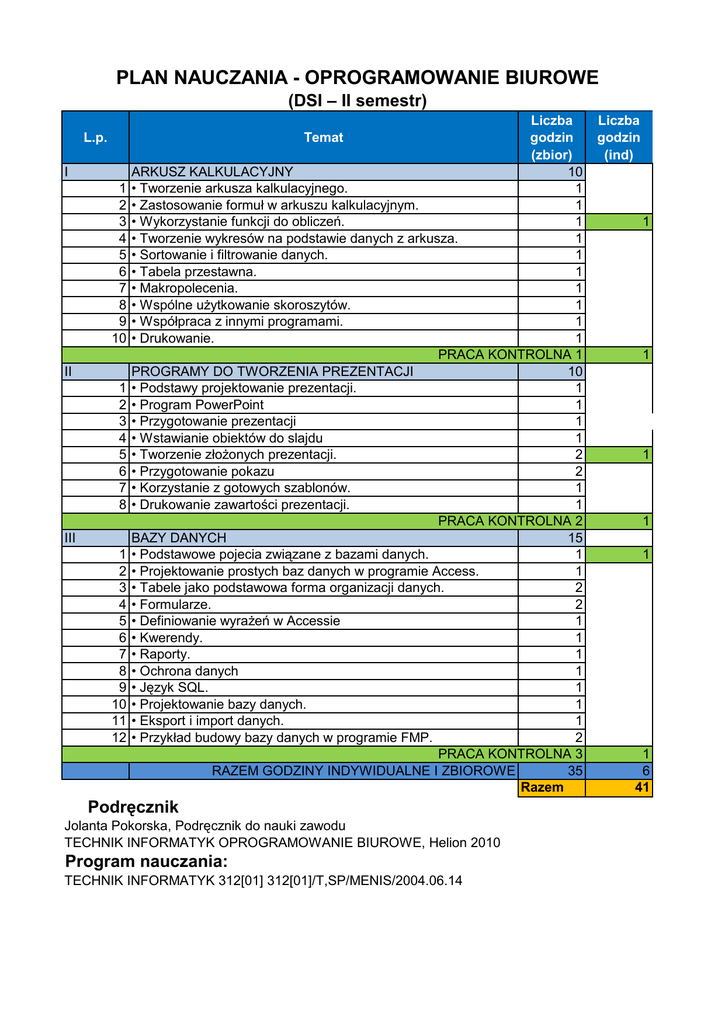 PLAN NAUCZANIA - OPROGRAMOWANIE BIUROWE (DSI – II semestr) L.p. I 1 2 3 4 5 6 7 8 9 10 II 1 2 3 4 5 6 7 8 III 1 2 3 4 5 6 7 8 9 10 11 12 Liczba Temat godzin (zbior) ARKUSZ KALKULACYJNY 10 • Tworzenie arkusza kalkulacyjnego. 1 • Zastosowanie formuł w arkuszu kalkulacyjnym. 1 • Wykorzystanie funkcji do obliczeń. 1 • Tworzenie wykresów na podstawie danych z arkusza. 1 • Sortowanie i filtrowanie danych. 1 • Tabela przestawna. 1 • Makropolecenia. 1 • Wspólne użytkowanie skoroszytów. 1 • Współpraca z innymi programami. 1 • Drukowanie. 1 PRACA KONTROLNA 1 PROGRAMY DO TWORZENIA PREZENTACJI 10 • Podstawy projektowanie prezentacji. 1 • Program PowerPoint 1 • Przygotowanie prezentacji 1 • Wstawianie obiektów do slajdu 1 • Tworzenie złożonych prezentacji. 2 • Przygotowanie pokazu 2 • Korzystanie z gotowych szablonów. 1 • Drukowanie zawartości prezentacji. 1 PRACA KONTROLNA 2 BAZY DANYCH 15 • Podstawowe pojecia związane z bazami danych. 1 • Projektowanie prostych baz danych w programie Access. 1 • Tabele jako podstawowa forma organizacji danych. 2 • Formularze. 2 • Definiowanie wyrażeń w Accessie 1 • Kwerendy. 1 • Raporty. 1 • Ochrona danych 1 • Język SQL. 1 • Projektowanie bazy danych. 1 • Eksport i import danych. 1 • Przykład budowy bazy danych w programie FMP. 2 PRACA KONTROLNA 3 RAZEM GODZINY INDYWIDUALNE I ZBIOROWE 35 Razem Podręcznik Jolanta Pokorska, Podręcznik do nauki zawodu TECHNIK INFORMATYK OPROGRAMOWANIE BIUROWE, Helion 2010 Program nauczania: TECHNIK INFORMATYK 312[01] 312[01]/T,SP/MENIS/2004.06.14 Liczba godzin (ind) 1 1 1 1 1 1 6 41 PLAN NAUCZANIA - OPROGRAMOWANIE BIUROWE (DSI – III semestr) L.p. Temat Liczba godzin (zbior) URZĄDZENIA WYKORZYSTYWANE W PRACY BIUROWEJ 3 1 • Wykorzystanie skanera. 1 2 • Instalacja i konfiguracja modemu. 1 3 • Obsługa faksu. 1 PRACA KONTROLNA 1 II MENEDŻER INFORMACJI OSOBISTEJ (ORGANIZER) 5 1 • Prowadzenie kalendarza i planowanie spotkań. 1 2 • Zarządzanie zadaniami i organizowanie list zadań. 1 3 • Prowadzenie dziennika. 1 4 • Wykorzystanie innych programów do zarządzania 1 5 • Praktyczne wykorzystanie kalendarza Google 1 PRACA KONTROLNA 2 RAZEM GODZINY INDYWIDUALNE I ZBIOROWE 14 Podręcznik Razem Jolanta Pokorska, Podręcznik do nauki zawodu TECHNIK INFORMATYK OPROGRAMOWANIE BIUROWE, Helion 2010 Liczba godzin (ind) I Program nauczania: TECHNIK INFORMATYK 312[01] 312[01]/T,SP/MENIS/2004.06.14 1 1 1 1 1 1 6 20