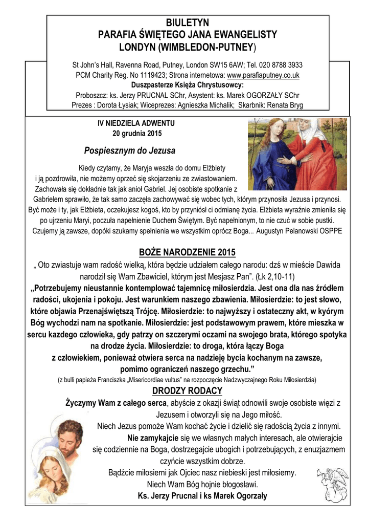 BIULETYN PARAFIA ŚWIĘTEGO JANA EWANGELISTY LONDYN (WIMBLEDON-PUTNEY) St John’s Hall, Ravenna Road, Putney, London SW15 6AW; Tel. 020 8788 3933 PCM Charity Reg. No 1119423; Strona internetowa: www.parafiaputney.co.uk Duszpasterze Księża Chrystusowcy: Proboszcz: ks. Jerzy PRUCNAL SChr, Asystent: ks. Marek OGORZAŁY SChr Prezes : Dorota Łysiak; Wiceprezes: Agnieszka Michalik; Skarbnik: Renata Bryg IV NIEDZIELA ADWENTU 20 grudnia 2015 Pospiesznym do Jezusa Kiedy czytamy, że Maryja weszła do domu Elżbiety i ją pozdrowiła, nie możemy oprzeć się skojarzeniu ze zwiastowaniem. Zachowała się dokładnie tak jak anioł Gabriel. Jej osobiste spotkanie z Gabrielem sprawiło, że tak samo zaczęła zachowywać się wobec tych, którym przynosiła Jezusa i przynosi. Być może i ty, jak Elżbieta, oczekujesz kogoś, kto by przyniósł ci odmianę życia. Elżbieta wyraźnie zmieniła się po ujrzeniu Maryi, poczuła napełnienie Duchem Świętym. Być napełnionym, to nie czuć w sobie pustki. Czujemy ją zawsze, dopóki szukamy spełnienia we wszystkim oprócz Boga... Augustyn Pelanowski OSPPE BOŻE NARODZENIE 2015 „ Oto zwiastuje wam radość wielką, która będzie udziałem całego narodu: dzś w mieście Dawida narodził się Wam Zbawiciel, którym jest Mesjasz Pan”. (Łk 2,10-11) „Potrzebujemy nieustannie kontemplować tajemnicę miłosierdzia. Jest ona dla nas źródłem radości, ukojenia i pokoju. Jest warunkiem naszego zbawienia. Miłosierdzie: to jest słowo, które objawia Przenajświętszą Trójcę. Miłosierdzie: to najwyższy i ostateczny akt, w kyórym Bóg wychodzi nam na spotkanie. Miłosierdzie: jest podstawowym prawem, które mieszka w sercu kazdego człowieka, gdy patrzy on szczerymi oczami na swojego brata, którego spotyka na drodze życia. Miłosierdzie: to droga, która łączy Boga z człowiekiem, ponieważ otwiera serca na nadzieję bycia kochanym na zawsze, pomimo ograniczeń naszego grzechu.” (z bulli papieża Franciszka „Misericordiae vultus” na rozpoczęcie Nadzwyczajnego Roku Miłosierdzia) DRODZY RODACY Życzymy Wam z całego serca, abyście z okazji świąt odnowili swoje osobiste więzi z Jezusem i otworzyli się na Jego miłość. Niech Jezus pomoże Wam kochać życie i dzielić się radością życia z innymi. Nie zamykajcie się we własnych małych interesach, ale otwierajcie się codziennie na Boga, dostrzegajcie ubogich i potrzebujących, z enuzjazmem czyńcie wszystkim dobrze. Bądźcie miłosierni jak Ojciec nasz niebieski jest miłosierny. Niech Wam Bóg hojnie błogosławi. Ks. Jerzy Prucnal i ks Marek Ogorzały 19.12 Sobota IV NIEDZIELA AD18:00 WENTU- k. fioletowy Śp. Wiktor Piwowar 20.12 NIEDZIELA IV NIEDZIELA ADWENTU REKOLEKCJE Wimbledon Młodzi 8:30 10:00 11:30 12:45 18:00 Śp. Kazimiera Hałasiewicz Śp. Helena i Feliks Drwal Śp. Maria, Franciszek Hrabi Za Parafian Śp. Andrzej Falkowski (11 r. śm), Aniela Falkowska (9r. śm.) i Janina Walendziuk (10 r. śm.) 21.12 Poniedziałek 21 grudnia - kolor foletowy 6.30 10.30 19.00 O łaski wybaczenia dla Magdy Za Rodzinę Śp. Janina Godyńska 22.12 Wtorek 22 grudnia - kolor fioletowy 6.30 10.30 19.00 O uwolnienie od zła i uleczenie ran Śp. Anna i Walenty Śp. Teresa Balik (4 rocz. śm.) 23.12 Środa 23 grudnia - kolor fioletowy 6.30 10.30 17.00 19.00 Śp. Zbigniew Murias z okazji 10 r. śmierci Śp. Stefania Chmielowiec O zdrowie i B. bł. dla Carmen w dniu 5 ur. i Boze błogosławieństwo dla Ewy W intencji grupy św. Ojca Pio 19:00 koronka do Bożego Miłosierdzia 24.12 Czwartek 24 grudnia PASTERKI 20.00 21.30 22.00 24.00 Za dzieci i Rodziców z Parafii O błogosławione Swięta dla Parafian Śp. Arkadiusz Hering z okazji urodzin Za Parafian 25.12 Piątek NARODZENIE PAŃSKIE 8:30 10:00 Wimbledon 11:30 12:45 18:00 W pewnej intencji O zdrowie, B. bł. i opiekę Matki Bożej dla Beaty i Zbigniewa w 15 r. ślubu Śp. Stanisław Kuształa W pewnej intencji Śp. Stanisława Korfanty 26.12 Sobota Św. Szczepana święto NIEDZIELA ŚW. RODZINY 10.00 11.30 18:00 W pewnej intencji O Boże bł. dla Zofii i całej rodziny W pewnej intencji 27.12 NIEDZIELA ŚWIĘTEJ RODZINY: JEZUSA, MARYI I JÓZEFA Wimbledon Młodzi 8:30 10:00 11:30 12:45 18:00 W intencji Rodzin Domowego Kościoła i opiekuna Za śp. Władysława i Ewę Synówków Śp. Zygmunt Nowacki w 25 r. śm. Za Parafian Śp. Marian Tadeusz i Kazimiera Owoc (w rocznicę ślubu) 19:00 koronka do Bożego Miłosierdzia PSALM (Ps80) - 20 grudnia 2015: „Odnów nas Boże i daj nam zbawienie.” KRAMIK ŚWIĄTECZNY. Można nabyć w zakrystii świece caritas, kartki świąteczne, kalendarze oraz poświęcone opłatki. PRASA KATOLICKA. Zachęcamy do nabywania „Gościa Niedzielnego”, „Miłujcie się” i innych czasopism katolickich wystawionych przy wyjściu z kościoła. Ze względu na to, że stan zdrowia ks. Jana Kaczkowskiego w minionym tygodniu się pogorszył i musiał przejść specjalistyczne badania z przykrością zawiadamiamy, że osobiście ks. Jan nie może być z nami na rekolekcjach. Jego przesłanie odsłuchamy drogą elektroniczną podczas każdej Mszy św. i w sali parafialnej w niedzielę o godz. 20.00. Na sali parafialnej będą dostępne książki księdza Jana. Dochód ze sprzedaży zostanie przekazany na hospicjum w Pucku. OSTATNI TYDZIEŃ ADWENTU. Zapraszamy na Msze św. poranne RORATY, które odbywają się w naszej parafii od poniedziaku do soboty o godz. 6.30. Roraty kończą się 23 grudnia 2015r. NIEDZIELNA KAWIARENKA. Zapraszamy do kawiarenki po Mszy św. o godz. 8.30, 10.00 i 11.30. WIGILIA DLA SAMOTNYCH. Serdecznie zapraszamy osoby samotne na wieczerzę wigilijna, która odbędzie się 24 grudnia na sali parafialnej na górze o godz. 17.00. Zapisy w zakrystii do 20 grudnia 2015. PASTERKI W PARAFII PUTNEY 24.12.2015. Msze św. w wigilię Bożego Narodzenia odbędą się w następujących godzinach: - 20.00 - Putney (dla dzieci), 22.00, 24.00 - 21.30 - Wimbledon BOŻE NARODZENIE W PARAFII PUTNEY. 25 gru