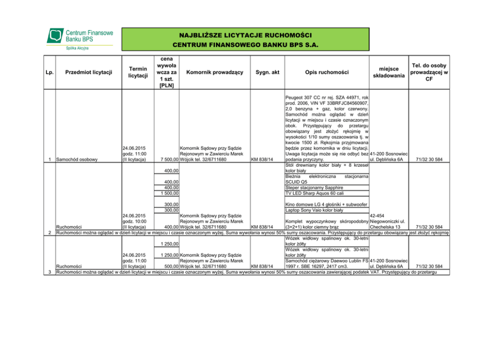NAJBLIŻSZE LICYTACJE RUCHOMOŚCI CENTRUM FINANSOWEGO BANKU BPS S.A. Lp. 1 Przedmiot licytacji Samochód osobowy Termin licytacji 24.06.2015 godz. 11:00 (II licytacja) cena wywoła wcza za 1 szt. [PLN] Komornik Sądowy przy Sądzie Rejonowym w Zawierciu Marek 7 500,00 Wójcik tel. 32/6711680 400,00 400,00 400,00 1 500,00 300,00 300,00 2 3 Komornik prowadzący Sygn. akt KM 838/14 Opis ruchomości miejsce składowania Peugeot 307 CC nr rej. SZA 44971, rok prod. 2006, VIN VF 33BRFJC84560907, 2,0 benzyna + gaz, kolor czerwony. Samochód można oglądać w dzień licytacji w miejscu i czasie oznaczonym obok. Przystępujący do przetargu obowiązany jest złożyć rękojmię w wysokości 1/10 sumy oszacowania tj. w kwocie 1500 zł. Rękojmia przyjmowana będzie przez komornika w dniu licytacji. Uwaga licytacja może się nie odbyć bez 41-200 Sosnowiec podania przyczyny. ul. Dęblińska 6A Stól drewniany kolor biały + 8 krzeseł kolor biały Bieżnia elektroniczna stacjonarna SCUID Q5 Steper stacjonarny Sapphire TV LED Sharp Aquos 60 cali Tel. do osoby prowadzącej w CF 71/32 30 584 Kino domowe LG 4 głośniki + subwoofer Laptop Sony Vaio kolor biały 24.06.2015 Komornik Sądowy przy Sądzie 42-454 godz. 10:00 Rejonowym w Zawierciu Marek Komplet wypoczynkowy skóropodobny Niegowoniczki ul. Ruchomości (II licytacja) KM 838/14 Chechelska 13 71/32 30 584 400,00 Wójcik tel. 32/6711680 (3+2+1) kolor ciemny brąz Ruchomości można oglądać w dzień licytacji w miejscu i czasie oznaczonym wyżej. Suma wywołania wynosi 50% sumy oszacowania. Przystępujący do przetargu obowiązany jest złożyć rękojmię Wózek widłowy spalinowy ok. 30-letni 1 250,00 kolor żółty Wózek widłowy spalinowy ok. 30-letni 24.06.2015 1 250,00 Komornik Sądowy przy Sądzie kolor żółty godz. 11:00 Rejonowym w Zawierciu Marek Samochód ciężarowy Daewoo Lublin FS 41-200 Sosnowiec Ruchomości (II licytacja) KM 838/14 ul. Dęblińska 6A 71/32 30 584 500,00 Wójcik tel. 32/6711680 1997 r. SBE 16297, 2417 cm3. Ruchomości można oglądać w dzień licytacji w miejscu i czasie oznaczonym wyżej. Suma wywołania wynosi 50% sumy oszacowania zawierającej podatek VAT. Przystępujący do przetargu