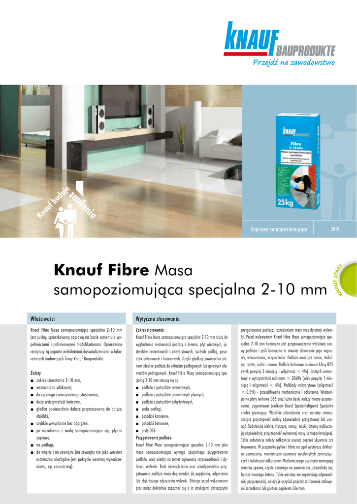 e uj ud fb au Kn ie an uf za Zaprawy samopoziomujące 2010 Knauf Fibre Masa samopoziomująca specjalna 2-10 mm Właściwości Wytyczne stosowania Knauf Fibre Masa samopoziomująca specjalna 2-10 mm jest suchą, sproszkowaną zaprawą na bazie cementu z wypełniaczami i polimerowymi modyfikatorami. Opracowane receptury są poparte wieloletnimi doświadczeniami w laboratoriach badawczych firmy Knauf Bauprodukte. Zakres stosowania Knauf Fibre Masa samopoziomująca specjalna 2-10 mm służy do wygładzania nierówności podłoży z drewna, płyt wiórowych, jastrychów cementowych i anhydrytowych, suchych podłóg, posadzek betonowych i kamiennych. Dzięki gładkiej powierzchni stanowi idealne podłoże do okładzin podłogowych lub gotowych elementów podłogowych. Knauf Fibre Masę samopoziomującą specjalną 2-10 mm stosuję się na: ■■ podłoża z jastrychów cementowych, ■■ podłoża z jastrychów cementowych płynnych, ■■ podłoża z jastrychów anhydrytowych, ■■ suche podłogi, ■■ posadzki kamienne, ■■ posadzki betonowe, ■■ płyty OSB. Przygotowanie podłoża Knauf Fibre Masa samopoziomująca specjalna 2-10 mm jako masa samopoziomująca wymaga specjalnego przygotowania podłoża, oraz wiedzy na temat wylewania rozprowadzania i dylatacji wylewki. Brak doświadczenia oraz nieodpowiednie przygotowanie podłoża może doprowadzić do popękania, odparzenia lub zbyt dużego odprężenia wylewki. Dlatego przed wykonaniem prac należ dokładnie zapoznać się z in strukcjami dotyczącymi Zalety ■ ■ zakres stosowania 2-10 mm, ■ ■ wzmocniona włóknami, ■■ do ręcznego i maszynowego stosowania, ■ ■ duża wytrzymałość końcowa, ■ ■ gładka powierzchnia dobrze przystosowana do dalszej obróbki, ■ ■ szybkie wysychanie bez odprężeń, ■■ po rozrobieniu z wodą samopoziomująca się, płynna zaprawa, ■ ■ na podłogi, ■ ■ do wnętrz i na zewnątrz (na zewnątrz nie jako warstwa ostateczna niezbędne jest pokrycie warstwą wykończeniową, np. ceramiczną). przygotowania podłoża, rozrobieniem masy oraz dylatacji wylewki. Przed wylewaniem Knauf Fibre Masa samopoziomująca specjalna 2-10 mm konieczne jest przeprowadzenie właściwej oceny podłoża i jeśli konieczne to również dokonanie jego naprawy, wzmocnienia, oczyszczenia. Podłoże musi być nośne, stabilne, czyste, suche i mocne. Podłoże betonowe minimum klasy B25 (wiek powyżej 3 miesięcy i wilgotność < 4%). Jastrych cementowy o wytrzymałości minimum > 20MPa (wiek powyżej 1 miesiąca i wilgotności < 4%). Podkłady anhydrytowe (wilgotność < 0,5%) - przeszlifowane mechanicznie i odkurzone. Wodoodporne płyty wiórowe OSB oraz luźne deski należy mocno przymocować, zagruntować środkiem Knauf Spezialhaftgrund Specjalny środek gruntujący. Wszelkie zabrudzenia oraz warstwy zmniejszające przyczepność należy odpowiednio przygotować lub usunąć. Substancje oleiste, tłuszcze, smary, woski, bitumy wykluczają odpowiednią przyczepność wylewanej masy samopoziomującej. Takie substancje należy całkowicie usunąć poprzez skuwanie czy frezowanie. W przypadku pyłów i błota na ogół wystarcza dokładne zamiecenie, mechaniczne usuwanie wyschniętych zanieczyszczeń i ostateczne odkurzenie. Mechanicznego usunięcia wymagają warstwy spoiwa, często obecnego na powierzchni, zdawałoby się, bardzo mocnego betonu. Takie warstwy nie zapewniają odpowiedniej przyczepności, należy je oczyścić poprzez szlifowanie stalowymi szczotkami lub grubym papierem ściernym. Wytyczne stosowania Dylatacje Przed wylewaniem Knauf Fibre Masy samopoziomującej specjalnej 2-10 mm niezbędne jest wykonanie dylatacji oddzielającej wylaną masę od ściany stosując specjalną brzegową taśmę dylatacyjną lub cienkie paski styropianu. Również konieczne jest przeniesienie istniejących szczelin dylatacyjnych ze starego podłoża. W celu ograniczenia rys tworzących się w wyniku naprężeń skurczowych wycina się dylatacje kontrolne w świeżej zaprawie w ciągu 42 godzin od jej wylania. Dylatacje kontrolne wykonujemy przy uskokach powierzchni, w strefie drzwi oraz w celu dalszego podziału powierzchni w większych od 20 m 2. Gruntowanie Przed wylewaniem Knauf Fibre Masy samopoziomującej specjalnej 2-10 mm należy odpowiednio zagruntować podłoże dla jego wzmocnienia oraz po to aby zapobiec zbyt szybkiemu oddawaniu wody do podłoża. Podłoża drewniane należy zagruntować Knauf Spezialhaftgrund Specjalnym środkiem gruntującym. Podłoża o dużej chłonności (szlichty cementowe) oraz podłoża niechłonne (posadzki kamienne, ceramiczne, lastryko) należy zagruntować Knauf Goldband Haftgrund Środkiem gruntującym. Zarabianie zaprawy 25 kg Knauf Fibre Masy samopoziomującej specjalnej 2-10 mm wsypać do 6 l czystej wody i rozmieszać aż do uzyskania jednorodnej masy (nie dodawać więcej wody!), następnie odczekać ok. 5 minut (na odpowietrzenie masy) i całość wymieszać ponownie. Do mieszania używać czystych narzędzi oraz mieszadła wolnoobrotowego (max 600 obr./min). Nanoszenie Masę należy rozprowadzać pasami, za pomocą pacy wspomagać rozpływanie się zaprawy. Nadmiar zaprawy rozprowadzić listwą zagarniającą a następnie odpowietrzyć wałkiem kolczastym. Maksymalna jednorazowa grubość zaprawy wynosi 10 mm. Drugą warstwę nakłada się po upływie 4 godzin. Czas zużycia wynosi ok. 20 minut. Wskazówki uzupełniające ■ ■ prace należy wykonywać w suchych warunkach, przy temperaturze powietrza i podłoża od +5°C do +25°C, ■ ■ narzędzia pracy należy przemyć wodą natychmiast po wykonaniu prac, ■ ■ świeżą warstwę masy chronić przed nasłonecznieniem i przeciągami, ■ ■ klejenie płytek ceramicznych i z kamienia naturalnego przy wilgotności < 3%, ■ ■ klejenie okładzin PCV przy wilgotności < 2,5%. Uwagi Wszelkie dane odnoszą się do temperatury +23°C i wilgotności względnej powietrza 60%. W innych warunkach nal