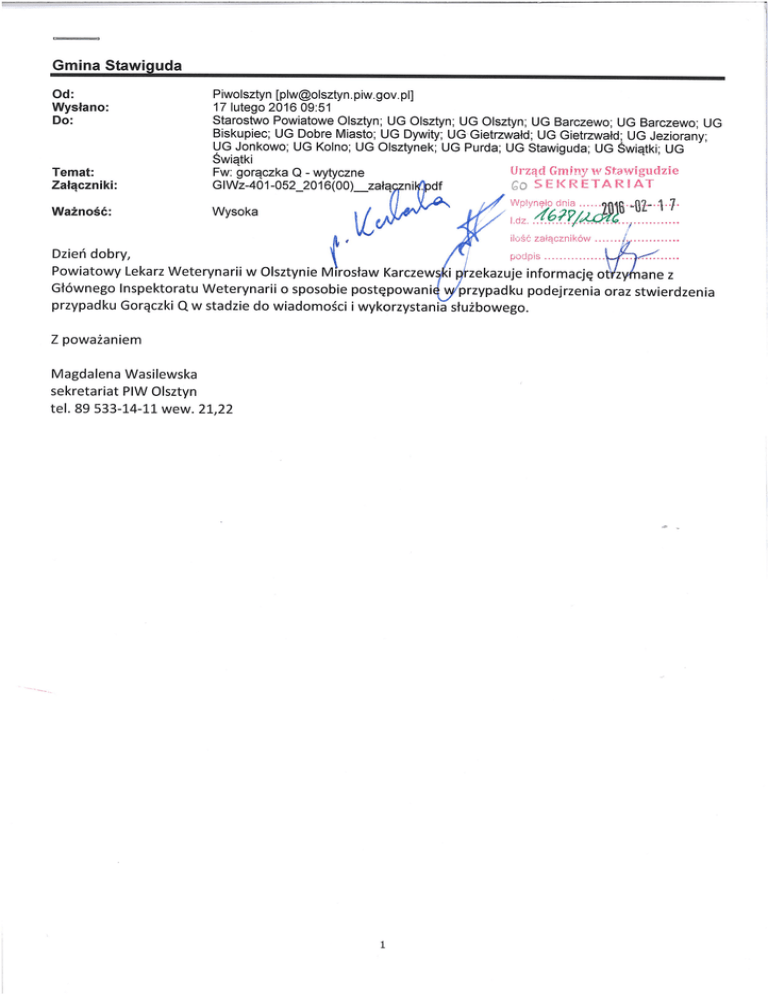 Gorączka Q – epidemiologia, patogeneza oraz diagnostyka laboratoryjna. Wskazówki dla lekarzy weterynarii i hodowców 1. Epidemiologia Gorączka Q jest chorobą zakaźną występującą zarówno u zwierząt domowych i dzikich oraz ludzi. Czynnikiem etiologicznym tej zoonozy jest drobnoustrój Coxiella burnetii. Dane literaturowe z ostatnich lat wskazują, że gorączka Q stanowi wciąż istotny problem zdrowotny zarówno u ludzi jak i zwierząt. Przypadki choroby stwierdzane są zarówno w Polsce, jak i innych państwach europejskich. Pierwszy przypadek gorączki Q w naszym kraju został zanotowany w 1956 roku, natomiast największe ognisko choroby wystąpiło w 1982 roku w stadzie krów mlecznych, ośrodka hodowli zarodowej w Ulhówku (powiat hrubieszowski, województwo lubelskie). Wówczas to miała miejsce największa do dziś w Polsce oraz największa wówczas w skali świata, epidemia gorączki Q u ludzi. Od tego momentu na terenie Polski południowo-wschodniej co pewien czas stwierdzane są przypadki choroby zarówno u ludzi jak i zwierząt, a obszar ten określany jest mianem wieloletniej enzoocji i wtórnej endemii tej choroby w naszym kraju. Od 2010 roku w Polsce zostały wprowadzone badania monitoringowe u przeżuwaczy, których wyniki wskazują, że patogen ten jest obecny zarówno u bydła jak i owiec oraz kóz. Wraz ze wzrostem międzynarodowego obrotu handlowego zwierzętami i produktami pochodzenia zwierzęcego, istnieje ryzyko wprowadzenia do krajowej populacji zakażonych sztuk bydła, pochodzących z obszarów, gdzie stwierdzane są ogniska tej choroby. Ponadto, szczególną uwagę należy zwracać na zwierzęta importowane z Holandii, ponieważ w latach 2007-2010 miała tam miejsce największa jak do tej pory epidemia gorączki Q w Europie. Ponadto, ogniska gorączki Q stwierdzane były również u naszych bliskich sąsiadów (Słowacja, Niemcy). Poziom seroprewalencji u bydła w krajach europejskich sięga nawet 75%. Badania prowadzone w ramach Programu Wieloletniego w Polsce wskazują, że odsetek stad serododatnich w 2015 roku wynosił 41,7%. Jednak dodatni wynik badania serologicznego nie świadczy o przypadku choroby, dopiero uzyskanie wyniku dodatniego w badaniu potwierdzającym metodą real-time PCR (q PCR) jest podstawą do stwierdzenia ogniska choroby w stadzie. 2. Czynnik etiologiczny C. burnetii jest drobnoustrojem pleomorficznym, pozbawionym możliwości ruchu. Jest Gram-ujemna, ale niekiedy barwi się Gram-dodatnio. Opisano trzy formy morfologiczne C. burnetii: pierwszą, określaną jako większy wariant komórkowy (large cell variant - LCV) (0,4 – 1,0 m); drugą, określaną jako mniejszy wariant komórkowy (small cell variant - SCV) (0,2 – 0,4 m) oraz mały wariant komórkowy tzw. small dense cells (SDC). Ta ostatnia forma nigdy nie występuje w postaci odrębnych komórek, lecz towarzyszy wariantowi SCV, stanowiąc najprawdopodobniej jego etap pośredni. Coxielle namnażają się tylko w żywych komórkach zwierzęcych (hodowle komórkowe, zarodki kurze). Występują one w cytoplazmie 1/14 i łatwo ulegają fagocytozie, wykazując przy tym oporność na wewnątrzkomórkową inaktywację. Sfagocytowana komórka może nie tylko rozmnażać się przez podział poprzeczny, ale również wytwarzać endospory (wyłącznie formy SCV), oporne na działanie enzymów lizosomalnych. Drobnoustroje, w pierwszej fazie antygenowej, umiejscawiają się w monocytach. DNA C. burnetii może być wykazane u zwierząt zakażonych od miesięcy a nawet lat, w krążących we krwi monocytach lub szpiku kostnym. Rodzaj Coxiella cechuje zjawisko zwane zmiennością faz, polegające na występowaniu dwóch odmian antygenowych. W warunkach naturalnych oraz po zakażeniu doświadczalnym patogen ten występuje w fazie I. Natomiast pasaż przez woreczek żółtkowy zarodka kurzego lub hodowlę tkankową prowadzi do utraty antygenów powierzchniowych i szczep fazy I przechodzi w mniej zjadliwy szczep fazy II. Ponowny pasaż przez zwierzęta prowadzi do zmiany szczepu fazy II w fazę I. Zjawisko to prawdopodobnie powodowane jest zmiennością powierzchniowych struktur antygenowych, a dokładniej utratą w fazie II - O-swoistych łańcuchów wielocukrowych, będących składnikami lipopolisacharydu (LPS), co prowadzi do odsłonięcia ułożonych głębiej antygenów. Doprowadzają do tego mutacje punktowe wybranych genów, do których dochodzi podczas pasaży. Początkowo, po zakażeniu szczepami zjadliwymi, pojawiają się przeciwciała przeciwko fazie II (ok. 7-10 dnia po infekcji). Natomiast po ok. 20 dniach zaczynają być wykrywalne przeciwciała przeciwko antygenom fazy I. Dlatego też w diagnostyce serologicznej, pozwalającej na wykrycie wczesnego zakażenia, szczególnie przydatne są antygeny fazy II. Wysokie miana przeciwciał dla antygenów fazy II wskazują na niedawny kontakt zwierzęcia z zarazkiem, zwykle w czasie 6-8 miesięcy, natomiast wysokie miana przeciwciał dla antygenów fazy I sugerują infekcję przewlekłą. Wśród izolatów C. burnetii wykazano szczepy różniące się patogennością. Badania genetyczne tych szczepów pozwoliły powiązać zakres patogenności z różnicami w określonych plazmidach. Na tej podstawie wyróżniono 6 grup genetycznych. Grupy: I (szczep Hamilton), II (szczep Vacca), III (szczep Rasche) posiadają plazmid QpH1 i wywołują ostrą postać gorączki Q u ludzi. Grupa IV (szczep Biotzere) zawiera plazmid QpRS i jest odpowiedzialna za chroniczną postać choroby. Grupę V (szczep Corazon) wyróżnia niska zawartość plazmidowego DNA, a sekwencja QpRS zintegrowana jest z chromosomalnym DNA. Szczep tej grupy odpowiedzialny jest za wywoływanie chronicznych postaci zapalenia wsierdzia (endocarditis). Grupa VI (szczep Dod, zawiera plazmid QpDG) stwierdzana jest u gryzoni i obecnie uważana za niepatogenną dla ludzi. Przyjmuje się także podział uproszczony, zgodnie z którym różnice w zakresie patogenności uwarunkowane s