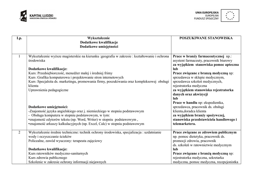 Lp. Wykształcenie Dodatkowe kwalifikacje Dodatkowe umiejętności POSZUKIWANE STANOWISKA 1 Wykształcenie wyższe magisterskie na kierunku :geografia w zakresie : kształtowanie i ochrona środowiska Prace w branży farmaceutycznej np.: asystent farmaceuty, pracownik biurowy za wyjątkiem stanowiska pomoc apteczna lub Prace związane z branzą medyczną np: sprzedawca w sklepie medycznym, sprzedawca szkoleń medycznych, rejestratorka medyczna za wyjątkiem stanowiska rejestratorka danych oraz akwizycji lub Prace w handlu np: ekspedientka, sprzedawca, pracownik ds. obsługi klienta,doradca klienta za wyjątkiem branży spożywczej, stanowiska przedstawiciela handlowego i telemarketera. Dodatkowe kwalifikacje: Kurs: Przedsiębiorczość, menedżer małej i średniej frimy Kurs :Grafika komputerowa i projektowanie stron internetowych Kurs :Specjalsita ds. marketingu, promowania firmy, poszukiwania oraz kompleksowej obsługi klienta Uprawnienia pedagogiczne Dodatkowe umiejętności: -Znajomość języka angielskiego oraz j. niemieckiego w stopniu podstawowym - Obsługa komputera w stopniu podstawowym, w tym: •znajomość edytorów tekstu (np. Word, Writer) w stopniu podstawowym , •znajomość arkuszy kalkulacyjnych (np. Excel, Calc) w stopniu podstawowym 2 Wykształcenie średnie techniczne: technik ochrony środowiska, specjalizacja : uzdatnianie wody i oczyszczanie ścieków Policealne, zawód wyuczony: terapeuta zajęciowy Dodatkowe kwalifikacje: Kurs ratowników medyczno-sanitarnych Kurs zdrowia publicznego Szkolenie w zakresie ochrony informacji niejawnych Prace związane ze zdrowiem publicznym np. pomoc dietetyka, pracownik ds. promocji zdrowia, pracownik ds. szkoleń w ratownictwie medycznym lub Prace związane z branżą medyczną np: rejestratorka medyczna, sekretarka medyczna, pomoc medyczna, recepcjonistka za wyjątkiem stanowiska związanego z akwizycją lub Prace administracyjno-biurowe, np. sekretarka, recepcjonistka, asystentka, operator wprowadzania danych, doradca klienta za wyjątkiem stanowiska starszego referenta, pracownika biurowego,, pracownika administracyjnobiurowego, referenta administracyjnobiurowego oraz pracownika ds. ewidencjonowania i archiwizacji dokumentacji jawnej Wykształcenie: Prace administracyjno-biurowe np.:pomoc Średnie ogólnokształcące biurowa, pracownik archiwum ,pracownik administracji, sekretarka, asystentka, recepcjonistka, operator wprowadzania Dodatkowe kwalifikacje: danych -prawo jazdy kat. B lub Inne prace biurowe za wyjątkiem Dodatkowe umiejętności: stanowiska:mł. referenta, st. referenta - Obsługa komputera w stopniu średniozaawansowanym, w tym: ekonomicznego oraz telemarketingu •znajomość edytorów tekstu (np. Word, Writer) w stopniu podstawowym lub •znajomość arkuszy kalkulacyjnych (np. Excel, Calc) w stopniu podstawowym Prace w branży handlowej np.: doradca klienta, pracownik biura obsługi klienta, fakturzystka za wyjątkiem stanowiska: sprzedawcy, handlowca, pracownika wypożyczalni kaset video i telemarketingu Wykształcenie średnie ogólnokształcące Prace administracyjno-biurowe np.: pracownik administracyjno-biurowy, Dodatkowe kwalifikacje: pracownik kancelaryjno -biurowy, -szkolenie "Poznaj komputer" pracownik archiwum za wyjątkiem –szkolenie komputerowe z zakresu Vista, Word, Excel, Internet- Outlook Express, Power Point, stanowiska referenta ds. administracji Access lub –Kurs podstawowej obsługi edytora tekstu MS Word Inne prace związane z obsługą biura za Dodatkowe umiejętności: -Znajomość języka angielskiego w stopniu podstawowym - Obsługa komputera w stopniu średniozaawansowanym, w tym: •znajomość edytorów tekstu (np. Word, Writer) w stopniu średniozaawansowanym, •znajomość arkuszy kalkulacyjnych (np. Excel, Calc) w stopniu podstawowym •obsługa poczty elektronicznej w stopniu średniozaawansowanym 3 4 –kurs kadry i płace –kurs podstawowej obsługi komputera IBM PC –kurs maszynopisania –świadectwo egzaminu na stanowisko sekretarza sądowego –kurs języka niemieckiego –prawo jazdy kat. B wyjątkiem stanowiska referenta ds administracji oraz telemarketingu i handlu Dodatkowe umiejętności: - znajomość języka niemieckiego w stopniu podstawowym - obsługa komputera w stopniu średniozaawansowanym, w tym: •znajomość edytorów tekstu (np. Word, Writer) w stopniu średniozaawansowanym, •znajomość arkuszy kalkulacyjnych (np. Excel, Calc) w stopniu podstawowym •program Power Point w stopniu podstawowym 6 Wykształcenie średnie ogólnokształcące Dodatkowe kwalifikacje: –kurs "Profesjonalny pracownik administracyjno-biurowy" –Kurs "Techniki orientacji na rynku pracy" –Kurs "Komputer w relacjach z klientami" –Szkolenie "Prawo na codzień" –Kurs języka niemieckiego – podstawowy –Kurs "Kasjer walutowo-złotówkowy" –Kurs kadr i płac 7 Dodatkowe umiejętności: - znajomość języka niemieckiego w stopniu podstawowym - obsługa komputera w stopniu podstawowym w tym: •znajomość edytorów tekstu (np. Word, Writer) w stopniu podstawowym, •znajomość arkuszy kalkulacyjnych (np. Excel, Calc) w stopniu podstawowym •znajomość Internetu w stopniu podstawowym •znajomość i obsługa poczty elektronicznej w stopniu podstawowym Wykształcenie średnie techniczne: technolog żywności (specjalność: produkcja piekarsko ciastkarska) oraz policealne: technik administracji państwowej. Inne prace związane z obsługą biura np.: asystentka, pracownik kancelaryjny, pracownik archiwum, pomoc archiwisty, rejestratorka, recepcjonistka za wyjątkiem stanowiska pracownika biurowego, pracownika administracyjno-biurowego oraz telemarketingu i handlu lub Prace związane z obsługą kadr i płac np.: pomoc biurowa z zakresu kadr i płac, pracownik ds. obsługi kadrowo-płacowej, pracownik ds. kadr, pracownik ds. płac. Prace związane z obsługą kadr, płac lub rozliczeń finansowych np.: pracownik ds. kadr, pomoc biurowa z zakresu obsługi kadr Dod