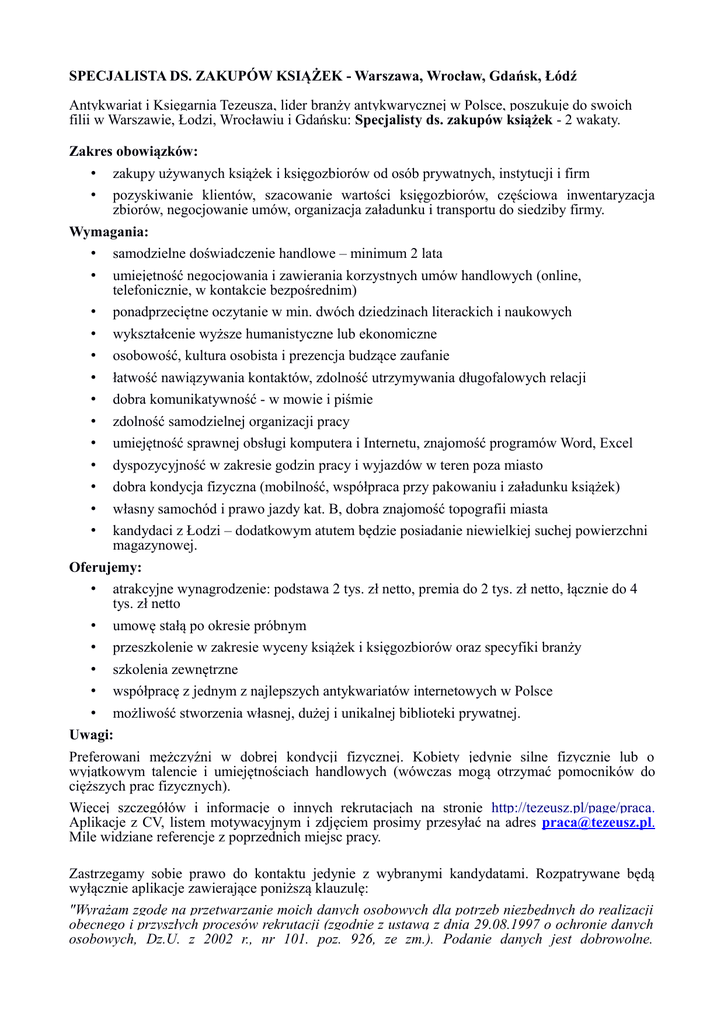 SPECJALISTA DS. ZAKUPÓW KSIĄŻEK - Warszawa, Wrocław, Gdańsk, Łódź Antykwariat i Księgarnia Tezeusza, lider branży antykwarycznej w Polsce, poszukuje do swoich filii w Warszawie, Łodzi, Wrocławiu i Gdańsku: Specjalisty ds. zakupów książek - 2 wakaty. Zakres obowiązków: • zakupy używanych książek i księgozbiorów od osób prywatnych, instytucji i firm • pozyskiwanie klientów, szacowanie wartości księgozbiorów, częściowa inwentaryzacja zbiorów, negocjowanie umów, organizacja załadunku i transportu do siedziby firmy. Wymagania: • samodzielne doświadczenie handlowe – minimum 2 lata • umiejętność negocjowania i zawierania korzystnych umów handlowych (online, telefonicznie, w kontakcie bezpośrednim) • ponadprzeciętne oczytanie w min. dwóch dziedzinach literackich i naukowych • wykształcenie wyższe humanistyczne lub ekonomiczne • osobowość, kultura osobista i prezencja budzące zaufanie • łatwość nawiązywania kontaktów, zdolność utrzymywania długofalowych relacji • dobra komunikatywność - w mowie i piśmie • zdolność samodzielnej organizacji pracy • umiejętność sprawnej obsługi komputera i Internetu, znajomość programów Word, Excel • dyspozycyjność w zakresie godzin pracy i wyjazdów w teren poza miasto • dobra kondycja fizyczna (mobilność, współpraca przy pakowaniu i załadunku książek) • własny samochód i prawo jazdy kat. B, dobra znajomość topografii miasta • kandydaci z Łodzi – dodatkowym atutem będzie posiadanie niewielkiej suchej powierzchni magazynowej. Oferujemy: • atrakcyjne wynagrodzenie: podstawa 2 tys. zł netto, premia do 2 tys. zł netto, łącznie do 4 tys. zł netto • umowę stałą po okresie próbnym • przeszkolenie w zakresie wyceny książek i księgozbiorów oraz specyfiki branży • szkolenia zewnętrzne • współpracę z jednym z najlepszych antykwariatów internetowych w Polsce • możliwość stworzenia własnej, dużej i unikalnej biblioteki prywatnej. Uwagi: Preferowani mężczyźni w dobrej kondycji fizycznej. Kobiety jedynie silne fizycznie lub o wyjątkowym talencie i umiejętnościach handlowych (wówczas mogą otrzymać pomocników do cięższych prac fizycznych). Więcej szczegółów i informacje o innych rekrutacjach na stronie http://tezeusz.pl/page/praca. Aplikacje z CV, listem motywacyjnym i zdjęciem prosimy przesyłać na adres [email protected]. Mile widziane referencje z poprzednich miejsc pracy. Zastrzegamy sobie prawo do kontaktu jedynie z wybranymi kandydatami. Rozpatrywane będą wyłącznie aplikacje zawierające poniższą klauzulę: "Wyrażam zgodę na przetwarzanie moich danych osobowych dla potrzeb niezbędnych do realizacji obecnego i przyszłych procesów rekrutacji (zgodnie z ustawą z dnia 29.08.1997 o ochronie danych osobowych, Dz.U. z 2002 r., nr 101. poz. 926, ze zm.). Podanie danych jest dobrowolne. Oświadczam, że zostałem poinformowany o prawie dostępu do treści moich danych osobowych oraz o prawie ich poprawiania i aktualizowania."