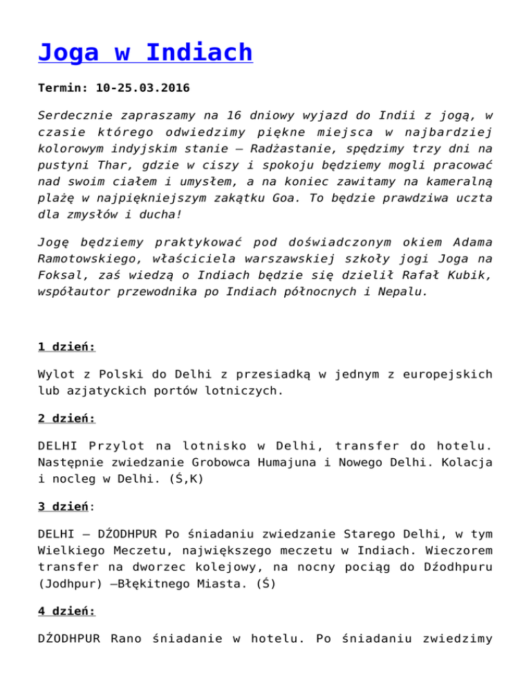 Joga w Indiach Termin: 10-25.03.2016 Serdecznie zapraszamy na 16 dniowy wyjazd do Indii z jogą, w czasie którego odwiedzimy piękne miejsca w najbardziej kolorowym indyjskim stanie – Radżastanie, spędzimy trzy dni na pustyni Thar, gdzie w ciszy i spokoju będziemy mogli pracować nad swoim ciałem i umysłem, a na koniec zawitamy na kameralną plażę w najpiękniejszym zakątku Goa. To będzie prawdziwa uczta dla zmysłów i ducha! Jogę będziemy praktykować pod doświadczonym okiem Adama Ramotowskiego, właściciela warszawskiej szkoły jogi Joga na Foksal, zaś wiedzą o Indiach będzie się dzielił Rafał Kubik, współautor przewodnika po Indiach północnych i Nepalu. 1 dzień: Wylot z Polski do Delhi z przesiadką w jednym z europejskich lub azjatyckich portów lotniczych. 2 dzień: DELHI Przylot na lotnisko w Delhi, transfer do hotelu. Następnie zwiedzanie Grobowca Humajuna i Nowego Delhi. Kolacja i nocleg w Delhi. (Ś,K) 3 dzień: DELHI – DŹODHPUR Po śniadaniu zwiedzanie Starego Delhi, w tym Wielkiego Meczetu, największego meczetu w Indiach. Wieczorem transfer na dworzec kolejowy, na nocny pociąg do Dźodhpuru (Jodhpur) –Błękitnego Miasta. (Ś) 4 dzień: DŹODHPUR Rano śniadanie w hotelu. Po śniadaniu zwiedzimy Dźodhpur, m.in. potężną twierdzę Mehrangarh, jeden z największych fortów w Indiach. Udamy się również do Ogrodu Mandore. Kolacja i nocleg w Dźodhpurze. (Ś,K) 5 dzień: DŹODHPUR – DŹAJSALMER Po śniadaniu transfer na stację kolejową, gdzie wsiądziemy na pociąg do Dźajsalmer (Jaisalmer) – Złotego Miasta. Po południu pojedziemy dżipami na pustynie, gdzie na wydmach będziemy mieli możliwość podziwiania zachodu słońca. Kolacja i nocleg na pustyni. (Ś,O,K) 6 dzień: PUSTYNIA THAR Dzień na pustyni. Przejazd dżipami oraz wielbłądami. Obiad, kolacja i nocleg na pustyni. (Ś,O,K) 7 dzień: PUSTYNIA THAR Wczesna pobudka by zobaczyć wschód słońca. Następnie razem z wielbłądami powędrujemy do kolejnego miejsca na pustyni. Obiad, kolacja i nocleg na pustyni. (Ś,O,K) 8 dzień: DŹAJSALMER Po śniadaniu pożegnamy się z pustynią i pojedziemy do hotelu w Dźajsalmer. Po południu czas wolny. Kolacja i nocleg w Dźajsalmer. (Ś,K) 9 dzień: DŹAJSALMER – DŹAJPUR Rano zwiedzimy piękny fort i pospacerujemy po mieście. Po południu wsiądziemy w pociąg do Dźajpuru – Różowego Miasta, gdzie przybędziemy wczesnym rankiem. (Ś) 10 dzień: DŹAJPUR Po śniadaniu ruszymy na zwiedzanie miasta. Zobaczymy słynny Pałac Wiatrów, obserwatorium astronomiczne, kompleks pałacowy maharadżów Dźajpuru oraz monumentalny fort Amber. Kolacja i nocleg w Dźajpurze. (Ś,K) 11 dzień: DŹAJPUR – GOA Rano transfer na lotnisko. Lot na Goa przez Bombaj. Transfer do zacisznej miejscowości nad piękną plażą. Zakwaterowanie w domkach przy plaży. Kolacja i nocleg na Goa. (Ś) 12- 14 dzień: GOA Relaks i praktyka jogi. Noclegi na Goa. (Ś) 15 dzień: POŻEGNANIE Transfer na lotnisko w Goa, skąd, przez jeden z bliskowschodnich portów udamy się do Polski. (Ś) 16 dzień: Powrót do Polski. Wielkość grupy: 12-16 osób Cena: 4670 PLN + 770 USD + bilet lotniczy ok. 2500 PLN W razie zainteresowania wyjazdem prosimy o kontakt na numer: 503 010 070 Rafał Kubik Cena zawiera: -/ noclegi zgodnie z programem, -/ wyżywienie zgodnie z programem (Ś-śniadanie, O-obiad, Kkolacja), -/ opłatę wizową, -/ zajęcia jogi, -/ przelot samolotem z Dźajpuru do Goa z międzylądowaniem w Bombaju, -/ bilety wstępu zgodnie z programem, -/ przejazdy samochodami z klimatyzacją zgodnie z programem, -/ safari na wielbłądach, -/ bilety kolejowe zgodnie z programem : Delhi-Dźodhpur (3 klasa A/C); Dźodhpur-Dźajsalmer (3 klasa A/C); Dźajsalmer-Dźajpur (3 klasa A/C), -/ lokalne opłaty klimatyczne, -/ lokalni przewodnicy, -/ opiekę polskiego pilota, -/ ubezpieczenie KL, NNW, bagażu. Cena nie zawiera: -/ dopłat za kamery i aparaty fotograficzne, -/ zwyczajowych napiwków, -/ dodatkowego wyżywienia i napojów. Zaliczka: 500 PLN + 770 USD + przelot (12-15 osób), 4070 zł + 770 USD + przelot (16-18 osób) UWAGA: * Część w PLN:zaliczka (500zł) płatna w biurze przed wyjazdem; pozostała kwota w PLN – 60 dni przed wyjazdem *Część w USD: płatna pilotowi/rezydentowi pierwszego dnia po przylocie na miejsce. Banknoty USD muszą być wydane po 2002 roku, nie mogą być zniszczone, zapisane. * Przelot – Nasze biuro zajmie się zakupem biletów lotniczych. Po zebraniu się grupy, szukamy dla Państwa najkorzystniejszej opcji przelotu. Po zaakceptowaniu i wpłacie, dokonujemy zakupu. Cena biletu lotniczego na trasie Warszawa-Delhi i GoaWarszawa to ok. 2500-3000 PLN – im wcześniej zakup, tym niższa cena. Na miesiąc przed wyjazdem cena może przekraczać 3000 PLN. Osoby zainteresowane wyjazdem prosimy więc o szybki kontakt, aby zwiększyć możliwość zakupu biletów po niższej cenie. Cena wyjazdu ulegnie zmianie wraz ze ze wzrostem cen biletów lotniczych. * Podana cena jest ceną orientacyjną. Szczegółowe składniki ceny są umieszczone w warunkach oferty. *Cena wyjazdu jest każdorazowo potwierdzana przez Organizatora. Wyprawa do Indii i Nepalu Indie – kraj legenda, kraj kontrastów, fascynujący różnorodnością kultur, religii, krajobrazów, kolorów i zapachów. Wielkie miasta kontrastują z tajemniczymi klasztorami, zaśnieżone wierzchołki Himalajów z piaskami pustyń Radżastanu. Nepal – tajemnicze królestwo na dachu świata o wielowiekowej historii, zadziwia różnorodnością grup etnicznych, zachwyca krajobrazami. DZIEŃ 1 SOBOTA, 28/02/2015 WARSZAWA- DELHI Godz. 07.30 – spotkanie z pilotem Tadeuszem Jędrysiakiem (tel.605 654 347) na lotnisku Warszawa-Okęcie przy stanowisku odpraw Szwajcarskich Linii Lotniczych SWISS Godz. 09.40 – odlot do Zurychu (LX1343 Y) Godz. 11.50 – przelot do Zurychu, tranzyt Godz. 12.45 – odlot do Delhi (LX146 Y) DZIEŃ 2 NIEDZIELA, 01/03/2015 Godz. 00.45 przylot do Delhi DELHI (