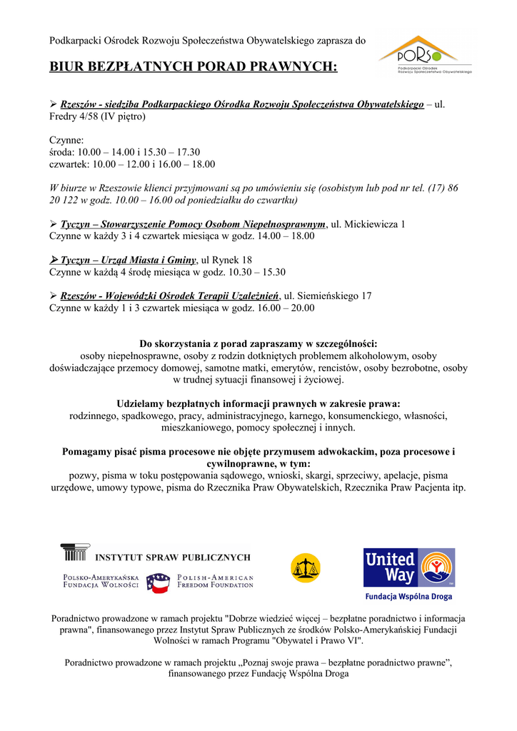 Podkarpacki Ośrodek Rozwoju Społeczeństwa Obywatelskiego zaprasza do BIUR BEZPŁATNYCH PORAD PRAWNYCH: Rzeszów - siedziba Podkarpackiego Ośrodka Rozwoju Społeczeństwa Obywatelskiego – ul. Fredry 4/58 (IV piętro) Czynne: środa: 10.00 – 14.00 i 15.30 – 17.30 czwartek: 10.00 – 12.00 i 16.00 – 18.00 W biurze w Rzeszowie klienci przyjmowani są po umówieniu się (osobistym lub pod nr tel. (17) 86 20 122 w godz. 10.00 – 16.00 od poniedziałku do czwartku) Tyczyn – Stowarzyszenie Pomocy Osobom Niepełnosprawnym, ul. Mickiewicza 1 Czynne w każdy 3 i 4 czwartek miesiąca w godz. 14.00 – 18.00 Tyczyn – Urząd Miasta i Gminy, ul Rynek 18 Czynne w każdą 4 środę miesiąca w godz. 10.30 – 15.30 Rzeszów - Wojewódzki Ośrodek Terapii Uzależnień, ul. Siemieńskiego 17 Czynne w każdy 1 i 3 czwartek miesiąca w godz. 16.00 – 20.00 Do skorzystania z porad zapraszamy w szczególności: osoby niepełnosprawne, osoby z rodzin dotkniętych problemem alkoholowym, osoby doświadczające przemocy domowej, samotne matki, emerytów, rencistów, osoby bezrobotne, osoby w trudnej sytuacji finansowej i życiowej. Udzielamy bezpłatnych informacji prawnych w zakresie prawa: rodzinnego, spadkowego, pracy, administracyjnego, karnego, konsumenckiego, własności, mieszkaniowego, pomocy społecznej i innych. Pomagamy pisać pisma procesowe nie objęte przymusem adwokackim, poza procesowe i cywilnoprawne, w tym: pozwy, pisma w toku postępowania sądowego, wnioski, skargi, sprzeciwy, apelacje, pisma urzędowe, umowy typowe, pisma do Rzecznika Praw Obywatelskich, Rzecznika Praw Pacjenta itp. Poradnictwo prowadzone w ramach projektu "Dobrze wiedzieć więcej – bezpłatne poradnictwo i informacja prawna", finansowanego przez Instytut Spraw Publicznych ze środków Polsko-Amerykańskiej Fundacji Wolności w ramach Programu "Obywatel i Prawo VI". Poradnictwo prowadzone w ramach projektu „Poznaj swoje prawa – bezpłatne poradnictwo prawne”, finansowanego przez Fundację Wspólna Droga