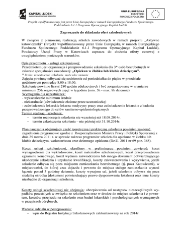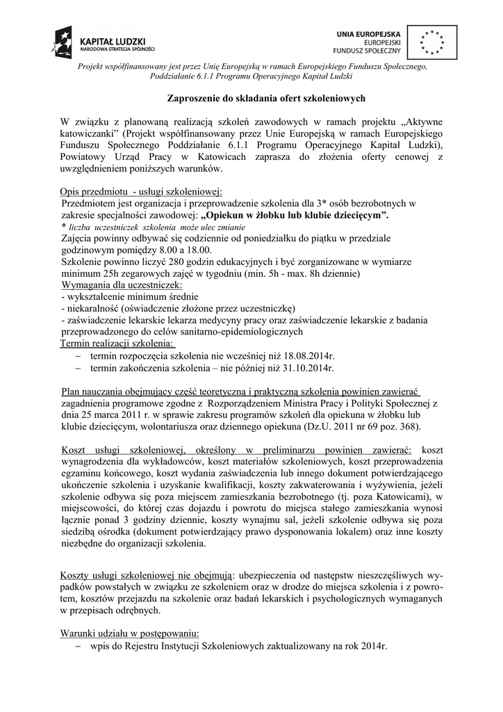 Projekt współfinansowany jest przez Unię Europejską w ramach Europejskiego Funduszu Społecznego, Poddziałanie 6.1.1 Programu Operacyjnego Kapitał Ludzki Zaproszenie do składania ofert szkoleniowych W związku z planowaną realizacją szkoleń zawodowych w ramach projektu „Aktywne katowiczanki” (Projekt współfinansowany przez Unie Europejską w ramach Europejskiego Funduszu Społecznego Poddziałanie 6.1.1 Programu Operacyjnego Kapitał Ludzki), Powiatowy Urząd Pracy w Katowicach zaprasza do złożenia oferty cenowej z uwzględnieniem poniższych warunków. Opis przedmiotu - usługi szkoleniowej: Przedmiotem jest organizacja i przeprowadzenie szkolenia dla 3* osób bezrobotnych w zakresie specjalności zawodowej: „Opiekun w żłobku lub klubie dziecięcym”. * liczba uczestniczek szkolenia może ulec zmianie Zajęcia powinny odbywać się codziennie od poniedziałku do piątku w przedziale godzinowym pomiędzy 8.00 a 18.00. Szkolenie powinno liczyć 280 godzin edukacyjnych i być zorganizowane w wymiarze minimum 25h zegarowych zajęć w tygodniu (min. 5h - max. 8h dziennie) Wymagania dla uczestniczek: - wykształcenie minimum średnie - niekaralność (oświadczenie złożone przez uczestniczkę) - zaświadczenie lekarskie lekarza medycyny pracy oraz zaświadczenie lekarskie z badania przeprowadzonego do celów sanitarno-epidemiologicznych Termin realizacji szkolenia: termin rozpoczęcia szkolenia nie wcześniej niż 18.08.2014r. termin zakończenia szkolenia – nie później niż 31.10.2014r. Plan nauczania obejmujący część teoretyczną i praktyczną szkolenia powinien zawierać zagadnienia programowe zgodne z Rozporządzeniem Ministra Pracy i Polityki Społecznej z dnia 25 marca 2011 r. w sprawie zakresu programów szkoleń dla opiekuna w żłobku lub klubie dziecięcym, wolontariusza oraz dziennego opiekuna (Dz.U. 2011 nr 69 poz. 368). Koszt usługi szkoleniowej, określony w preliminarzu powinien zawierać: koszt wynagrodzenia dla wykładowców, koszt materiałów szkoleniowych, koszt przeprowadzenia egzaminu końcowego, koszt wydania zaświadczenia lub innego dokument potwierdzającego ukończenie szkolenia i uzyskanie kwalifikacji, koszty zakwaterowania i wyżywienia, jeżeli szkolenie odbywa się poza miejscem zamieszkania bezrobotnego (tj. poza Katowicami), w miejscowości, do której czas dojazdu i powrotu do miejsca stałego zamieszkania wynosi łącznie ponad 3 godziny dziennie, koszty wynajmu sal, jeżeli szkolenie odbywa się poza siedzibą ośrodka (dokument potwierdzający prawo dysponowania lokalem) oraz inne koszty niezbędne do organizacji szkolenia. Koszty usługi szkoleniowej nie obejmują: ubezpieczenia od następstw nieszczęśliwych wypadków powstałych w związku ze szkoleniem oraz w drodze do miejsca szkolenia i z powrotem, kosztów przejazdu na szkolenie oraz badań lekarskich i psychologicznych wymaganych w przepisach odrębnych. Warunki udziału w postępowaniu: wpis do Rejestru Instytucji Szkoleniowych zaktualizowany na rok 2014r. wiedza i doświadczenie w realizacji szkoleń zawodowych w szczególności w zakresie objętym niniejszym zaproszeniem program szkolenia zatwierdzony przez Ministra Pracy i Polityki Społecznej Dokumenty wymagane do złożenia w ofercie szkoleniowej: program szkolenia (wg wzoru) harmonogram szkolenia (wg wzoru) preliminarz szkolenia (wg wzoru) referencje potwierdzające doświadczenie ośrodka szkoleniowego w realizacji szkolenia w zakresie, którego ośrodek składa ofertę szkoleniową (kopie potwierdzone za zgodność z oryginałem) wzór zaświadczenia lub innego dokumentu potwierdzającego ukończenie szkolenia i uzyskanie umiejętności lub kwalifikacji, o ile przepisy odrębne nie stanowią inaczej, zawierający: numer z rejestru, imię i nazwisko oraz PESEL uczestnika szkolenia, nazwę instytucji szkoleniowej przeprowadzającej szkolenie, formę i nazwę szkolenia, okres trwania szkolenia, miejsce i datę wydania zaświadczenia, tematy i wymiar godzin zajęć edukacyjnych, podpis osoby upoważnionej przez instytucję przeprowadzającą szkolenie; zaświadczenie powinno być opatrzone logotypami projektu informację pisemną nt. dostosowania kwalifikacji i doświadczenia kadry dydaktycznej do zakresu szkolenia oświadczenie o aktualnym wpisie do Rejestru Instytucji Szkoleniowych certyfikaty jakości usług/akredytacje posiadane przez instytucję szkoleniową (kopie potwierdzone za zgodność z oryginałem) wydruk z Centralnej Ewidencji i Informacji o Działalności Gospodarczej lub z Krajowego Rejestru Sądowego o prowadzeniu działalności gospodarczej w zakresie usług szkoleniowych lub pozostałych pozaszkolnych form edukacji pełnomocnictwo do podpisania umowy szkoleniowej z Powiatowym Urzędem Pracy w Katowicach, jeśli osoba wyznaczona do podpisu umowy nie jest wskazana w dokumentach rejestrowych firmy jako jej reprezentant decyzja o zatwierdzeniu programu szkolenia przez Ministra Pracy i Polityki Społecznej (kopia potwierdzona za zgodność z oryginałem) . Kryteria wyboru instytucji szkoleniowej, której zlecone zostanie przeprowadzenie szkolenia zawodowego: jakość oferowanego programu szkolenia sposób organizacji zajęć praktycznych dostosowanie kwalifikacji i doświadczenia kadry dydaktycznej do zakresu szkolenia dostosowanie wyposażenia dydaktycznego i pomieszczeń do potrzeb szkolenia posiadanie przez instytucję szkoleniową certyfikaty jakości usług / akredytacja koszt szkolenia dostępność miejsca szkolenia dla jego uczestniczek Miejsce składania ofert szkoleniowych: Biuro podawcze Powiatowego Urzędu Pracy w Katowicach, ul. Pośpiecha 14. Termin składania ofert szkoleniowych: do dnia 25.07.2014r. (termin składania ofert może zostać przedłużony). Niniejsze postępowanie jest prowadzone z wyłączeniem przepisów ustawy Prawo zamówień publicznych (Dz. U. Z 2013r., poz. 907 z późn. zm.). Złożenie oferty szkoleniowej nie jest traktowane jako zlecenie wykonania usługi 