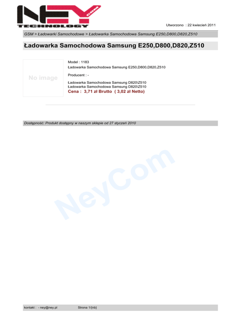 Utworzono : 22 kwiecień 2011 GSM > Ładowarki Samochodowe > Ładowarka Samochodowa Samsung E250,D800,D820,Z510 Ładowarka Samochodowa Samsung E250,D800,D820,Z510 Model : 1183 Ładowarka Samochodowa Samsung E250,D800,D820,Z510 No image Producent : Ładowarka Samochodowa Samsung D820\Z510 Ładowarka Samochodowa Samsung D820\Z510 Cena : 3,71 zł Brutto ( 3,02 zł Netto) Dostępność: Produkt dostępny w naszym sklepie od 27 styczeń 2010 C y m o e N kontakt : - [email protected] Strona 1/{nb}