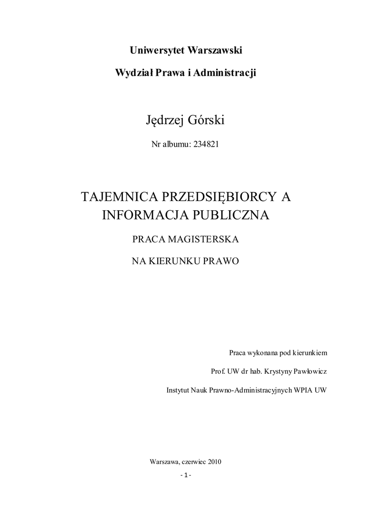 Uniwersytet Warszawski Wydział Prawa i Administracji Jędrzej Górski Nr albumu: 234821 TAJEMNICA PRZEDSIĘBIORCY A INFORMACJA PUBLICZNA PRACA MAGISTERSKA NA KIERUNKU PRAWO Praca wykonana pod kierunkiem Prof. UW dr hab. Krystyny Pawłowicz Instytut Nauk Prawno-Administracyjnych WPIA UW Warszawa, czerwiec 2010 - 1- Oświadczenie kierującego pracą Oświadczam, że niniejsza praca została przygotowana pod moim kierunkiem i stwierdzam, że spełnia ona warunki do przedstawienia jej w postępowaniu o nadanie tytułu zawodowego. Data Podpis kierującego pracą Oświadczenie autora pracy Świadom odpowiedzialności prawnej oświadczam, że niniejsza praca dyplomowa została napisana przez mnie samodzielnie i nie zawiera treści uzyskanych w sposób niezgodny z obowiązującymi przepisami. Oświadczam również, że przedstawiona praca nie była wcześniej przedmiotem procedur związanych z uzyskaniem tytułu zawodowego w wyższej uczelni. Oświadczam ponadto, że niniejsza wersja pracy jest identyczna z załączoną wersją elektroniczną. Data Podpis autora (autorów) pracy - 2- Streszczenie Przedsiębiorcy przysługuje prawo ochrony tajemnicy handlowej, a społeczeństwu przysługuje prawo do informacji publicznej. Podmioty zobowiązane do udostępniania tej informacji często znajdują się w posiadaniu tajemnic handlowych, dlatego dochodzi do konfliktu między tymi prawami na gruncie u.d.i.p. oraz regulacji szczególnych, na potrzeby których tajemnica handlowa definiowana jest różnie zarówno od strony przedmiotowej jak i podmiotowej. Przepisy te uniemożliwiają przedsiębiorcom aktywny udział w procedurach prowadzących do ujawnienia informacji ich dotyczących, przez co organy administracji zbyt często od mawiają udostępnienia informacji same chroniąc interes przedsiębiorców. Społeczeństwo może natomiast, tylko w ograniczony sposób, zwracać się bezpośrednio do przedsiębiorców o udostępnienie informacji o ich działalności. Słowa kluczowe informacja, publiczna, tajemnica ,handlowa, środowiska, zamówienia , prawa człowieka, pomoc, finanse, własność, intelektualna Dziedzina pracy (kody wg programu Socrates-Erasmus) 10900 Inne nauki prawne (Others Laws) Tytuł pracy w języku angielskim Entrepreneur’s secrets versus access to public information - 3- SPIS TREŚ CI CELE OPRACOWANIA................................................................................................................................................. - 6 ROZDZIAŁ I .................................................................................................................................................................... - 10 ZNACZENIE DOSTĘPU DO INFORMACJ I PUB LICZNEJ ........................................................................... - 10 - I.1 INFORMACJA PUBLICZNA W UJĘCIU HISTORYCZNYM ORAZ Z PUNKTU WIDZENIA OCHRONY PRAW CZŁOWIEKA ....................................................................................... - 10 I.2 DOSTĘP DO INFORMACJI PUBLICZNEJ W PRAWIE UE............................................ - 16 I.3 DOSTĘP DO INFOMRACJI PUBLICZNEJ W PRAWIE POLSKIM ................................ - 22 I.4 WNIOSKI ...................................................................................................................... - 33 Rozdział II .......................................................................................................................................................................... - 35 ZNACZENIE OCHRONY TAJ EMNICY HANDLOWEJ .................................................................................. - 35 - I.1 PRAWO DO PRYWATNOŚCI A PRZEDSIĘBIORCA .................................................... - 35 II.2 POJĘCIA PRZEDSIĘBIORCY ORAZ TAJEMNICY HANDLOWEJ PRZEDSIĘBIORCY/PRZEDSIĘBIORSTWA ....................................................................... - 45 II.3 INTERES PRAWNY PRZEDSIĘBIORCY W POSTĘPOWANIU O UDOSTĘPNIENIE INFORMACJI PUBLICZNEJ............................................................................................... - 54 ROZDZIAŁ III ................................................................................................................................................................. - 63 TAJ EMNICA PRZEDS IĘB IORCY B IORĄCEGO UDZIAŁ W WYKONYWANIU ZADAŃ PUB LICZNYCH I REALIZACJ I ZAMÓWIEŃ PUB LICZNYCH ................................................................. - 63 - III.1 TAJEMNICA PRZEDSIĘBIORCY A ZASADA JAWNOŚCI ZAMÓWIEŃ PUBLICZNYCH W ŚWIETLE MIĘDZYNARODOWYCH ORAZ UNIJNYCH REGULACJI PRAWNYCH .... - 63 III.2 TAJEMNICA PRZESIĘBIORCY A ZASADA JAWNOŚCI ZAMÓWIEŃ PUBLICZNYCH W ŚWIETLE POLSKIEGO PRAWA ZAMÓWIEN PUBLICZNYCH.................................... - 69 III.3 INNE PRZYKŁADY BĘDĄCEJ SPRAWĄ PUBLICZNĄ DZIAŁALNOŚCI PRZEDSIĘBIORCY ZWIĄZANE Z WYKONYWWANIEM ZADAŃ PUBLICZNYCH SENSU LARGO ORAZ WYKONYWANIEM ZADAŃ PUBLICZNYCH .......................................... - 76 ROZDZIAŁ IV ................................................................................................................................................................. - 92 TAJ EMNICA PRZEDS IĘB IORCY A J EGO DZIAŁALNOŚĆ MOGĄCA B YĆ PRZEDMIOT EM ZAINTER ESOWANIA SPOŁ ECZEŃS TWA ......................................................................................................... - 92 - - 4- IV.1 KIEDY DZIAŁALNOŚĆ PRZEDSIĘBIORCY BUDZI UZASADNIONE ZAINTERESOWANIE SPOŁECZEŃSTWA?....................................................................... - 92 IV.2 TAJEMNICA PRZEDSIĘBIORCY NA TLE PRZEPISÓW DOTYCZYCZYCH DOSTĘPU DO INFORMACJI O ŚRODOWISKU .................................................................................. - 95 IV. 3 TAJEMNICA PRZEDSIĘBIORCY NA TLE ZASADY JAWNOŚCI POSTĘPOWAŃ Z DZIEDZINY OCHRONY KONKURECJI I KONSUMENTÓW ORAZ POMOCY PUBLICZNEJ DLA PRZEDSIEBIORCÓW ...............................................................