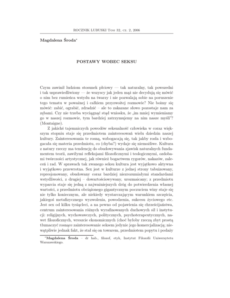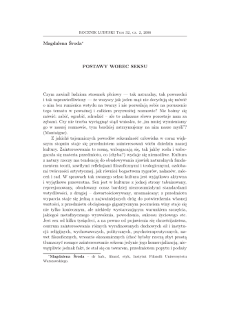 ROCZNIK LUBUSKI Tom 32, cz. 2, 2006 Magdalena Środa∗ POSTAWY WOBEC SEKSU Czym zawinił ludziom stosunek płciowy — tak naturalny, tak powszedni i tak usprawiedliwiony — że wszyscy jak jeden mąż nie decydują się mówić o nim bez rumieńca wstydu na twarzy i nie pozwalają sobie na poruszenie tego tematu w poważnej i całkiem przyzwoitej rozmowie? Nie boimy się mówić: zabić, ograbić, zdradzić – ale to zakazane słowo pozostaje nam za zębami. Czy nie trzeba wyciągnąć stąd wniosku, że „im mniej wymieniamy go w naszej rozmowie, tym bardziej zatrzymujemy na nim nasze myśli”? (Montaigne). Z jakichś tajemniczych powodów seksualność człowieka w coraz większym stopniu staje się przedmiotem zainteresowań wielu dziedzin naszej kultury. Zainteresowania te rosną, wzbogacają się, tak jakby rosła i wzbogacała się materia przedmiotu, co (chyba?) wydaje się niemożliwe. Kultura z natury rzeczy ma tendencję do obudowywania zjawisk naturalnych fundamentem teorii, zawiłymi refleksjami filozoficznymi i teologicznymi, ozdobami twórczości artystycznej, jak również bogactwem rygorów, nakazów, zaleceń i rad. W sprawach tak zwanego seksu kultura jest wyjątkowo aktywna i wyjątkowo przewrotna. Sex jest w kulturze z jednej strony tabuizowany, represjonowany, obudowany coraz bardziej niezrozumiałymi standardami wstydliwości, z drugiej – dowartościowywany, urozmaicany; z przedmiotu wyparcia staje się jedną z najważniejszych dróg do potwierdzenia własnej wartości, z przedmiotu obciążonego gigantycznym poczuciem winy staje się nie tylko koniecznym, ale niekiedy wystarczającym warunkiem szczęścia, jakiegoś metafizycznego wyzwolenia, powodzenia, sukcesu życiowego etc. Jest sex od kilku tysiącleci, a na pewno od pojawienia się chrześcijaństwa, centrum zainteresowania różnych wyrafinowanych duchowych sił i instytucji: religijnych, wychowawczych, politycznych, psychoterapeutycznych, nawet filozoficznych, wreszcie ekonomicznych (choć byłoby rzeczą zbyt prostą tłumaczyć rosnące zainteresowanie seksem jedynie jego komercjalizacją; niewątpliwie jednak fakt, że stał się on towarem, przedmiotem popytu i podaży ∗ Magdalena Środa – dr hab., filozof, etyk, Instytut Filozofii Uniwersytetu Warszawskiego. 62 Magdalena ŚRODA i że wiąże się on z rozwijającym przemysłem jest również znaczący dla jego popularności, w znacznie większym stopniu niż — jak sądzę — ludzkie potrzeby w tej dziedzinie). Seksualność jest więc potrzebą, cechą, umiejętnością, zasługą, produktem, marzeniem, wartością, wreszcie grzechem, cierpieniem, winą (a nawet chyba elementem jakichś dziwacznych ontologii). W Polsce temat to szczególny. Jego szczególność polega na tym, że jest on prawie zupełnie wypychany poza obręb racjonalnego namysłu. I gdy świat (na przykład w osobie wielce popularnego filozofa M. Faucault) mówi o erotyzacji kultury w najgłębszym sensie tego słowa, w Polsce można raczej mówić o nasileniu represji antyseksualnych i to o tyle przykrym, że bezbarwnym i bezmyślnym (gdzież im bowiem do ciekawych form represji średniowiecznych czy ideologicznego seksualnego rygoryzmu czasów Robespierre’a). Hasło rodzimej represywności brzmi banalnie, choć agresywnie: poświęcić rzetelną wiedzę dla rzekomej cnoty. Nie po raz pierwszy stawiam pytanie, dlaczego wśród tak bardzo różnorodnego zła tkwiącego w otaczającej nas rzeczywistości, wśród cierpień, nieszczęść, wojen, biedy, braku uczciwości, wśród nadmiaru przemocy, agresji, głupoty, fanatyzmu, nietolerancji, pogardy, etc. właśnie seksualność stanowi szczególny temat zainteresowania kleru i zarazem temat aktywizujący fascynację i jakąś formę nienawiści. Dlaczego – co widoczne było na niedawnej konferencji demograficznej w Kairze i obecnej w Pekinie – państwo Watykan, a więc państwo o zerowym przyroście naturalnym, ma tak wiele do powiedzenia w sprawach płci, kobiet, rodziny, macierzyństwa i demografii w ogólności? Odpowiedzi jest, rzecz jasna, kilka. Pierwsza to odpowiedź teologiczna. Wskazuje ona na mit grzechu pierworodnego. „Byli nadzy, a nie wstydzili się”. Nie dlatego – interpretuje św. Augustyn – „iż nie znali swojej nagości, lecz dlatego, że nagość nie była jeszcze nieprzyzwoita, lubieżność nie pobudzała jeszcze owych członków wbrew ludzkiej woli. [. . . ] Kiedy łaskę utracili, wówczas, aby nieposłuszeństwo ich odwzajemnione było odpowiednią karą, w odruchach ciała ich zjawiło się coś nowego a wszetecznego, co uczyniło nagość nieprzystojną”. „Nie ma grzechu, który by tak nie podobał się Jezusowi Chrystusowi jak grzech ciała”, „ten występek sprawia najwięcej przyjemności diabłu albowiem jest to najbardziej powabny i najskuteczniejszy początek”. Odpowiedź drugą dają feministki. U źródeł rygoryzmu chrześcijańskiego wobec seksu stoi obsesyjny antyfemiznizm. Dzieje chrześcijaństwa to, z pewnego punktu widzenia, dzieje rosnącej dominacji mężczyzn, patriarchalizacji kultury i, zarazem, dzieje uwsteczniania się pozycji kobiety (np. wobec roli jaką pełniła ona w Rzymie). Z reguły wymagania moralne wobec POSTAWY WOBEC SEKSU 63 kobiet były znacznie większe niż wobec mężczyzn. Znacznie większej kontroli poddawana była i obyczajność, i seksualność kobieca. Kobieta jest bowiem uważana za istotę słabą, gorszą, podporządkowaną mężczyźnie, nastawioną na zaspokojenie zmysłowe, zdradliwą. Z nieufności i pogardy do kobiety wynikał nakaz trzymania jej w stanie podległości. Pierre de la Fonta, średniowieczny kaznodzieja, komentując wesele w Kanie Galilejskiej, pisze: „Nie bez racji wydało się apostołom czymś zbyt uciążliwym i przykrym trzymać przy sobie niewiastę. . . pełną rozwiązłości i przywar; żywić w swym domu tego nieprzyjaciela spokoju domowego. . . , cierpieć popędliwości, dziwactwa lub szale