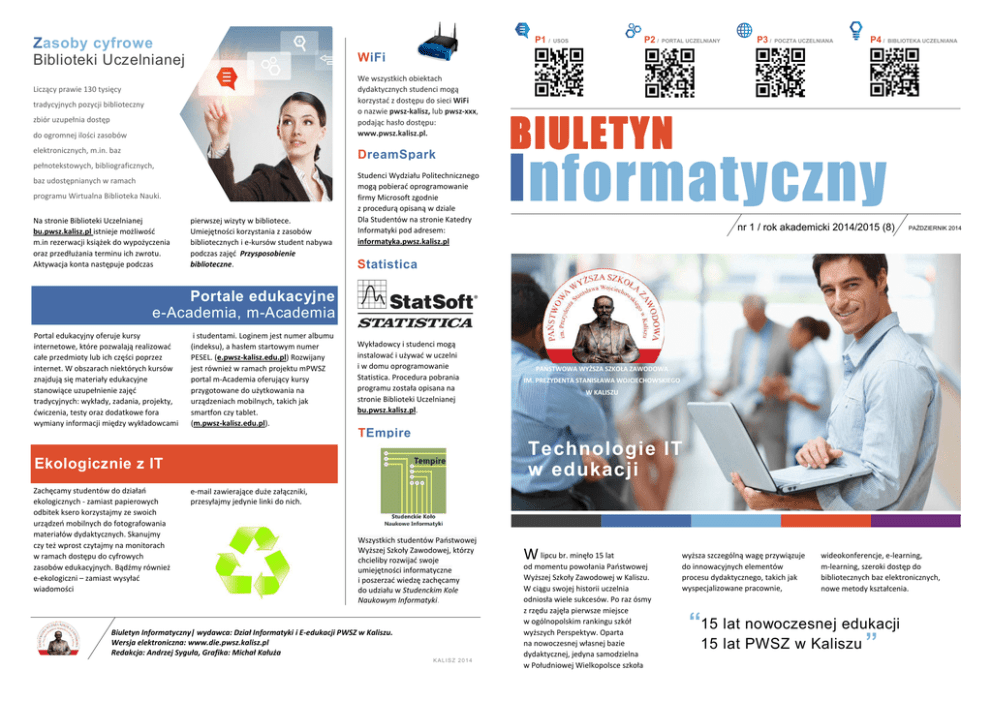 P1 / Zasoby cyfrowe Biblioteki Uczelnianej PORTAL UCZELNIANY P3 / POCZTA UCZELNIANA P4 / BIBLIOTEKA UCZELNIANA WiFi We wszystkich obiektach dydaktycznych studenci mogą korzystać z dostępu do sieci WiFi o nazwie pwsz-kalisz, lub pwsz-xxx, podając hasło dostępu: www.pwsz.kalisz.pl. Liczący prawie 130 tysięcy tradycyjnych pozycji biblioteczny zbiór uzupełnia dostęp do ogromnej ilości zasobów elektronicznych, m.in. baz DreamSpark pełnotekstowych, bibliograficznych, baz udostępnianych w ramach programu Wirtualna Biblioteka Nauki. Na stronie Biblioteki Uczelnianej bu.pwsz.kalisz.pl istnieje możliwość m.in rezerwacji książek do wypożyczenia oraz przedłużania terminu ich zwrotu. Aktywacja konta następuje podczas P2 / USOS pierwszej wizyty w bibliotece. Umiejętności korzystania z zasobów bibliotecznych i e-kursów student nabywa podczas zajęć Przysposobienie biblioteczne. Studenci Wydziału Politechnicznego mogą pobierać oprogramowanie firmy Microsoft zgodnie z procedurą opisaną w dziale Dla Studentów na stronie Katedry Informatyki pod adresem: informatyka.pwsz.kalisz.pl BIULETYN Informatyczny nr 1 / rok akademicki 2014/2015 (8) PAŹDZIERNIK 2014 . Statistica Portale edukacyjne e-Academia, m-Academia Portal edukacyjny oferuje kursy internetowe, które pozwalają realizować całe przedmioty lub ich części poprzez internet. W obszarach niektórych kursów znajdują się materiały edukacyjne stanowiące uzupełnienie zajęć tradycyjnych: wykłady, zadania, projekty, ćwiczenia, testy oraz dodatkowe fora wymiany informacji między wykładowcami i studentami. Loginem jest numer albumu (indeksu), a hasłem startowym numer PESEL. (e.pwsz-kalisz.edu.pl) Rozwijany jest również w ramach projektu mPWSZ portal m-Academia oferujący kursy przygotowane do użytkowania na urządzeniach mobilnych, takich jak smartfon czy tablet. (m.pwsz-kalisz.edu.pl). Wykładowcy i studenci mogą instalować i używać w uczelni i w domu oprogramowanie Statistica. Procedura pobrania programu została opisana na stronie Biblioteki Uczelnianej bu.pwsz.kalisz.pl. TEmpire IM. PREZYDENTA STANISŁAWA WOJCIECHOWSKIEGO W KALISZU Technologie IT w edukacji Ekologicznie z IT Zachęcamy studentów do działań ekologicznych - zamiast papierowych odbitek ksero korzystajmy ze swoich urządzeń mobilnych do fotografowania materiałów dydaktycznych. Skanujmy czy też wprost czytajmy na monitorach w ramach dostępu do cyfrowych zasobów edukacyjnych. Bądźmy również e-ekologiczni – zamiast wysyłać wiadomości PAŃSTWOWA WYŻSZA SZKOŁA ZAWODOWA e-mail zawierające duże załączniki, przesyłajmy jedynie linki do nich. Wszystkich studentów Państwowej Wyższej Szkoły Zawodowej, którzy chcieliby rozwijać swoje umiejętności informatyczne i poszerzać wiedzę zachęcamy do udziału w Studenckim Kole Naukowym Informatyki. Biuletyn Informatyczny| wydawca: Dział Informatyki i E-edukacji PWSZ w Kaliszu. Wersja elektroniczna: www.die.pwsz.kalisz.pl Redakcja: Andrzej Syguła, Grafika: Michał Kałuża KALISZ 2014 W lipcu br. minęło 15 lat od momentu powołania Państwowej Wyższej Szkoły Zawodowej w Kaliszu. W ciągu swojej historii uczelnia odniosła wiele sukcesów. Po raz ósmy z rzędu zajęła pierwsze miejsce w ogólnopolskim rankingu szkół wyższych Perspektyw. Oparta na nowoczesnej własnej bazie dydaktycznej, jedyna samodzielna w Południowej Wielkopolsce szkoła wyższa szczególną wagę przywiązuje do innowacyjnych elementów procesu dydaktycznego, takich jak wyspecjalizowane pracownie, wideokonferencje, e-learning, m-learning, szeroki dostęp do bibliotecznych baz elektronicznych, nowe metody kształcenia. “15 lat nowoczesnej edukacji 15 lat PWSZ w Kaliszu ” Strefa IT Studenta Tw ój kontakt z uczelnią - konto pocztowe studenta Strefa IT studenta obejmuje: konto pocztowe w domenie uczelnianej, dostęp do wirtualnego dziekanatu – USOSweb, dostęp do e-Academii, konto biblioteczne, portal uczelniany, portale społecznościowe uczelni. Warto pamiętać, że do wszystkich informacji i portali uczelnianych dotrzeć można ze strony głównej: pwsz.kalisz.pl. Zachęcamy do czynnego udziału w życiu akademickim, studiowania i odkrywania świata. Technologie stosowane w nauczaniu, nowoczesna baza dydaktyczna, kontakt z uznanymi naukowcami oraz szereg nowatorskich projektów realizowanych w kaliskiej PWSZ stwarza studentom wielką szansę na osiągnięcie globalnych sukcesów. Jesteśmy przecież w najlepszej profesjonalnej uczelni w Polsce! Bądźmy zatem z tego DUMNI, a w naszych działaniach OTWARCI i KREATYWNI. Zapraszamy do udziału w uczelnianych projektach oraz pracach kół naukowych. Do kontaktów uczelnianych konieczne jest posługiwanie się przez studenta kontem pocztowym w domenie edukacyjnej PWSZKALISZ.EDU.PL. Struktura konta wygląda następująco: [email protected], gdzie 99999 jest numerem albumu (indeksu). Logowanie do konta e-mail odbywa się w serwisie, do którego można trafić ze strony głównej uczelni pwsz.kalisz.pl link Poczta uczelniana (lub bezpośrednio na stronie login.microsoftonline.com. Jako login należy podać swój uczelniany adres e-mail, hasłem startowym jest numer PESEL. Hasło po zalogowaniu należy zmienić. P5 / STRONA GŁÓWNA P6 / E-ACADEMIA P7 / M-AKADEMIA P8 / FACEBOOK P9 / FACEBOOK BIBLIOTEKI IBUK stwarza studentom wielką szansę “ PWSZ na osiągnięcie globalnych sukcesów.” Portal uczelniany zawiera strony wydziałowe, informacje z dziekanatów, harmonogram roku akademickiego, regulamin studiów, statut uczelni. Student znajdzie tutaj wiele wiadomości związanych z życiem studenckim, fora wymiany informacji, czaty, a także bazę kontaktów. Portal działa również w wersji mobilnej. (pwsz-kalisz.edu.pl) Baza ibuk zawiera pełne teksty ponad 600 książek naukowych, w tym podręczników akademickich wydanych przez Wydawnictwo Naukowe PWN i wydawnictwa uczelniane. Baza dostępna jest w sieci Uczelni, z komputerów czytelni 