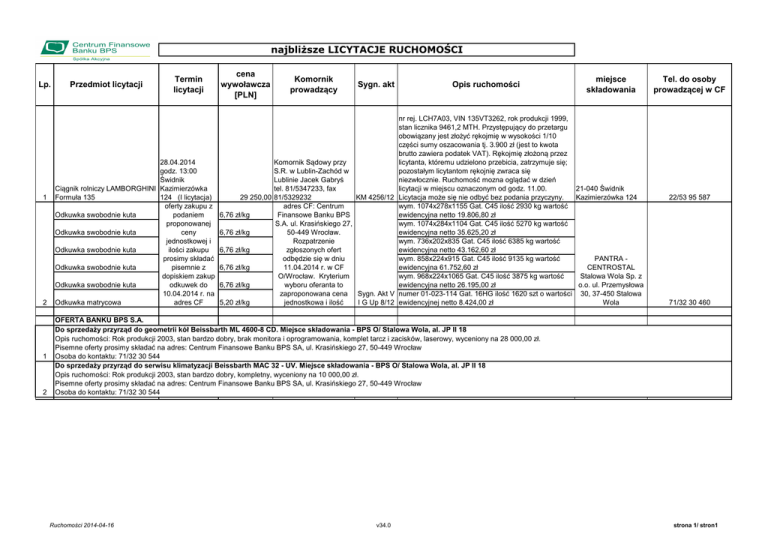 najbliższe LICYTACJE RUCHOMOŚCI Lp. 1 2 1 2 Przedmiot licytacji Termin licytacji cena wywoławcza [PLN] Komornik prowadzący Sygn. akt Opis ruchomości miejsce składowania nr rej. LCH7A03, VIN 135VT3262, rok produkcji 1999, stan licznika 9461,2 MTH. Przystępujący do przetargu obowiązany jest złożyć rękojmię w wysokości 1/10 części sumy oszacowania tj. 3.900 zł (jest to kwota brutto zawiera podatek VAT). Rękojmię złożoną przez 28.04.2014 Komornik Sądowy przy licytanta, któremu udzielono przebicia, zatrzymuje się; godz. 13:00 S.R. w Lublin-Zachód w pozostałym licytantom rękojnię zwraca się Świdnik Lublinie Jacek Gabryś niezwłocznie. Ruchomość mozna oglądać w dzień tel. 81/5347233, fax licytacji w miejscu oznaczonym od godz. 11.00. 21-040 Świdnik Ciągnik rolniczy LAMBORGHINI Kazimierzówka Formuła 135 124 (I licytacja) 29 250,00 81/5329232 KM 4256/12 Licytacja może się nie odbyć bez podania przyczyny. Kazimierzówka 124 adres CF: Centrum oferty zakupu z wym. 1074x278x1155 Gat. C45 ilość 2930 kg wartość Finansowe Banku BPS podaniem Odkuwka swobodnie kuta 6,76 zł/kg ewidencyjna netto 19.806,80 zł S.A. ul. Krasińskiego 27, proponowanej wym. 1074x284x1104 Gat. C45 ilość 5270 kg wartość ceny 50-449 Wrocław. Odkuwka swobodnie kuta 6,76 zł/kg ewidencyjna netto 35.625,20 zł Rozpatrzenie jednostkowej i wym. 736x202x835 Gat. C45 ilość 6385 kg wartość zgłoszonych ofert ilości zakupu Odkuwka swobodnie kuta 6,76 zł/kg ewidencyjna netto 43.162,60 zł odbędzie się w dniu prosimy składać PANTRA wym. 858x224x915 Gat. C45 ilość 9135 kg wartość pisemnie z 11.04.2014 r. w CF CENTROSTAL Odkuwka swobodnie kuta 6,76 zł/kg ewidencyjna 61.752,60 zł O/Wrocław. Kryterium dopiskiem zakup Stalowa Wola Sp. z wym. 968x224x1065 Gat. C45 ilość 3875 kg wartość wyboru oferanta to odkuwek do o.o. ul. Przemysłowa Odkuwka swobodnie kuta 6,76 zł/kg ewidencyjna netto 26.195,00 zł zaproponowana cena Sygn. Akt V numer 01-023-114 Gat. 16HG ilość 1620 szt o wartości 30, 37-450 Stalowa 10.04.2014 r. na jednostkowa i ilość adres CF Wola I G Up 8/12 ewidencyjnej netto 8.424,00 zł Odkuwka matrycowa 5,20 zł/kg Tel. do osoby prowadzącej w CF 22/53 95 587 71/32 30 460 OFERTA BANKU BPS S.A. Do sprzedaży przyrząd do geometrii kół Beissbarth ML 4600-8 CD. Miejsce składowania - BPS O/ Stalowa Wola, al. JP II 18 Opis ruchomości: Rok produkcji 2003, stan bardzo dobry, brak monitora i oprogramowania, komplet tarcz i zacisków, laserowy, wyceniony na 28 000,00 zł. Pisemne oferty prosimy składać na adres: Centrum Finansowe Banku BPS SA, ul. Krasińskiego 27, 50-449 Wrocław Osoba do kontaktu: 71/32 30 544 Do sprzedaży przyrząd do serwisu klimatyzacji Beissbarth MAC 32 - UV. Miejsce składowania - BPS O/ Stalowa Wola, al. JP II 18 Opis ruchomości: Rok produkcji 2003, stan bardzo dobry, kompletny, wyceniony na 10 000,00 zł. Pisemne oferty prosimy składać na adres: Centrum Finansowe Banku BPS SA, ul. Krasińskiego 27, 50-449 Wrocław Osoba do kontaktu: 71/32 30 544 Ruchomości 2014-04-16 v34.0 strona 1/ stron1 najbliższe LICYTACJE NIERUCHOMOŚCI Lp. 1 2 3 4 Przedmiot licytacji Termin licytacji cena wywoławcza [PLN] Komornik prowadzący Sygn. akt Opis nieruchomości Położenie Działka gruntowa nr 19/32 o powierzchni 0,0049 ha zabudowana segmentem garażu murowanego własność dłużnika Partyka Jerzy. Przystępujący do licytacji zobowiązany jest wpłacić rękojmię w wysokości 1/10 sumy oszacowania tj. 1690,40 zł najpóźniej do Tarnów ul. dnia poprzedzającego dzień licytacji. Elektryczna Działka gruntowa niezabudowana nr 21 o powierzchni 0,3732 ha własność dłużnika Partyka Jerzy. Przystępujący do licytacji zobowiązany jest wpłacić rękojmię w wysokości 1/10 sumy oszacowania tj. 7202,80 zł najpóźniej do dnia poprzedzającego dzień licytacji. Tarnów ul. Środkowa Nieruchomość KW nr TR1T/00067994/7 24.04.2014 godz. 11:00 SR Wydział Cywilny Tarnów (I licytacja) Komornik Sądowy przy Sądzie Rejonowym w Tarnowie Robert 12 678,00 Iwanicki tel. 14/6569988 KM 743/13 Nieruchomość KW nr TR1T/00062830/5 24.04.2014 godz. 11:00 SR Wydział Cywilny Tarnów (I licytacja) Komornik Sądowy przy Sądzie Rejonowym w Tarnowie Robert 54 021,00 Iwanicki tel. 14/6569988 KM 743/13 25.04.2014 (II licytacja) Komornik Sądowy przy Sądzie Rejonowym w Zamościu Dariusz Kułaj Działka gruntu nr 387/1 o pow. 4,05 ha (udział do 3/16 ul. Hrubieszowska 34C części) zabudowana budynkiem mieszkalnym i Czołki 17 400,00 22-400 Zamość II KM 505/13 budynkami gospodarczymi gm. Sitno Nieruchomość KW nr ZA1Z/00006820/2 Nieruchomość KW nr SW1Z/00052218/1 Nieruchomości 2014-04-16 28.04.2014 godz. 12:00 SR w Ząbkowicach Śląskich ul. Świerkowa 1 sala nr 21 (II licytacja) Komornik Sądowy przy Sądzie Rejonowym w Ząbkowicach Śląskich Marek Kupść tel. 507 934,00 74/8154494 Działki nr 267/7 i 267/2 o łącznej powierzchni 0,6649 ha zabudowane dwoma budynkami magazynowymi stanowiącymi własność Stigo Trading Sp. z o.o. w Przyłęku. Licytant przystępujący do przetargu powinien złożyć rękojmię w wysokości 1/10 sumy oszacowania to jest 76 190 zł najpóźniej w dniu poprzedzającym przetarg. W ciągu dwóch ostatnich tygodni przed licytacją wolno oglądać nieruchomość w dni powszednie od godz. 10:00 do godz. 14:00 oraz przeglądać w kancelaeri komornika odpis protokółu oszacowania nieruchomości, operat szacunkowy biegłęgo sądowego, wypis z rejestru gruntów wraz z Przyłęk ul. Główna KM 2003/13 mapką z akt postępowania egzekucyjnego. 16a v34.0 Tel. do osoby prowadzącej w CF 71/32 30 584 71/32 30 584 22/53 95 592 71/32 30 584 strona 1/ stron3 najbliższe LICYTACJE NIERUCHOMOŚCI Lp. 5 6 Przedmiot licytacji Nieruchomość KW nr KR2K/00056595/1 Nieruchomość KW nr KR2K/00054095/2 Nieruchomości 2014-04-16 Termin licytacji 06.05.2014 godz. 14:30 w SR dla Krakowa Krowodrzy ul. Przy Rondzie 7 sala nr D-123 (I licytacja) 0