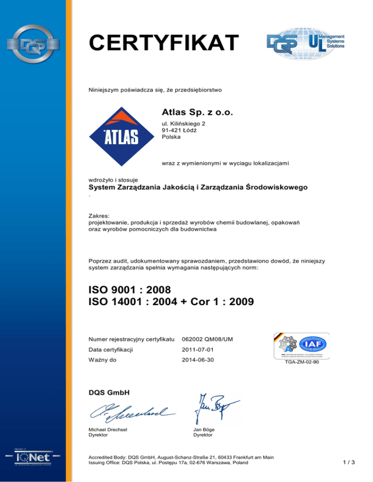 CERTYFIKAT Niniejszym poświadcza się, że przedsiębiorstwo Atlas Sp. z o.o. ul. Kilińskiego 2 91-421 Łódź Polska wraz z wymienionymi w wyciagu lokalizacjami wdrożyło i stosuje System Zarządzania Jakością i Zarządzania Środowiskowego . Zakres: projektowanie, produkcja i sprzedaż wyrobów chemii budowlanej, opakowań oraz wyrobów pomocniczych dla budownictwa Poprzez audit, udokumentowany sprawozdaniem, przedstawiono dowód, że niniejszy system zarządzania spełnia wymagania następujących norm: ISO 9001 : 2008 ISO 14001 : 2004 + Cor 1 : 2009 Numer rejestracyjny certyfikatu 062002 QM08/UM Data certyfikacji 2011-07-01 Ważny do 2014-06-30 DQS GmbH Michael Drechsel Dyrektor Jan Böge Dyrektor Accredited Body: DQS GmbH, August-Schanz-Straße 21, 60433 Frankfurt am Main Issuing Office: DQS Polska, ul. Postępu 17a, 02-676 Warszawa, Poland 1/3 Aneks do certyfikatu Numer rejestracyjny 062002 QM08/UM Atlas Sp. z o.o. ul. Kilińskiego 2 91-421 Łódź Polska Lokalizacja Zakres Atlas Sp. z o.o. ul. Kilińskiego 2, 91-421 Łódź Polska projektowanie, produkcja i sprzedaż wyrobów chemii budowlanej, opakowań oraz wyrobów pomocniczych dla budownictwa Centrala Atlas Sp. z o.o. ul. Stanisława Lema 21 80-126 Gdańsk Polska projektowanie, produkcja i sprzedaż wyrobów chemii budowlanej, opakowań oraz wyrobów pomocniczych dla budownictwa Atlas Sp. z o.o. Zakład Produkcyjny Piotrków Trybunalski ul. Wronia 61/63 97-300 Piotrków Trybunalski Polska projektowanie, produkcja i sprzedaż wyrobów chemii budowlanej oraz wyrobów pomocniczych dla budownictwa Atlas Sp. z o.o. Zakład Produkcyjny Bydgoszcz ul. Przemysłowa 32 85-758 Bydgoszcz Polska projektowanie, produkcja i sprzedaż wyrobów chemii budowlanej oraz wyrobów pomocniczych dla budownictwa Atlas Sp. z o.o. Zakład Produkcyjny Dąbrowa Górnicza ul. Roździeńskiego 2 41-306 Dąbrowa Górnicza Polska projektowanie, produkcja i sprzedaż wyrobów chemii budowlanej oraz wyrobów pomocniczych dla budownictwa Atlas Sp. z o.o. Zakład Produkcyjny Suwałki Dubowo II nr 33 16-400 Suwałki Polska projektowanie, produkcja i sprzedaż wyrobów chemii budowlanej oraz wyrobów pomocniczych dla budownictwa Niniejszy aneks (wydanie: 2011-07-01 ) jest ważny tylko w połączeniu z wyżej wymienionym certyfikatem. 2/3 Aneks do certyfikatu Numer rejestracyjny 062002 QM08/UM Atlas Sp. z o.o. ul. Kilińskiego 2 91-421 Łódź Polska Lokalizacja Zakres Atlas Sp. z o.o. Zakład Produkcyjny Niwnice Oddział Niwnice Niwnice 59-607 Lwówek Śląski Polska projektowanie, produkcja i sprzedaż wyrobów chemii budowlanej oraz wyrobów pomocniczych dla budownictwa Atlas Sp. z o.o. Zakład Produkcyjny Niwnice Oddział Gromadka Osła 1A 59-706 Gromadka Polska projektowanie, produkcja i sprzedaż wyrobów chemii budowlanej oraz wyrobów pomocniczych dla budownictwa WKiZB S.A. ul. Szczawińska 52 A 95-100 Zgierz Polska projektowanie, produkcja i sprzedaż wyrobów chemii budowlanej, opakowań oraz wyrobów pomocniczych dla budownictwa Niniejszy aneks (wydanie: 2011-07-01 ) jest ważny tylko w połączeniu z wyżej wymienionym certyfikatem. 3/3