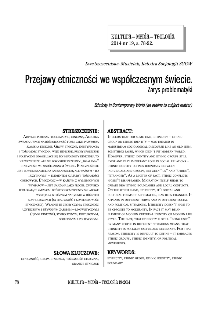 Kultura – Media – Teologia 2014 nr 19, s. 78-92. Ewa Szczecińska- Musielak, Katedra Socjologii SGGW Przejawy etniczności we współczesnym świecie. Zarys problematyki Ethnicity in Contemporary World (an outline to subject matter) STRESZCZENIE: ARTYKUŁ PORUSZA PROBLEMATYKĘ ETNICZNĄ. AUTORKA ZWRACA UWAGĘ NA RÓŻNORODNOŚĆ FORM, JAKIE PRZYJMUJĄ ZJAWISKA ETNICZNE. GRUPY ETNICZNE, IDENTYFIKACJA I TOŻSAMOŚĆ ETNICZNA, WIĘZI ETNICZNE, RUCHY SPOŁECZNE I POLITYCZNE ODWOŁUJĄCE SIĘ DO WSPÓLNOTY ETNICZNEJ, TO NAJWAŻNIEJSZE, ALE NIE WSZYSTKIE PRZEJAWY „DZIAŁANIA” ETNICZNOŚCI WE WSPÓŁCZESNYM ŚWIECIE. ETNICZNOŚĆ NIE JEST BOWIEM SKAMIELINĄ ANI SKANSENEM, ALE WAŻNYM - BO „UŻYWANYM” – ELEMENTEM KULTURY I TOŻSAMOŚCI GRUPOWYCH. ETNICZNOŚĆ – W KAŻDYM Z WYMIENIONYCH WYMIARÓW – JEST UKAZANA JAKO PROCES, ZJAWISKO PODLEGAJĄCE ZMIANOM, KTÓREGO KOMPONENTY SKŁADOWE WYSTĘPUJĄ W RÓŻNYM NATĘŻENIU W RÓŻNYCH KONFIGURACJACH (SYTUACYJNOŚĆ I KONTEKSTOWOŚĆ ETNICZNOŚCI). WŁAŚNIE TE CECHY CZYNIĄ ETNICZNOŚĆ UŻYTECZNYM I UŻYWANYM ZASOBEM – LINGWISTYCZNYM (JĘZYKI ETNICZNE), SYMBOLICZNYM, KULTUROWYM, SPOŁECZNYM I POLITYCZNYM. ABSTRACT: IT SEEMS THAT FOR SOME TIME, ETHNICITY – ETHNIC GROUP OR ETHNIC IDENTITY – WAS TREATED IN MAINSTREAM SOCIOLOGICAL DISCOURSE LIKE AN OLD ITEM, SOMETHING PASSÉ, WHICH DIDN’T FIT MODERN WORLD. HOWEVER, ETHNIC IDENTITY AND ETHNIC GROUPS STILL EXIST AND PLAY IMPORTANT ROLE IN SOCIAL RELATIONS – ETHNIC IDENTITY DEFINES BOUNDARY BETWEEN INDIVIDUALS AND GROUPS, BETWEEN “US” AND “OTHER”, “STRANGER”. AS A MATTER OF FACT, ETHNIC CONFLICTS HAVEN’T DISAPPEARED. MIGRATION ITSELF SEEMS TO CREATE NEW ETHNIC BOUNDARIES AND LOCAL CONFLICTS. ON THE OTHER HAND, ETHNICITY, IT’S SOCIAL AND CULTURAL FORMS OF AFFIRMATION, HAS BEEN CHANGED. IT APPEARS IN DIFFERENT FORMS AND IN DIFFERENT SOCIAL AND POLITICAL SITUATIONS. ETHNICITY DOESN’T HAVE TO BE OPPOSITE TO MODERNITY. IN FACT IT MAY BE AN ELEMENT OF MODERN CULTURAL IDENTITY OR MODERN LIFE STYLE. THE FACT, THAT ETHNICITY IS STILL “BEING USED” BY MANY PEOPLE IN DIFFERENT SITUATIONS MEANS, THAT ETHNICITY IS SOCIALLY USEFUL AND NECESSARY. REASON, ETHNICITY IS DIFFICULT TO DEFINE FOR THAT – IT EMBRACES ETHNIC GROUPS, ETHNIC IDENTITY, OR POLITICAL MOVEMENTS. SŁOWA KLUCZOWE: ETNICZNOŚĆ, GRUPA ETNICZNA, TOŻSAMOŚĆ ETNICZNA, GRANICE ETNICZNE 78 KEYWORDS: ETHNICITY, ETHNIC GROUP, ETHNIC IDENTITY, ETHNIC BOUNDARY Kultura – Media – Teologia 19/2014 E. Szczecińska-Musielak, Przejawy etniczności... P roblematyka etniczna już w latach 80. i 90. XX wieku była odsuwana na margines socjologicznego dyskursu - większe zainteresowanie badaczy budziła wówczas m.in. tematyka globalizacji. Wydaje się, że jest tak do dziś: problematyka etniczna nadal zajmuje marginalne miejsce w dyskursie publicznym i naukowym (nauki humanistyczne i społeczne). Etniczność jest postrzegana – także przez badaczy społecznych jako swoisty skansen, kulturowa skamielina, a w najlepszym przypadku jako nieco kłopotliwy spadek po (domniemanych) przodkach; jako pusty znaczeniowo zestaw rytuałów odprawianych dlatego, że tak „każe tradycja”. Z jednej strony dyskurs publiczny wydaje się zdominowany przez hasło - ideę integracji europejskiej, która miałaby zachodzić w ramach ponadnarodowych instytucji europejskich. Owa integracja jest różnie rozumiana – niekiedy jako idea, czasami jako wartość społeczna czy postawa, innym razem jako proces cywilizacyjny. Stąd łatwo o wartościowanie z tego punktu widzenia różnych zjawisk społecznych. To właśnie dotyczy zjawiska etniczności: tożsamość etniczna i interesy grup etnicznych i narodowych zaczynają być postrzegane jako potencjalne zagrożenie, jako zjawiska nie sprzyjające integracji, a sama etniczność staje się koncepcją wątpliwą, skoro podkreśla i afirmuje różnice i odmienności pomiędzy narodami Unii Europejskiej, także w sferze polityki i gospodarki („interesy narodowe”). Z drugiej strony, w ramach wspomnianych dyskursów, etniczność jest po goffmanowsku „piętnowana”; bywa przedstawiana (na przykład w polskiej prasie opiniotwórczej) w kontekście historycznych zjawisk antysemityzmu czy nacjonalizmu, ocenianych jednoznacznie jako negatywne. W tym ujęciu jest ona źródłem niebezpiecznych emocji, sentymentów (resentymentów), mogących prowadzić – w swej skrajnej formie – do agresywnych postaw i zachowań względem obcych, do nacjonalizmu i antysemityzmu właśnie. Stawianie etniczności w jednym lub drugim kontekście niepotrzebnie zawęża pole widzenia i badania zjawisk, definiowanych jako etniczne. Etniczność jest wciąż ważnym problemem społecznym i potrzebuje uważnego namysłu. Tendencje separatystyczne Katalonii czy Szkocji, nierozwiązany konflikt etniczny w Irlandii Północnej, konflikty etniczne i społeczne pomiędzy (licznymi) migrantami a społeczeństwami przyjmującymi (jak Wielka Brytania, Norwegia czy Francja) – to realne problemy współczesnej Europy. Badacze społeczni, szczególnie antropolodzy, zwracają uwagę na ogromną różnorodność sytuacji, w których jednostki i grupy „używają” wybranych elementów swojej tożsamości etnicznej, pokazując tym samym, że ów zasób, kapitał, jest współcześnie wciąż potrzebny i wykorzystywany. Etniczność nie jest passe, nie jest także – czy też nie musi być – nie-nowoczesna, sprzeczna z regułami i mechanizmami nowoczesności i ponowoczesności. Badacze społeczni i obserwatorzy życia publicznego zwracają uwagę na nowe konteksty, w jakich pojawia się etniczność. Myślę tutaj o – współbieżnych - procesach „upolitycznienia etniczności” i „etnicyzacji polityki”, powstawania i popularyzacji organizacji i partii politycznych odwołujących się do dziedzictwa etnicznego i narodowego, zbierających zwolenników i członków na zasadzie wspólnoty etnicznej i narodowej; 
