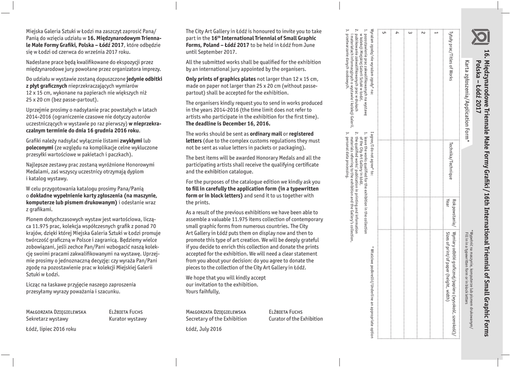 Łódź, lipiec 2016 roku Łódź, July 2016 Elżbieta Fuchs Curator of the Exhibition 16. Międzynarodowe Triennale Małe Formy Grafiki/16th International Triennial of Small Graphic Forms Polska – Łódź 2017 Małgorzata Dzięgielewska Secretary of the Exhibition Elżbieta Fuchs Kurator wystawy *Wypełnić na maszynie, komputerze lub pismem drukowanym/ Fill in in a typewritten form or in block letters Małgorzata Dzięgielewska Sekretarz wystawy Karta zgłoszenia/Application Form* We hope that you will kindly accept our invitation to the exhibition. Yours faihfully, Rok powstania/ Wymiary odbitki graficznej/papieru (wysokość, szerokość)/ Year Sizes of print/of paper (height, width) Licząc na łaskawe przyjęcie naszego zaproszenia przesyłamy wyrazy poważania i szacunku. Technika/Technique As a result of the previous exhibitions we have been able to assemble a valuable 11.975 items collection of contemporary small graphic forms from numerous countries. The City Art Gallery in Łódź puts them on display now and then to promote this type of art creation. We will be deeply grateful if you decide to enrich this collection and donate the prints accepted for the exhibition. We will need a clear statement from you about your decision: do you agree to donate the pieces to the collection of the City Art Gallery in Łódź. *Właściwe podkreślić/Underline an appropriate option Plonem dotychczasowych wystaw jest wartościowa, licząca 11.975 prac, kolekcja współczesnych grafik z ponad 70 krajów, dzięki której Miejska Galeria Sztuki w Łodzi promuje twórczość graficzną w Polsce i zagranicą. Będziemy wielce zobowiązani, jeśli zechce Pan/Pani wzbogacić naszą kolekcję swoimi pracami zakwalifikowanymi na wystawę. Uprzejmie prosimy o jednoznaczną decyzję: czy wyraża Pan/Pani zgodę na pozostawienie prac w kolekcji Miejskiej Galerii Sztuki w Łodzi. For the purposes of the catalogue edition we kindly ask you to fill in carefully the application form (in a typewritten form or in block letters) and send it to us together with the prints. Tytuły prac/Titles of Works W celu przygotowania katalogu prosimy Pana/Panią o dokładne wypełnienie karty zgłoszenia (na maszynie, komputerze lub pismem drukowanym) i odesłanie wraz z grafikami. The best items will be awarded Honorary Medals and all the participating artists shall receive the qualifying certificate and the exhibition catalogue. 1 Najlepsze zestawy prac zostaną wyróżnione Honorowymi Medalami, zaś wszyscy uczestnicy otrzymają dyplom i katalog wystawy. The works should be sent as ordinary mail or registered letters (due to the complex customs regulations they must not be sent as value letters in packets or packaging). 2 Grafiki należy nadsyłać wyłącznie listami zwykłymi lub poleconymi (ze względu na komplikacje celne wykluczone przesyłki wartościowe w pakietach i paczkach). The organisers kindly request you to send in works produced in the years 2014-2016 (the time limit does not refer to artists who participate in the exhibition for the first time). The deadline is December 16, 2016. 3 Uprzejmie prosimy o nadsyłanie prac powstałych w latach 2014-2016 (ograniczenie czasowe nie dotyczy autorów uczestniczących w wystawie po raz pierwszy) w nieprzekraczalnym terminie do dnia 16 grudnia 2016 roku. 4 Only prints of graphics plates not larger than 12 x 15 cm, made on paper not larger than 25 x 20 cm (without passepartout) shall be accepted for the exhibition. 5 Do udziału w wystawie zostaną dopuszczone jedynie odbitki z płyt graficznych nieprzekraczających wymiarów 12 x 15 cm, wykonane na papierach nie większych niż 25 x 20 cm (bez passe-partout). I agree/I do not agree* to: All the submitted works shall be qualified for the exhibition by an international jury appointed by the organisers. Wyrażam zgodę/nie wyrażam zgody* na: Nadesłane prace będą kwalifikowane do ekspozycji przez międzynarodowe jury powołane przez organizatora imprezy. 1. leave the works qualified for the exhibition in the collection of the City Art Gallery in Łódź, 2. the qualified works’ publication in printing and information materials referring to the exhibition and the Gallery’s collection, 3. personal data processing. The City Art Gallery in Łódź is honoured to invite you to take part in the 16th International Triennial of Small Graphic Forms, Poland – Łódź 2017 to be held in Łódź from June until September 2017. 1. pozostawienie prac zakwalifikowanych na wystawę w kolekcji Miejskiej Galerii Sztuki w Łodzi, 2. publikowanie zakwalifikowanych prac w drukach i materiałach informacyjnych o wystawie i kolekcji Galerii, 3. przetwarzanie danych osobowych. Miejska Galeria Sztuki w Łodzi ma zaszczyt zaprosić Pana/ Panią do wzięcia udziału w 16. Międzynarodowym Triennale Małe Formy Grafiki, Polska – Łódź 2017, które odbędzie się w Łodzi od czerwca do września 2017 roku. Ważniejsze wystawy i nagrody/Selected important exhibitions and awards Nazwa i rok ukończenia uczelni artystycznej/Art School attended; year of graduation Rok i miejsce urodzenia (miasto, kraj)/Year and place of birth (city, country) Adres/Address Narodowość/Nationality Nazwisko autora/Author’s family name Karta zgłoszenia/Application Form* E-mail Tel./fax Płeć/Sex Imiona/Names M F *Wypełnić na maszynie, komputerze lub pismem drukowanym/ Fill in in a typewritten form or in block letters 16. Międzynarodowe Triennale Małe Formy Grafiki/16th International Triennial of Small Graphic Forms Polska – Łódź 2017 small małe graphic formy forms grafiki 16th International Triennial of Small Graphic Forms Polska – Łódź 2017 16. Międzynarodowe Triennale Małe Formy Grafiki Polska – Łódź 2017 The City Art Gallery in Łódź Miejska Galeria Sztuki w Łodzi 44 H. Sienkiewicza St. 90-009 Łódź, Poland tel. (48 42) 674 10 59 fax: (48 42) 676 03 85 [email protected] www.mgslodz.pl ul. H. Sienkiewicza 44 90-009 Łódź