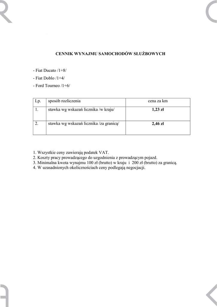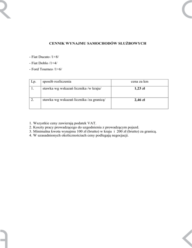 CENNIK WYNAJMU SAMOCHODÓW SŁUŻBOWYCH - Fiat Ducato /1+8/ - Fiat Doblo /1+4/ - Ford Tourneo /1+6/ Lp. sposób rozliczenia cena za km 1. stawka wg wskazań licznika /w kraju/ 1,23 zł 2. stawka wg wskazań licznika /za granicą/ 2,46 zł 1. Wszystkie ceny zawierają podatek VAT. 2. Koszty pracy prowadzącego do uzgodnienia z prowadzącym pojazd. 3. Minimalna kwota wynajmu 100 zł (brutto) w kraju i 200 zł (brutto) za granicą. 4. W uzasadnionych okolicznościach ceny podlegają negocjacji.
