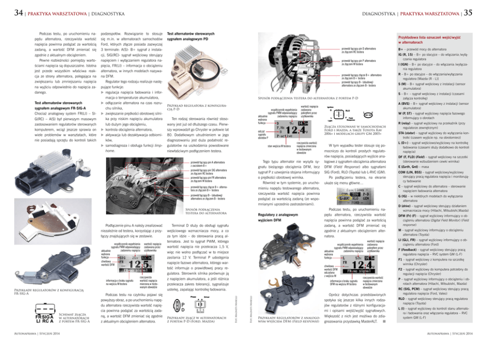 34 | PRAKTYKA WARSZTATOWA | DIAGNOSTYKA Podczas testu, po uruchomieniu napędu alternatora, rzeczywista wartość napięcia powinna podążać za wartością zadaną, a wartość DFM zmieniać się zgodnie z aktualnym obciążeniem. Pewne rozbieżności pomiędzy wartościami napięcia są dopuszczalne. Istotna jest przede wszystkim właściwa reakcja ze strony alternatora, polegająca na zwiększaniu lub zmniejszaniu napięcia na wyjściu odpowiednio do napięcia zadanego. Test alternatorów sterowanych sygnałem analogowym FR-SIG-A Chociaż analogowy system FR(LI) – SIG(RC) – A(S) był pierwszym masowym zastosowaniem regulatorów sterowanych komputerem, wciąż jeszcze sprawia on wiele problemów w warsztatach, które nie posiadają sprzętu do kontroli takich DIAGNOSTYKA | PRAKTYKA WARSZTATOWA | podzespołów. Rozwiązanie to stosuje się m.in. w alternatorach samochodów Ford, których złącze posiada zazwyczaj 3 terminale: A(S)- B+ sygnał z instalacji, SIG(RC)- sygnał wejściowy sterujący napięciem i wyłączaniem regulatora napięcia, FR(LI) – informacja o obciążeniu alternatora, w innych modelach nazywana DFM. Regulator tego rodzaju realizuje następujące funkcje: regulacja napięcia ładowania i informacja o temperaturze akumulatora, odłączanie alternatora na czas rozruchu silnika, zwiększanie prędkości obrotowej silnika przy niskim napięciu akumulatora lub dużym jego obciążeniu, kontrola obciążenia alternatora, aktywacja lub dezaktywacja odbiorników, samodiagnoza i obsługa funkcji limphome. Test alternatorów sterowanych sygnałem analogowym PD Przykładowa lista oznaczeń wejść/wyjść w alternatorach przewód łączący pin D alternatora ze złączem RC testera przewód łączący pin P alternatora ze złączem M testera przewód łączący złącze B+ alternatora ze złączem B+ testera przewód łączący B– (obudowę) alternatora ze złączem B– testera Przykład regulatora z konfiguracją P-D współczynnik wypełnienia sygnału PWM odpowiadający zadanemu napięciu aktualnie wybrana funkcja Ten rodzaj sterowania również stosowany jest już od dłuższego czasu. Pierwszy wprowadził go Chrysler w połowie lat 80. Dodatkowym utrudnieniem w jego diagnozowaniu jest duża podatność regulatorów na uszkodzenia powodowane niewłaściwym podłączeniem testera. stan wejścia M testera Tego typu alternator nie wysyła sygnału bieżącego obciążenia DFM, lecz sygnał P z uzwojenia stojana informujący o prędkości obrotowej wirnika. Również w tym systemie, po uruchomieniu napędu testowanego alternatora, rzeczywista wartość napięcia powinna podążać za wartością zadaną (ze wspomnianymi uprzednio zastrzeżeniami). przewód łączący złącze B+ alternatora ze złączem B+ testera przewód łączący B – (obudowę) alternatora ze złączem B – testera Sposób podłączenia testera do alternatora Przykłady regulatorów z konfiguracją FR-SIG-A Schemat złącza w alternatorach z portem FR-SIG-A Autonaprawa | Styczeń 2014 rzeczywista wartość napięcia mierzona w testowanym obwodzie Podczas testu na czytniku pojawi się powyższy obraz, a po uruchomieniu napędu alternatora rzeczywista wartość napięcia powinna podążać za wartością zadaną, a wartość DFM zmieniać się zgodnie z aktualnym obciążeniem alternatora. Terminal D służy do obsługi sygnału wejściowego wzmacniacza mocy, a co za tym idzie – do sterowania pracą alternatora. Jest to sygnał PWM, którego wartość napięcia nie przekracza 1,5 V, więc nie wolno podłączać w to miejsce zasilania 12 V. Terminal P udostępnia napięcie fazowe alternatora, którego wartość informuje o prawidłowej pracy regulatora. Sterownik silnika porównuje ją z napięciem akumulatora, a jeśli różnica przekracza zakres tolerancji, sygnalizuje usterkę, zapalając kontrolkę ładowania. Przykłady złącz w alternatorach z portem P-D (Ford, Mazda) Złącza stosowane w samochodach Ford i Mazda, a także Toyota Rav 2006+ i modelach grupy GM 2005+ W tym wypadku tester stosuje się pomocniczo do kontroli prostych regulatorów napięcia, posiadających wyjście analogowe z sygnałem obciążenia alternatora DFM (Field Response) albo sygnałami SIG (Ford), RLO (Toyota) lub L-RVC (GM). Po podłączeniu testera, na ekranie ukaże się menu główne… R – B+ po stacyjce – do włączania/wyłączania regulatora [Mazda (R - L)] S (M) – B+ sygnał wejściowy z instalacji (sensor akumulatora) R (relay) – sygnał wyjściowy na przekaźnik (przy regulatorze zewnętrznym) STA (stator) – sygnał wyjściowy do wyłączania kontrolki (czasem wyjście np. na obrotomierz) L (D+) – sygnał wejściowo/wyjściowy na kontrolkę ładowania (czasami służy dodatkowo do kontroli napięcia) DF (F, FLD) (Field) – sygnał wejściowy na szczotki (sterowanie wzbudzeniem cewki wirnika) E (Earth, Grd) – masa COM (LIN, BSS) – sygnał wejściowy/wyjściowy sterujący pracą regulatora napięcia i monitorujący ładowanie C – sygnał wejściowy do alternatora – sterowanie napięciem ładowania alternatora G (IG) – w niektórych modelach do wyłączania alternatora Podczas testu, po uruchomieniu napędu alternatora, rzeczywista wartość napięcia powinna podążać za wartością zadaną, a wartość DFM zmieniać się zgodnie z aktualnym obciążeniem alternatora. chwilowa wartość DFM odczytana z wejścia M informacja o braku sygnału DFM na wejściu M testera Przykłady regulatorów z analogowym wyjściem DFM (Field response) I (IGN) – B+ po stacyjce – do włączania /wyłączania regulatora W (P, ST) – sygnał wyjściowy napięcia fazowego informujący o obrotach współczynnik wypełnienia sygnału PWM odpowiadający zadanemu napięciu aktualnie wybrana funkcja Fot. Magneti Marelli informacja o braku sygnału na wejściu M testera wartość napięcia zadawana przez użytkownika Regulatory z analogowym wyjściem DFM Fot. Magneti Marelli współczynnik wypełnienia sy