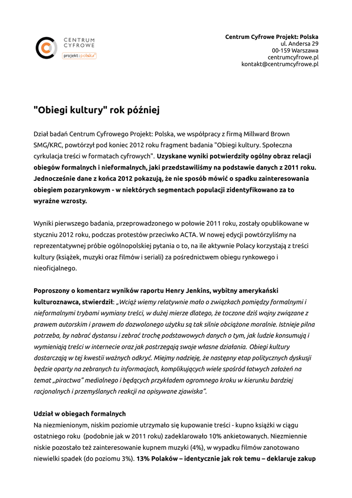 Centrum Cyfrowe Projekt: Polska ul. Andersa 29 00-159 Warszawa centrumcyfrowe.pl [email protected] "Obiegi kultury" rok później Dział badań Centrum Cyfrowego Projekt: Polska, we współpracy z firmą Millward Brown SMG/KRC, powtórzył pod koniec 2012 roku fragment badania "Obiegi kultury. Społeczna cyrkulacja treści w formatach cyfrowych". Uzyskane wyniki potwierdziły ogólny obraz relacji obiegów formalnych i nieformalnych, jaki przedstawiliśmy na podstawie danych z 2011 roku. Jednocześnie dane z końca 2012 pokazują, że nie sposób mówić o spadku zainteresowania obiegiem pozarynkowym - w niektórych segmentach populacji zidentyfikowano za to wyraźne wzrosty. Wyniki pierwszego badania, przeprowadzonego w połowie 2011 roku, zostały opublikowane w styczniu 2012 roku, podczas protestów przeciwko ACTA. W nowej edycji powtórzyliśmy na reprezentatywnej próbie ogólnopolskiej pytania o to, na ile aktywnie Polacy korzystają z treści kultury (książek, muzyki oraz filmów i seriali) za pośrednictwem obiegu rynkowego i nieoficjalnego. Poproszony o komentarz wyników raportu Henry Jenkins, wybitny amerykański kulturoznawca, stwierdził: „Wciąż wiemy relatywnie mało o związkach pomiędzy formalnymi i nieformalnymi trybami wymiany treści, w dużej mierze dlatego, że toczone dziś wojny związane z prawem autorskim i prawem do dozwolonego użytku są tak silnie obciążone moralnie. Istnieje pilna potrzeba, by nabrać dystansu i zebrać trochę podstawowych danych o tym, jak ludzie konsumują i wymieniają treści w internecie oraz jak postrzegają swoje własne działania. Obiegi kultury dostarczają w tej kwestii ważnych odkryć. Miejmy nadzieję, że następny etap politycznych dyskusji będzie oparty na zebranych tu informacjach, komplikujących wiele spośród łatwych założeń na temat „piractwa” medialnego i będących przykładem ogromnego kroku w kierunku bardziej racjonalnych i przemyślanych reakcji na opisywane zjawiska”. Udział w obiegach formalnych Na niezmienionym, niskim poziomie utrzymało się kupowanie treści - kupno książki w ciągu ostatniego roku (podobnie jak w 2011 roku) zadeklarowało 10% ankietowanych. Niezmiennie niskie pozostało też zainteresowanie kupnem muzyki (4%), w wypadku filmów zanotowano niewielki spadek (do poziomu 3%). 13% Polaków – identycznie jak rok temu – deklaruje zakup przynajmniej jednej książki, utworu muzycznego lub filmu. Udział w obiegach nieformalnych Na popularności straciło za to pożyczanie treści - zarówno od znajomych, jak i z instytucji publicznych, takich jak biblioteki. W wypadku książek odsetek osób pożyczających spadł z 15% do 12%, muzyki - z 7% do 6%, a filmów - z 9% do 7%. Trend spadkowy potwierdza fakt, że pożyczanie dowolnego z objętych badaniem typów treści deklaruje obecnie nieco ponad 15% - w porównaniu z 20% rok temu. Udział w nieformalnych obiegach cyfrowych (rozumianych jako pobieranie plików z sieci, korzystanie z treści w streamingu lub wymiana plikami na nośniku fizycznym) deklaruje 37% ankietowanych – 5% więcej niż przed rokiem. Jeśli doliczymy do tego inne formy pozarynkowego dostępu do treści, także w formatach analogowych (korzystanie z bibliotek, pożyczanie fizycznych egzemplarzy), to w obiegach nieformalnych uczestniczy 41% społeczeństwa. Obieg pozarynkowy ma już więc ponad trzykrotnie większy zasięg od rynkowego. „Fundacja Legalna Kultura zaprezentowała wyniki badań dowodzących, że znacząco wzrosła świadomość obywateli dotycząca legalności bądź nielegalności określanych sposobów pozyskiwania i korzystania z treści w Internecie. Wyniki naszego badania – wzrost skali uczestnictwa w obiegach nieformalnych – dowodzi, że nie przekłada się to na realne praktyki” – komentuje wynik badań dr Alek Tarkowski, dyrektor Centrum Cyfrowego Projekt: Polska. W większości kategorii uzyskane obecnie wyniki są takie same lub zbliżone do rezultatów z poprzedniej edycji badania, choć widoczny jest też niewielki trend wzrostowy, zwłaszcza wśród osób młodych. W roku 2012 pozarynkowe pobieranie filmów, seriali, muzyki lub książek ze stron internetowych, przy użyciu m.in. źródeł takich jak serwisy Chomikuj czy Rapidshare, zadeklarowało 28% internautów (w porównaniu do 25% w 2011). Popularność tego typu praktyk w grupie 15-24 lata wzrosła z poziomu 36% do 42%. Skala korzystania z serwisów peer-to-peer utrzymała się na poziomie 22%, a kopii rozpowszechnianych na fizycznych nośnikach (płyty, pendrive'y, przenośne dyski twarde) również nie zmieniła się w istotny sposób, utrzymując zasięg na poziomie 19%. Skala wzrostu zainteresowania pozarynkowymi formami dostępu do treści w formatach cyfrowych pokrywa się z procentowym spadkiem osób, które deklarują, że nie pozyskują w żaden sposób książek, muzyki ani filmów - w obu przypadkach zmiana wynosi 5%. Przy jednoczesnym braku istotnej zmiany procentu osób uczestniczących w wymianie rynkowej, stawiamy hipotezę, że osoby które sięgają po treści poza rynkiem, nie powodują strat - wcześniej nie były bowiem jego klientami. „Uzyskane wyniki potwierdzają tezę, że nie sposób o obiegu nieformalnym myśleć tylko i wyłącznie jako konkurencji czy zagrożeniu dla rynku. Jest on także narzędziem włączenia w praktyki czytania książek, selektywnego oglądania filmów i słuchania muzyki dla osób, które wcześniej nie tylko ich nie kupowały, ale w ogóle nie miały kontaktu z takimi treściami” – mówi dr Mirosław Filiciak, kierujący działem badań Centrum Cyfrowego. Transmisje sportowe w obiegach nieformalnych Bardzo wyraźny wzrost zainteresowania zanotowały serwisy umożliwiające darmowy dostęp do transmisji sportowych z telewizyjnych kanałów kodowanych - w pierwszym badaniu korzystanie z nich deklarowało 12% internautów, obecnie przeszło 19%. Wzrost najsilniej widoczny jest w kategoriach wiekowych 15-24