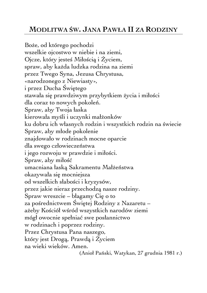 MODLITWA ŚW. JANA PAWŁA II ZA RODZINY Boże, od którego pochodzi wszelkie ojcostwo w niebie i na ziemi, Ojcze, który jesteś Miłością i Życiem, spraw, aby każda ludzka rodzina na ziemi przez Twego Syna, Jezusa Chrystusa, «narodzonego z Niewiasty», i przez Ducha Świętego stawała się prawdziwym przybytkiem życia i miłości dla coraz to nowych pokoleń. Spraw, aby Twoja łaska kierowała myśli i uczynki małżonków ku dobru ich własnych rodzin i wszystkich rodzin na świecie Spraw, aby młode pokolenie znajdowało w rodzinach mocne oparcie dla swego człowieczeństwa i jego rozwoju w prawdzie i miłości. Spraw, aby miłość umacniana łaską Sakramentu Małżeństwa okazywała się mocniejsza od wszelkich słabości i kryzysów, przez jakie nieraz przechodzą nasze rodziny. Spraw wreszcie – błagamy Cię o to za pośrednictwem Świętej Rodziny z Nazaretu – ażeby Kościół wśród wszystkich narodów ziemi mógł owocnie spełniać swe posłannictwo w rodzinach i poprzez rodziny. Przez Chrystusa Pana naszego, który jest Drogą, Prawdą i Życiem na wieki wieków. Amen. (Anioł Pański, Watykan, 27 grudnia 1981 r.)